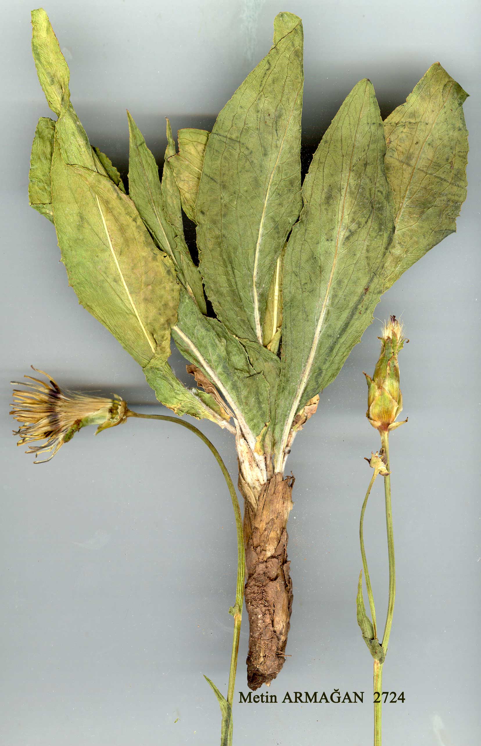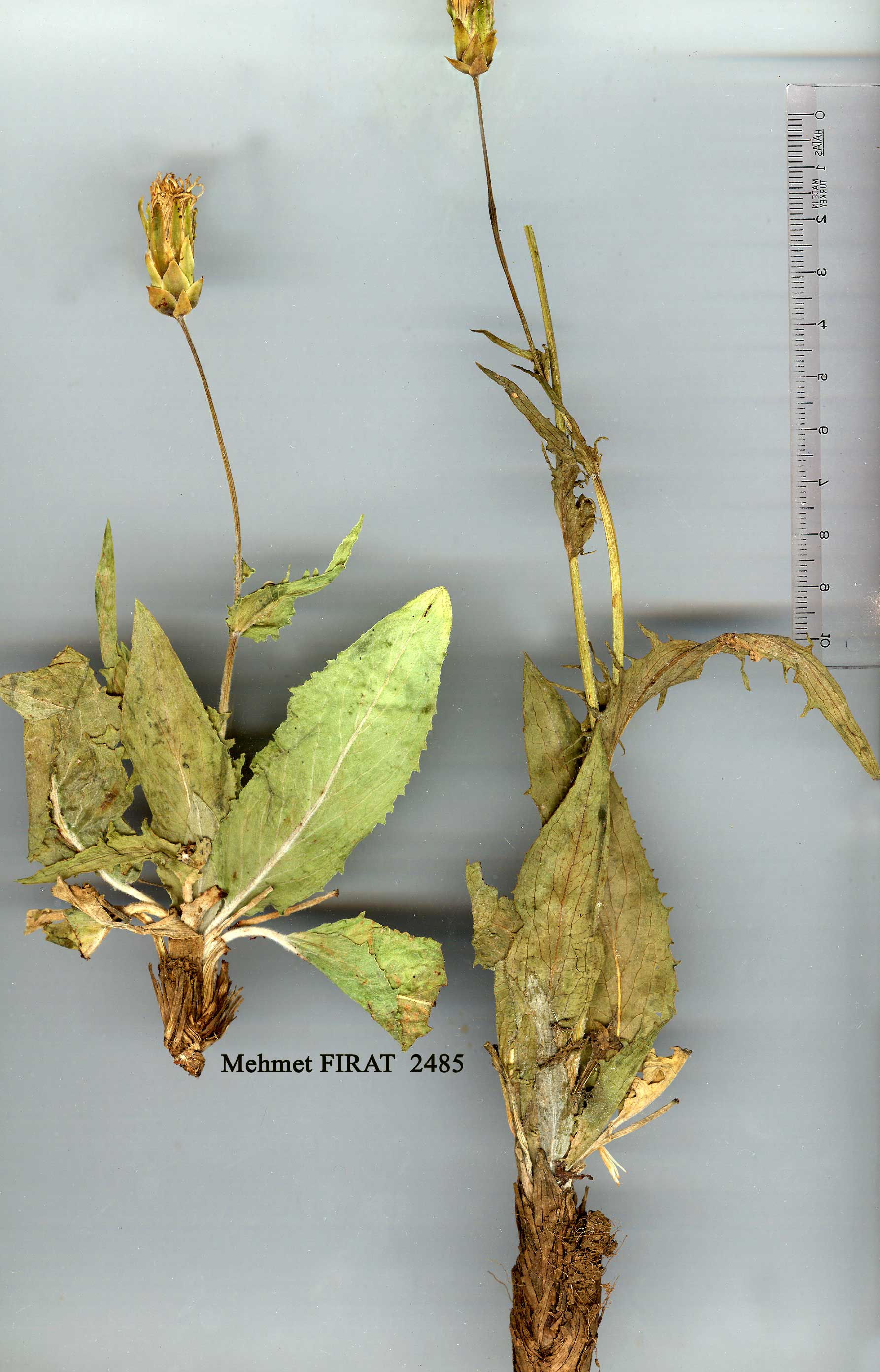 | S. incisa DC., Prodr. 7:119 (1838). Syn: S. bulbipes Boiss. & Hausskn. in Boiss., Fl. Or. 3:759 (1875)! S. bicolor Freyn & Sint. in Öst. Bot. Zeitschr. 43:266 (1892). Ic: Lipschitz, Fragm. Monogr. Gen. Scorz. 1: t. 38, 39 (1935). Figure 24, p. 639. Map 60, p. 649. Erect caulescent perennial, 25-40 cm; rootstock cylindrical, crowned by dead petiole remains. Basal leaves dentate to pinnatifid, 10-23 x 2.4-8 cm (incl. petiole); lamina narrowly to broadly elliptic in outline, irregularly and sparsely arachnoid-pubescent, usually abruptly contracted below into a 2-5 cm petiole. Stem leaves at most c. 1/2 size of basal leaves. Capitula l-2(-4) per stem, (35-)40-50 mm long. Inner phyllaries c. 25 mm. Flowers yellow with dark purple tube. Achenes 12-17 mm, deeply sulcate, with warty wings, sometimes swollen above base (galled) so appearing pyriform and stipitate, glabrous; pappus dirty white, hairs short and plumose or longer, barbellate above and plumose below. Fl. 5-7. Cultivated ground, grassy places, 450-2350 m. Type: [Turkey B7] in Cappadocia ad Euphratem, Aucher 3315 (holo. G-DC, photo! iso. K! P!). Mainly E. Anatolia. A7/8 Gümüşane: nr Gümüşane and Bayburt, Bourgeau. A9 Erzurum: Horasan, 1600 m, D. 29377! Kars: Karaurgan, 20 viii 1912, Lonaczevski. B6 Adana: 1 km S. of Bakirdağ to Saimbeyli pass, 1920 m, Hub.-Mor. 11280! B7 Erzincan: Egin (Kemaliye), Hoschneden, Sint. 1891:2312! Tunceli: 2 km N. of Pülümür to Mutu pass, 1710 m, Hub.-Mor. 16870! B9 Erzurum: Çakmak Da., above Karayasi, 2350 m, Watson et al. 1627! Van: Bendimahi, Erciş to Van, 1700 m, D. 44149! B10 Van: 3-4 km N.E. of Başkale, 2300 m, D. 44524! C7 Urfa: c. half-way from Viranşehir to Ceylanpinar, 450-500 m, D. 42309! Soviet Armenia, N.W. Iran, N. Iraq. Ir.-Tur. element. Closely allied to the Iranian S. calyculata Boiss. The species as here circumscribed is very variable, particularly in leaf shape and form of the achenes. S. bulbipes has swollen, apparently stipitate achenes due to an insect gall. |