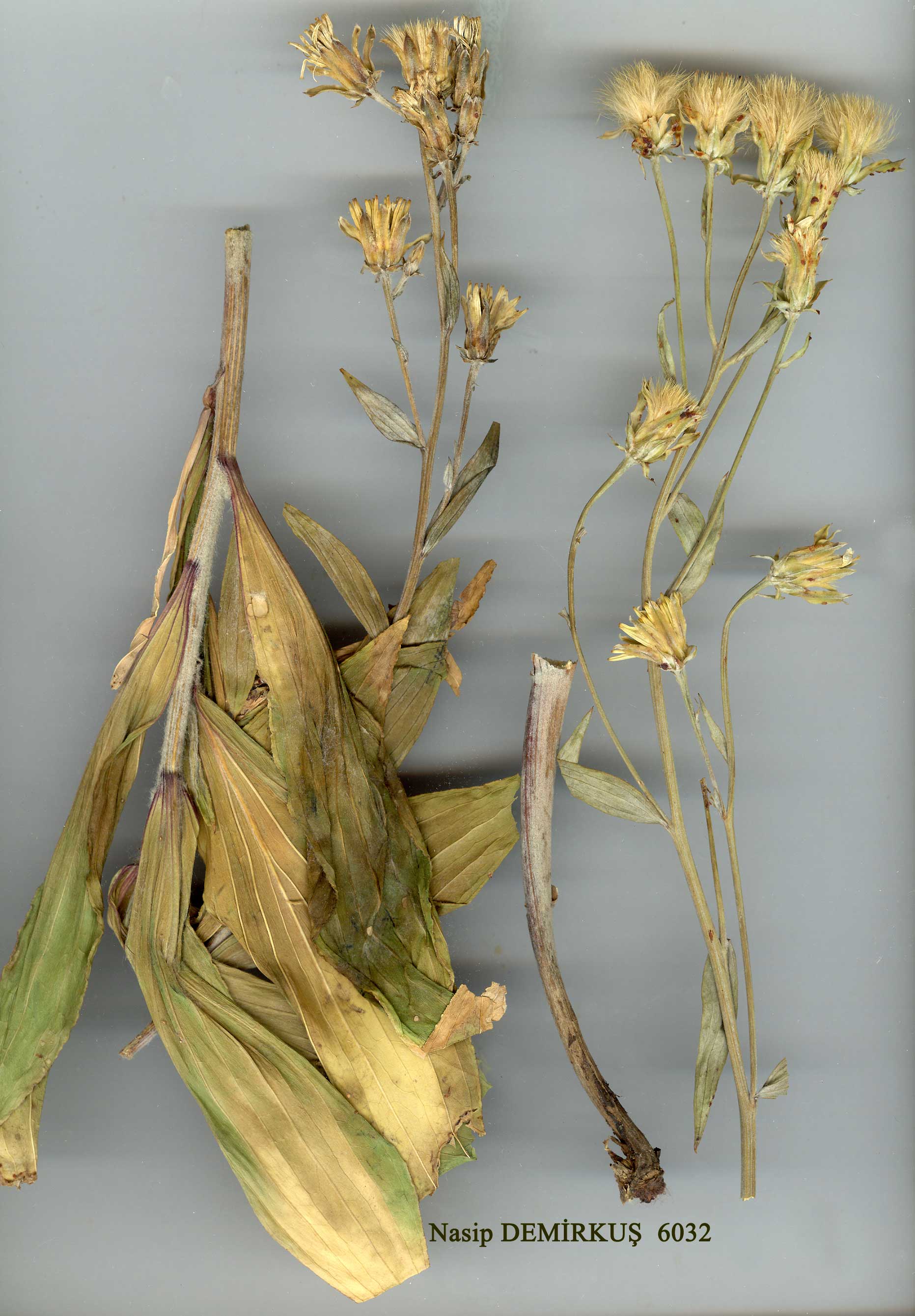 | S. mirabilis Lipschitz in Not. Syst. (Leningrad) 22:289 (1963). Erect caulescent perennial; stems c. 70 cm; rootstock unknown. Lower stem leaves elliptic-lanceolate, lamina c. 13 x 5 cm, sparsely villous, margin undulate, taping below into a c. 1.5 cm petiole, amplexicaul. Capitula many per stem, 13-17 mm long. Outer phyllaries c. 5 mm, villous; inner 12-15 mm, villous. Flowers pale yellow. Young achenes c. 5 mm, smooth, glabrous; pappus yellowish, hairs plumose. Fl. 8. Rocky slopes, c. 1700 m. Type: Turkey [C9] Hakkari, Cilo Dağ, Diz deresi, 1700 m, 6 viii 1954, Davis & O. Polunin, D. 23925 (holo. E!). Endemic. Ir.-Tur. element. Closely related to S. tomentosa but differing in its outer phyllaries, etc. Growing with S. veratrifolia (q.v.) from which it differs in its glabrous achenes. |