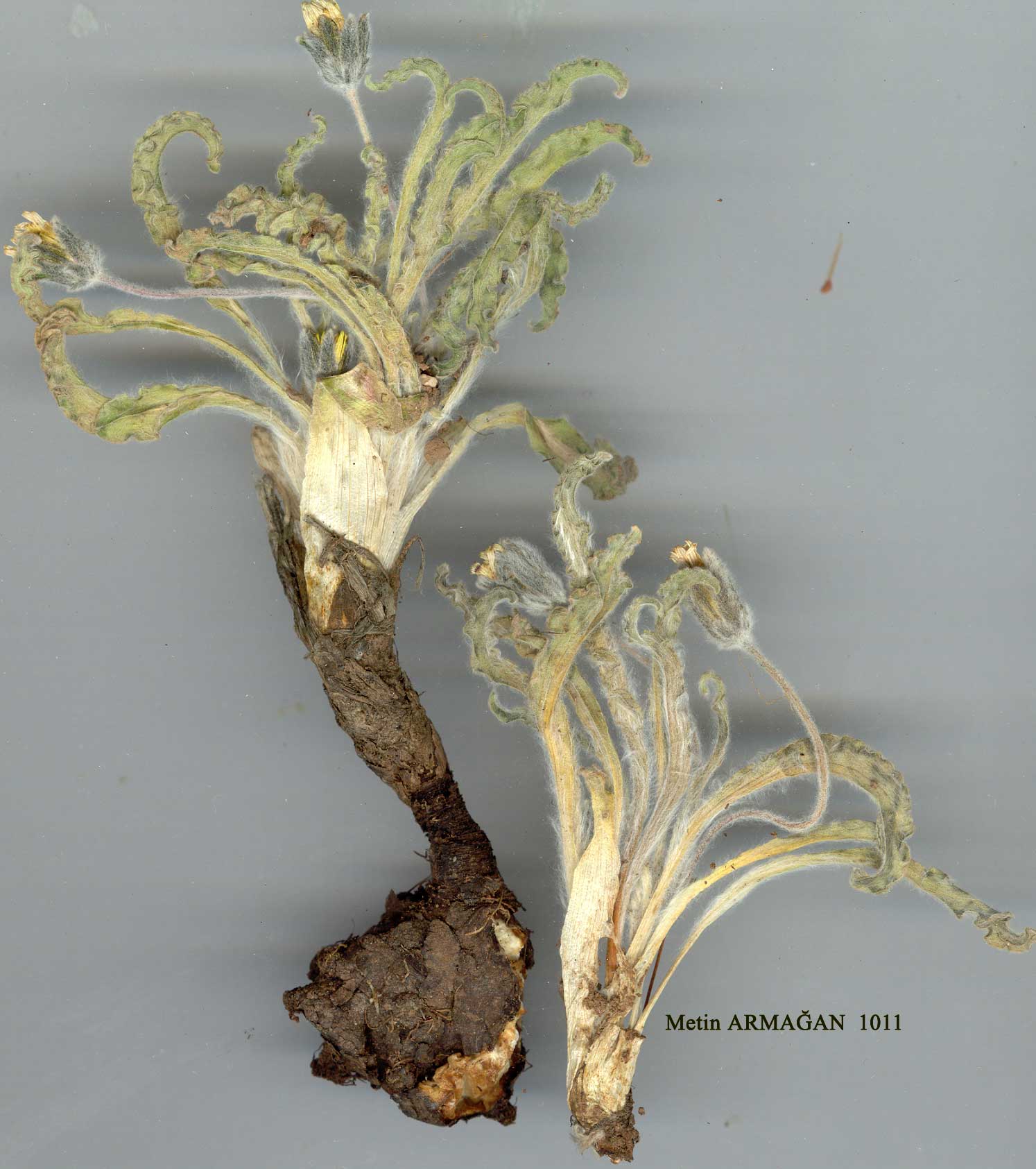 below into a tuber. Leaves entire, 6-10 x 0.8-1.5 cm, linear-lanceolate, densely lanate, contracted below into a petiole, margin ± undulate. Capitula 1 per stem, 11-16 mm. Inner phyllaries 11-16 mm, lanate and shortly black-hairy. Flowers yellow. Achenes c. 8 mm, densely lanate, indumentum merging with the pappus; pappus hairs barbellate and plumose. Fl. 3-5. Dry limestone or chalk, stony slopes, 400-2000 m. Described from Caucasia. Mainly Inner Anatolia. 'Armenia', Calvert & Zohrab! B4 Ankara: N.E. end of Tuz G., 950 m, 8 v 1961, Kerck! B6 Sivas: Sivas to Tatlica, 1650 m, Tobey 1666! B7 Elaziğ: Harput, Witachmedbaba, Sint. 1889:206! Erzincan: Erzincan, Sint. 1889:123! C2/3 Antalya: 55 km from Korkuteli to Kizilcadağ, 1350 m, Dudley (D. 35269)! C4 Konya: Ilgün, nr Konya, c. 1200 m, Zederbauer. C6 Urfa: Birecik, Djebel Taken, Sint. 1888:169! Hatay: Balkis, 400 m, Haradj. 1066. C8 Mardin: 11 km from Midyat to Gerçüs, 1100 m, D. 42904! W. Syria, Georgia, Soviet Armenia, N.W. Iran. Ir.-Tur. element. The Caucasian and Iranian S. lanata (L.) Bieb., which is often confused with this species, differs in being taller (15-20 cm) with larger capitula (c. 2.5 cm long), etc. Both these species are also closely allied to S. sublanata. Records of S. lanata from C. Anatolia probably refer to S. pseudolanata. |
