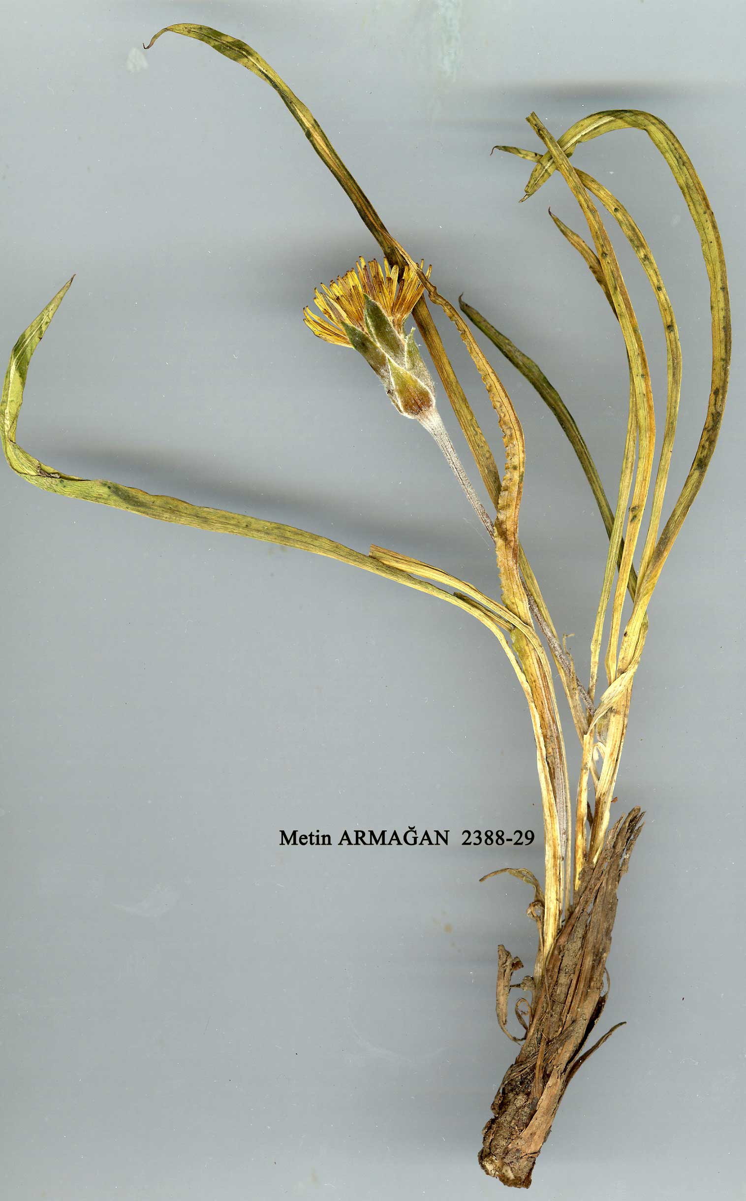 | S. semicana DC., Prodr. 7:119 (1838). Syn: S. colorata Krasch. in Trudy Bot. Inst. Akad. Nauk SSSR ser. 1, 1 : 179 (1933); S. turkeviczi Krasch. & Lipschitz in Lipschitz, Fragm. Monogr. Gen. Scorz. 1:83 (1935). Ic: Lipschitz, op. cit. 1: t. 28 (1935) as S. colorata. Erect, subscapigerous or shortly caulescent perennial; flowering stems 15-45 cm, ultimate branches (bearing single capitula) at least 1/2 total height; root-stock thick, cylindrical, sometimes branched. Lower leaves entire, 12-40 x 0.8-2 cm, linear to linear-lanceolate, margin plane to occasionally ± undulate, base amplexicaul, sparsely lanate when young, becoming glabrous. Capitula 1-4 per stem, 30-50 mm long. Inner phyllaries elongating in fruit, 15-50 mm. Flowers yellow, drying light purple. Achenes 17-30 mm, narrowly cylindrical, swollen at base, sulcate, smooth to transversely lamellate-muricate, glabrous. Fl. 4-6. Banks, meadows, 900-1700 m. Type: [Turkey C8 Mardin] in montibus Asiae minoribus prope Mardin, Aucher 3335 (holo. G-DC, photo!). E. Anatolia. A9 Kars: Kağizman, 30 iv 1914, Turkewicz 65 (type of S. turke-viczi). Kağizman, Zarabehan Çay, Woronow 12688 (syntype of S. colorata); nr Kjul-ogly, Woronow 12687 (syntype of S. colorata). B6 Sivas: Kangal, T.Baytop (ISTE 12790)! B7 Elaziğ: Siverek, Karabagh, Sint. 1888:862! B9 Ağri: 2 km S. of Tutak, 1650 m, D. 43493! C7 Urfa: Urfa, Tschermelik, Sint. 1888:795! C8 Mardin: 5 km E. of Mardin, 1100 m, D. 28603! Endemic ? Ir.-Tur. element. A species varying considerably in length of stem and width and shape of leaves. Lipschitz (op. cit.) recognizes both S. colorata and S. turkeviczi as separate species (both were described from near Kağizman). The type of S. semicana appears to have the wider leaves of S. turkeviczi but the longer stem of S. colorata and S. semicana sensu Lipschitz and therefore seems to link all three species. Forms with wider leaves and narrower leaves, and longer or shorter bracts occur throughout the range of the species. Close to and possibly only a broad-leaved form of S. mollis. |