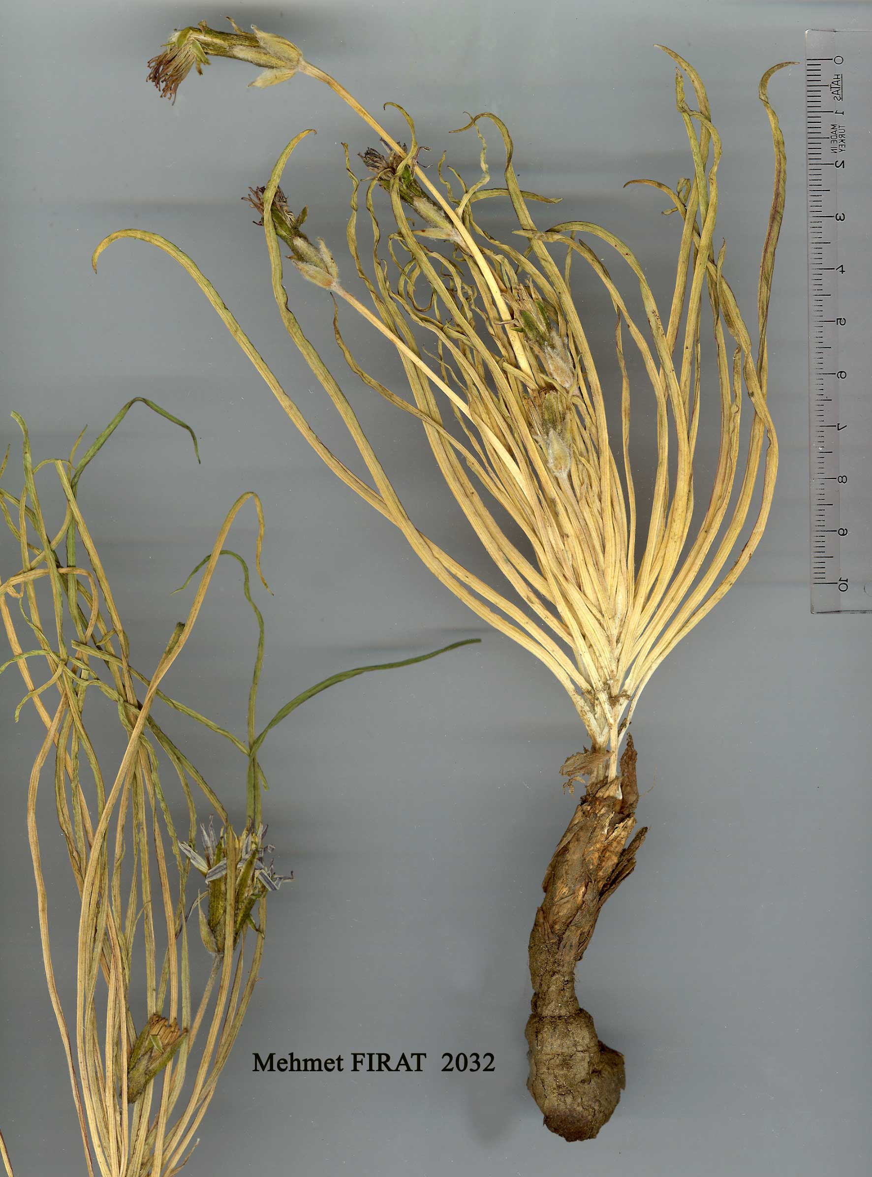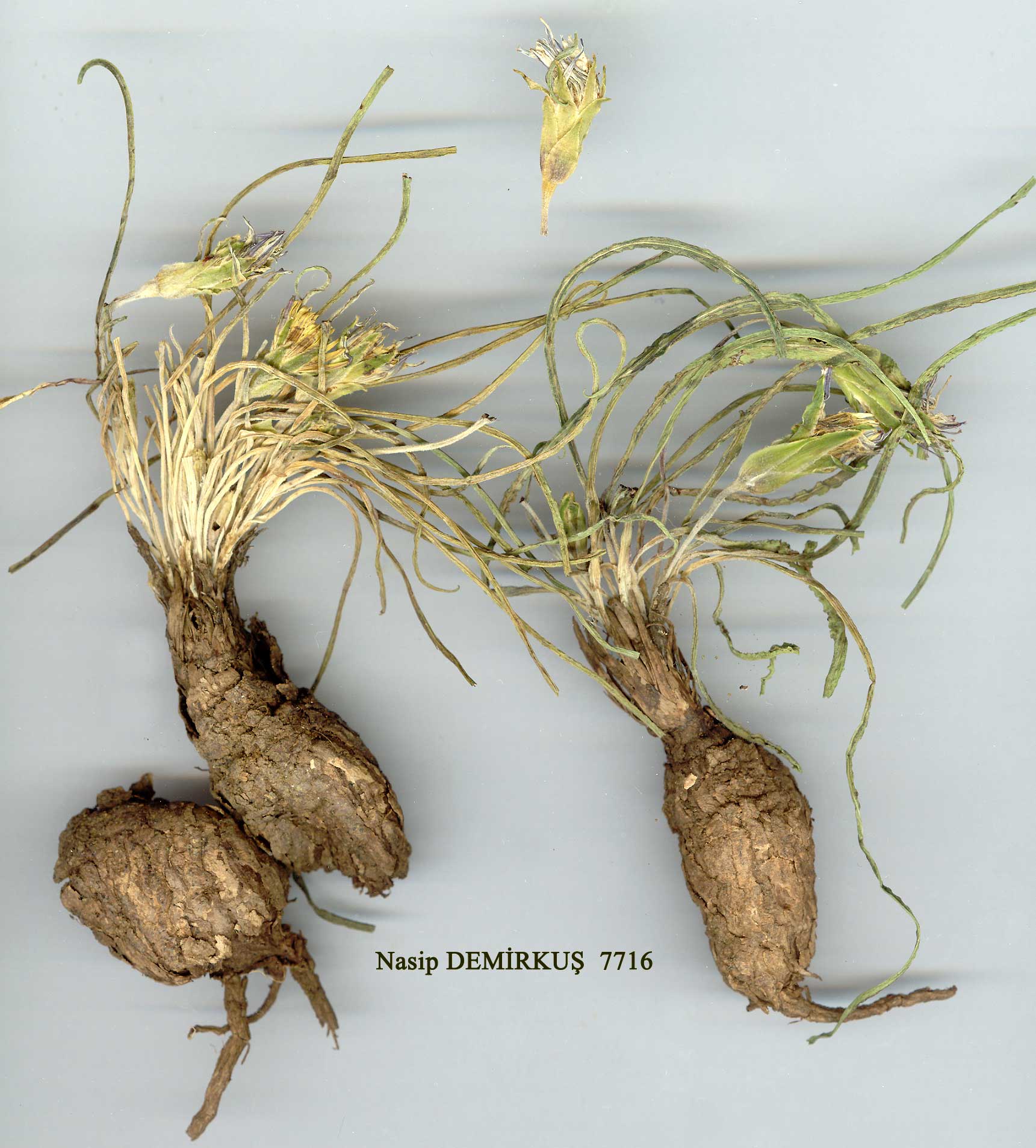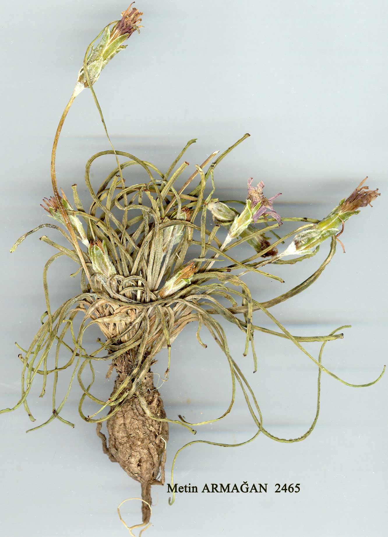 | S. suberosa C.Koch in Linnaea 17:275 (1843). Syn: S. aucheri Boiss. & Huet in Boiss., Diagn. ser. 2(3) : 92 (1856). Erect subscapigerous perennial, 5-18 cm; rootstock tuberous, occasionally branched. Leaves entire, 4-16 x 0.2-1 cm, linear, margin undulate, tapering gradually into a 0.5-3 cm petiole. Capitula 1 per stem, 18-42 mm long. Inner phyllaries 20-40 mm. Flowers lilac to purple. Achenes 18-21 x 9 mm, obscurely ridged, transversely lamellate-rugulose, glabrous; pappus hairs plumose. Fl. 5-6. 1. Leaves 2-5 mm wide, margin plane or undulate subsp. suberosa 1. Leaves 8-10 mm wide, margin undulate subsp. cariensis subsp. suberosa. Map 58, p. 647. Loamy banks, steppe, hillsides on gypsum and serpentine, 1000-2500 m. Type: [Caucasia] in Somchetia meridionali, C.Koch. Inner Anatolia. A7 Giresun: Aluçra, 1300 m, Stn. & Hend. 5061! A8 Gümü-şane: nr Bayburt, 1500 m, Görz 458! A9 Kars: Sarikamiş to Selim, 1900 m, D. 29536! Erzurum: Horasan, 1600 m, D. 29380! B3 Eskişehir: 10 km E. of Eskişehir, Sorger 64-10-2! B4 Ankara: Haymana, 1000 m, 8 v 1961, Kerck ! B6 Sivas: Ulaş, vi 1939, Reese ! B9 Ağri: 13 km E. of Taşliçay, 1700 m, D. 43530! B10 Ağri: Doğubayazit to Iğdir, 2050 m, M.Zohary & Plitm. 2265-7! Van: 6 km from Özalp to Saray, 2250 m, D. 44296! Georgia, Soviet Armenia, Ir.-Tur. element. A poor specimen from C2 Denizli (Kocabaş Köyü, 650 m, Kayacık & Yalt. 974!) probably belongs here. |