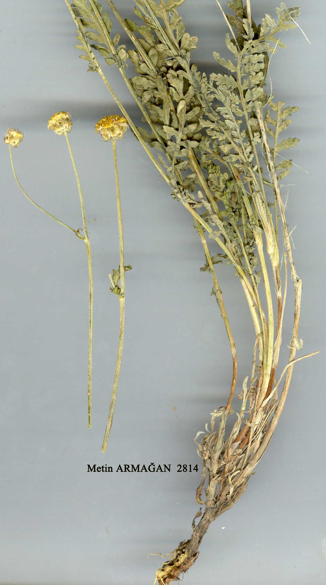 | T. canescens DC, Prodr. 6:129 (1838). Syn: T. incanum Fisch. & Mey. ex DC, loc. cit. non Willd. (1803); Pyrethrum canescens (DC.) Boiss., Fl. Or. 3:353 (1875); Chrysanthemum canescens (DC.) Rech. fil. in Öst. Bot. Zeitschr. 97:231 (1950) in obs. Figure 14, p. 267. Subcaespitose herb. Rootstocks thick, fibrous, woody. Stems 30 cm, leafy especially below, silvery-grey tomentose. Basal leaves 2-pinnatisect, 8-10 cm on 3-5 cm petioles, linear-oblanceolate in outline, primary segments 10-12-paired, 4-10 mm long, bearing 4-5 pairs of oblanceolate segments 2-3 x 1 mm, greyish-white tomentose and glandular-punctate; cauline leaves similar, becoming smaller and sessile above. Capitula 3-8 in dense terminal corymbs. Involucre 6-8 mm broad; phyllaries 3-seriate. ± densely whitish-villous, pale-margined, outer lanceolate, 2.5-3 x 0.75-1 mm, inner oblong or oblanceolate, 5 x 1-1 .25 mm, fimbriate-scarious at margin above. Female flowers c. 7, inconspicuous, corollas yellow, 2.5-2.75 mm, 3-4-lobed at apex. Disc flowers 3 mm. Achenes straw-coloured, 4 mm, 4-5-angled and ± equally 10-12-ribbed at maturity; corona c. 0.2 mm, entire-margined but minutely denticulate. Fl. 5-6. Steppe and eroded shaly hillsides, 1900-2130 m. Type: [N.W. Iran] Azerbaijan, Seidhaschi, Szovits. S.E. Anatolia. B9 Van: Çuhgediği between Hoşap and Başkale, 2130 m, Hub.-Mor. 11224! C10 Hakkari: 10 km from Bacirge to Yüksekova, 1900 m, D. 45204! Soviet Armenia and N.W. Iran. Ir.-Tur. element. |