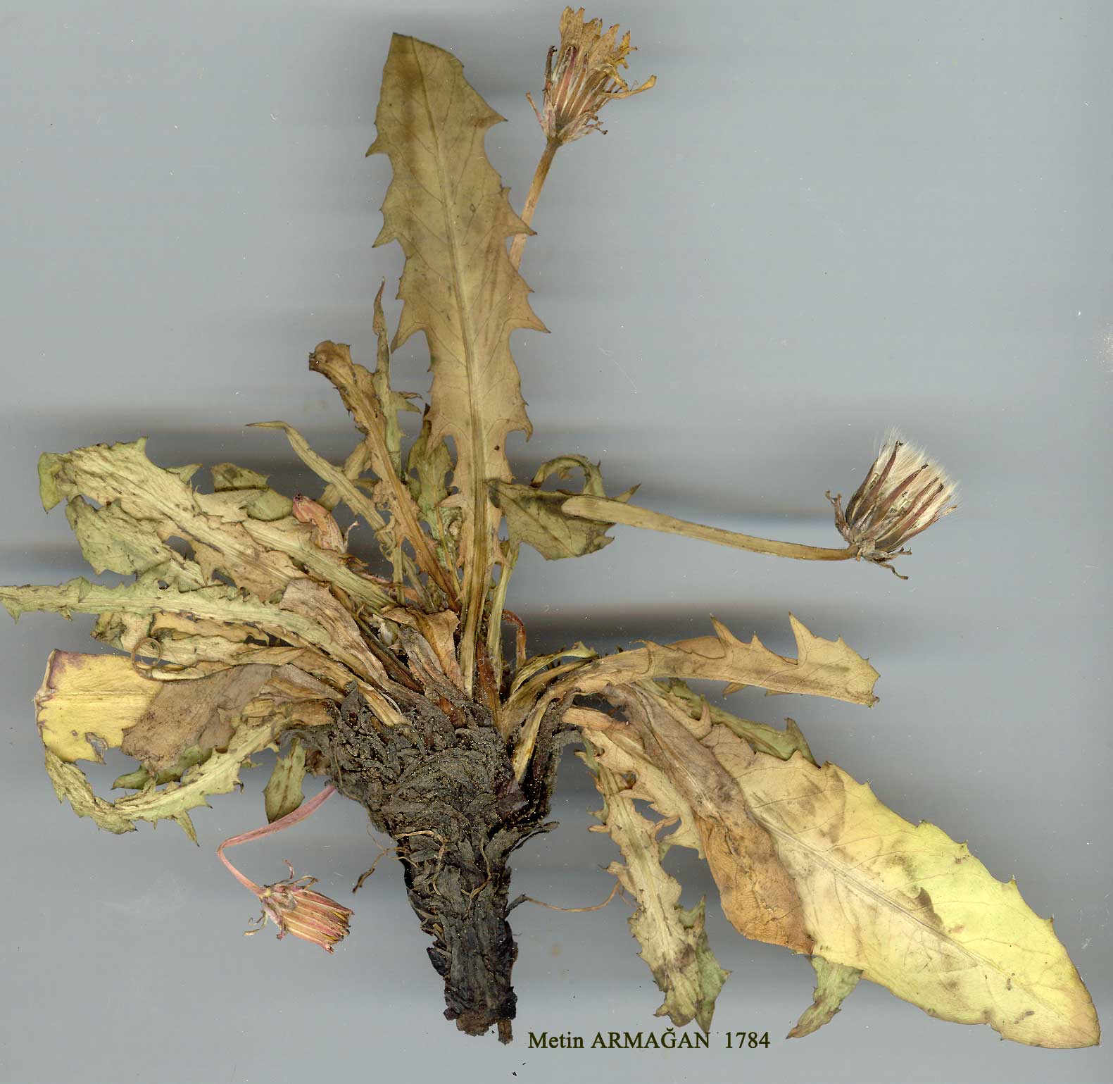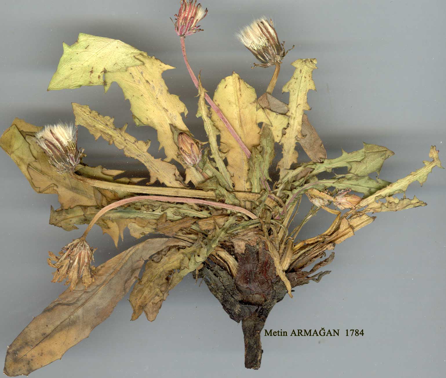 | T. bessarabicum (Hornem.) Hand.-Mazz., Monogr. Tarax. 26 (1907). Plant base sparingly hairy; leaves glabrous, ± fleshy, lobate; side lobes ± triangular, ± dentate, acute, mostly spreading. Scapes mostly ± arachnoid below capitulum. Involucre subcylindrical, narrow, mostly pale reddish-brown. Ligules red-purple on outside; stigmas pure yellow. Achenes straw-coloured, pale brown or reddish-brown, 4-6 mm, spinulose at apex, with a ± cylindrical, 1 mm cone; beak 4-5-5 mm; pappus pale reddish-brown to very pale violet. Fl. (7-)8-10(-ll). Saline places, fields, 900-3000 m. 1. Achenes straw-coloured or pale brown, 4-4.5 mm (incl. cone); beak 4 mm subsp. bessarabicum 1. Achenes reddish-brown, 6 mm (incl. cone); beak 5-5.5 mm subsp. gumusanicum subsp. bessarabicum. Syn: Leontodon bessarabicus Hornem. in Hort. Hafn. Suppl. 88 (1819); Taraxacum leptocephalum Reichb., Fl. Germ. Exc. 270 (1830-1832): T. fulvipile Harvey in Harvey & Sonder, Fl. Cap. 3:527 (1859); T. steno-cephalum Boiss. & Kotschy in Boiss., Fl. Or. 3:790 (1875)! Ic: Reichb., Ic. Fl. Germ. 19: t. 1406 f. 4 (1860); Hegi, I11. Fl. Mittel-Eur. 6(2): f. 764, b, e (1928). Type: Bessarabia, ex horto vindobonense sub hoc nomine, Hornemann (holo. W!). Mainly Inner Anatolia. A7/8 Trabzon/Gümüşane: Alischeri Khan, between Trabzon and Bayburt, 1860 m, Kotschy Suppl. 649 (type of T. stenocephalum)'. A9 Kars: Ardahan to Haçuvan, 1700 m, D. 32597! B3 Afyon: Sincanli, W. of Afyon, Aellen 1967:1008! B4 Niğde: Tuz G., N.W. of Ulukişla, 900-950 m, D. 32829! B6 Sivas: Kangal, 1440 m, M.&D.Zohary 3535! B7 Erzincan: Sipikör Da., Sint. 1890:3362! B8 Erzurum: 4 km N. of Erzurum, 1800 m, D. 47491! B9 Van: Van, Nabelek 3771! C2 Muğla: Sandras Da. at Kökluce ova, 1250 m, D. 13625! C4 Konya: Konya to Kayacik, D. 14737! C9 Hakkari: Kela Mame above Hoz, 2600 m, Nâbelek 3769! Richards informs me that T. fulvipile Harvey is synonymous with T. bessarabicum. Handel-Mazzetti was in error when he stated that it was identical with T. microcephalum sensu Hand.-Mazz. |