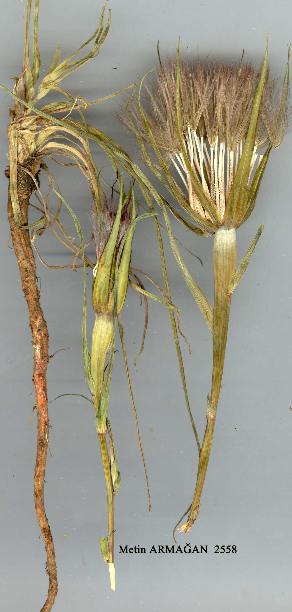| T. coloratus C.A.Meyer, Verz. Pfl. Cauc. 61 (1831). Figure 25, p. 661. Glabrous biennial, 10-50 cm. Stems usually several, branched. Leaves narrowly linear. Peduncles swollen below capitula. Phyllaries 5-8, lanceolate, usually longer than flowers, 1.5-2.5 cm in flowering capitulum, 3-5(-7) cm in fruiting capitulum. Flowers lilac to purple or pink. Achenes pale brown, 16-25 mm, with 5 longitudinal rows of ± separate scales and 5 rows of shorter scales between, beak shorter than achene, clavate at apex. Pappus 14-20 mm, purplish, annulus very sparsely hairy. Fl. 5-8. Stony places, 350-2500 m. Type: [Caucasia] in collibus siccis petrosis montium Talüsch prope pagum Swant (1830 m), C.A.Meyer (494) (G!). N. & Inner Anatolia. A4 Kastamonu: Bostanli, 30 km S. of Kastamonu, 1300 m, Sorger 69-13-34! A5 Amasya: Amasya, Bornm. 1889:696! A6 Samsun: Meşeli Düz, 350 m, Tobey 806! A7 Gümüşane: nr Gümüşane, 1862, Bourgeau! A8 Erzurum: Kop Da. between Aşkale and Bayburt, 2300-2500 m, Rech. 37700! B4 Konya: Yavşan Memlehasi nr Tuz G., D. 18680! B5 Yozgat: 1 km E. of Yozgat, 1150 m, Sorger 70-15-5! B6 Sivas: nr Zara, 1300-1400 m, Bornm. 1893:3414! B7 Erzincan: Egin (Kemaliye), 20 v 1890, Sint. s.n.! B9 Van: Varak (Erek) Da., Maunsell! Iran, S. & E. Transcaucasia, Talysh. Ir.-Tur. element. |