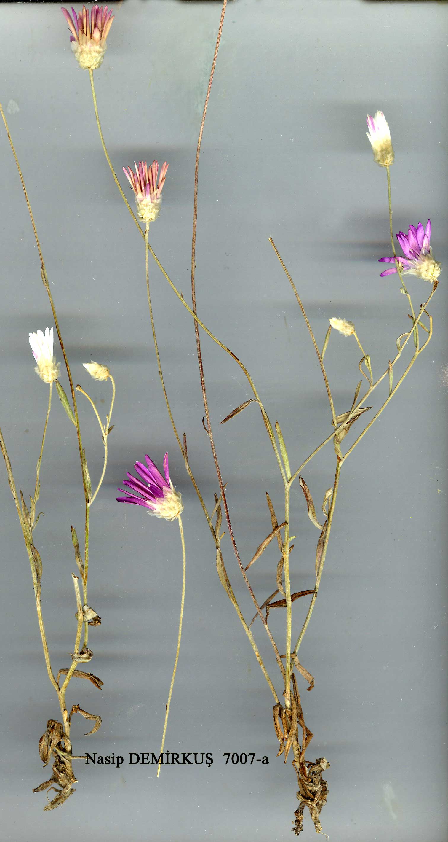 | X. annuum L., Sp. Pl. 857 (1753). Syn: X. radiatum Lam., Fl. Fr. 2:48 (1778); X. radiatum Lam. var, pictum Boiss., Diagn. ser. 1(4): 15 (1844)! X. squarrosumBoiss., Diagn. ser. 1(6): 101 (1845), incl. var. pictum (Boiss.) Boiss.! & var. unicolor Boiss., loc. cit. Ic: Fiori, Ic. Fl. Ital. f. 3699 (1904); Polunin, Fls. Europe t. 1464 (1969). Stems 5-60 cm. Leaves 5-50 x 1-8 mm. Capitula hemispherical-ovoid, 5-15 mm broad (excl. radiating inner phyllaries). Involucre glabrous; outer phyllaries ovate-mucronate, adpressed, uniformly hyaline or straw-coloured or with a fine median reddish-brown streak; inner c. 2 x length of disc, linear-elliptic, radiating, white to bright pink or purple, persistent ('everlasting'). Pappus scales 5, shorter than to slightly longer than achene. Fl. 6-9. Steppe, dry banks, dune slacks, s.l-1950 m. Described from Austria (Hb. Cliff.!). Widespread. A1(E) Edirne: Enez, s.l., Coode & Jones 2906! A2(E) Istanbul: Chichli (Şişli) to Kiathaneköy, Azn. 1259! A2(A) Bursa: above Bursa, M.&D. Zohary 2035! A3 Sakarya: nr Geyve, 100 m, D. 36302! A4 Zonguldak: Keltepe above Zarabük, 800 m, D. 38929! A5 Kastamonu: Tosya, Sint. 1892:4914b! A6 Amasya: Boraboy, 900 m, Tobey 2303! A7 Gümüşane: Kovans, between Bayburt & Gümüşane, 1800 m, D. 31939! A9 Çoruh: Ardanuç, 15 viii 1962, Leisler! B1 Izmir: N.E. of Bornova, 1 vii 1969, Fitz & Spitz.! B2 Uşak: 5 km N. of Uşak, 900 m, M. & D.Zohary 6415! B4 Ankara: 20 km W. of Ankara, 900 m, M.&D.Zohary 143! B5 Nevşehir: 5 km W. of Nevşehir, Spitz. 169! B6 Maraş: d. Göksun, Yalak, 1400 m, D. 19919! B7 Malatya: 8 km W. of Malatya, Alava 6906! B8 Muş: 6 km S. of Varto, 1600 m, D. 46313! B9 Van: 5 km W. of Çatak, D. 23254! B10 Kars: Ağri Da. below Serdar Bulak, 1600 m, D. 46935! C2 Burdur: 3 km W. of Tefenni, 1100 m, Sorger 68-22-3! C3 Antalya: 26 km from Elmali to Korkuteli, Alava & Bocquet 5250! C5 Içel: Cennet, 16 km E. of Silifke, 40 m, Sorger 71-22-5! C6 Adana: Göksu gorge below Himmetli, 700-800 m, D. 19828! C7 Urfa: Nemrut Da., Sint. 1888:1525! C8 Mardin: Kaletmara, Sint. 1888:1094! C10 Hakkari: 10 km W. of Yüksekova, 1950 m, Duncan & Tait 233! S. Europe, Caucasia, Lebanon, Syria, N. & N.W. Iran. In Turkey commonest in Irano-Turanian territory. Var. pictum (Boiss.) Boiss. and var. unicolor Boiss. (of X. squarrosum) were distinguished respectively by the presence and absence of a reddish-brown median streak on the outer phyllaries. In extreme forms this character is very well marked, but since intermediates are common and there is no geographical or ecological limitation of the variants it seems unnecessary to give them taxonomic recognition. |