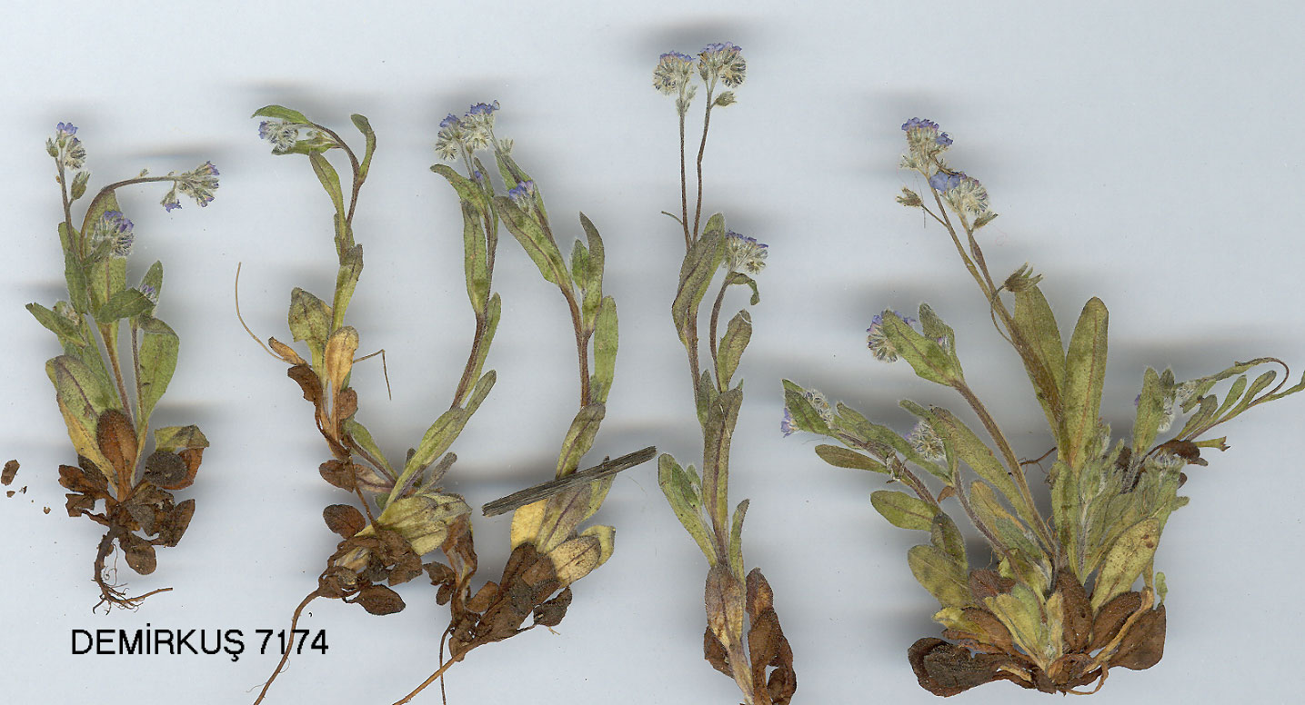 | M. sicula Guss., Fl. Sic. Syn. 1:214 (1842). Syn: M. micrantha Guss., Fl. Sic. Prodr. 1:207 (1827) non Pallas ex Lehm. (1817); M. caespitosa C.F.Schultz subsp. multiflora (Merat) Rouy var. confusa Rouy, Fl. Fr. 10:322 (1900); M. sicula Guss. subsp. virgata (Beg.) R.Schuster in Feddes Rep. 74:88 (1967). Ic: Coste, Fl. Fr. 2: t. 1599 (1903); Bonnier, Fl. Fr. 8: t. 424 f. 1989b (1926). Figure 12, p. 267. Annual or biennial to 15 cm, erect to ascending, hairs on whole plant antrorsely adpressed. Basal leaves to 3x0.5 cm, spathulate, ± withering at maturity, cauline smaller, ovate-oblong. Inflorescence with flowers ± in two distinct rows, lowermost pedicels longer, upper ones shorter than calyx. Fruiting calyx to 6 mm in fruit, tube more than 2 x as long as lobes. Limb of corolla to 3 mm diam., saucer-shaped, bright blue. Nutlets to 1.2 mm, ellipsoid to ovoid, brown, with spongy tissue at attachment scar. Fl. 5-8. Wet places, s.1.-2350 m. Described from Sicily. N. Turkey, S. & Inner Anatolia, Islands; scattered. A1(E) Kirklareli: Babaeski to Flavsa, A. Bay top (ISTE 24383). A2(E) Istanbul: Menekşe, .lkitelli, 24 v 1903, Azn. ! A4 Ankara: 26 km N. of Kizilcahamam, 1300 m, Sorger 70-5-2! A5 Çorum: 19 km from Alaca to Sungurlu, 1200 m, Coode & Jones 1660! A8 Rize: Djimil (Cimil), 2000 m, Bal. 1866:1512! A9 Kars: Akçay to Cumaçay, N. side of pass, 2350 m, D. 46767! B3 Eskişehir: Yarimca köyü, 1250 m, Battler 13344! B6 Sivas: 48 km E. of Kangal, S. of the road Baydigziyat T., 1500 m, Sorger 70-22-4! B7 Elazığ: nr Göldschik (Gölcük, nr Hazar G.), 1350 m, Hand.-Mazz. 2548! B8 Bingöl: 6 km N. of Sancak on road to Hasbağlar, 1770 m, Battler 15840! C3 Antalya: by river Catarrhaetes (Düden Çay), iii 1845, Heldr.! C5 Niğde: Dirmus-sen Da. nr Niğde, 1700 m, Siehe 1910:494! C10 Hakkari: 6 km from Yüksekova to Şemdinli, 1950 m, D. 45161! Is: Lesvos, Cand. S. & W. Europe; local. The eastern populations in Turkey differ a little from the western ones. Sometimes in the same population, there are besides typical nutlets some larger ones. Further investigation is needed. |