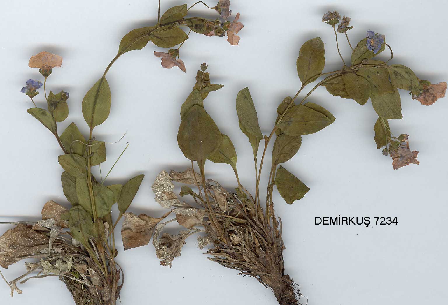 | O. luciliae Boiss., Diagn. ser. 1(4):41 (1844). Ic: Jaub. & Spach, 111. PI. Or. 4: t. 366 (1850); Bot. Mag. 99: t. 6047 (1873). Perennial herb, with suberect rootstock. Stem 5-25 cm, ascending to prostrate or trailing. Leaves ovate to oblong, usually rounded at apex; basal and lower cauline petiolate, lamina to 4.5 x 3.5 cm, lateral nerves indistinct, petiole to 5 cm; upper cauline sessile, smaller. Inflorescence bracteate. Calyx lobes narrowly elliptic, subacute. Corolla pale blue (rarely white), tube 3-4 mm, limb 4.5-8 mm diam., limb almost flat to distinctly concave. Nutlets to 2.5x1.7 mm, wing entire. Ft. 6-9. Shady rock crevices, vertical cliffs, 1200-3350 m. 1. Lamina of basal leaves to 25 x 15(-21) mm, base cuneate, decurrent into petiole subsp. luciliae 1. Lamina of basal leaves to 35(-45) x 25(-35) mm, base ± truncate, abruptly narrowed into petiole 2. Leaves glaucous, tubercles not or weakly developed; lamina of basal leaves elliptic-oblong subsp. scopulorum 2. Leaves green or very slightly glaucous; tubercle-based setules usually well developed on oldest leaves; lamina of basal leaves ovate 3. Nutlets ovate to orbicular in outline, rounded at apex, wing distinct, c. 1 mm broad subsp. cilicica 3. Nutlets triangular-ovate in outline, distinctly broader than long and with subacute apex, wing very narrow and indistinct, c. 0.4 mm broad subsp. kurdica subsp. kurdica Rech. fil. & H.Riedl in Fl. Iranica - Boraginaceae 97 (1967). Alt. c. 3200 m. Type: Iraq: Arbil, M. Qandil E. Qala Diza, 1800-3000 m, Thesiger 1158 (holo. BM!). S.E. Anatolia. CIO Hakkari: Sat Da., 3200 m, Fedden & McColl 37! N. Iraq, W. Iran. A high-alpine chasmophytic subspecies which is probably under-collected. Distribution of species: Greece, N. Iraq, W. Iran. Related to O. ripleyana. One of the most attractive alpine chasmophytes in Turkey; the species is cultivated in Europe as a rock-garden plant. |