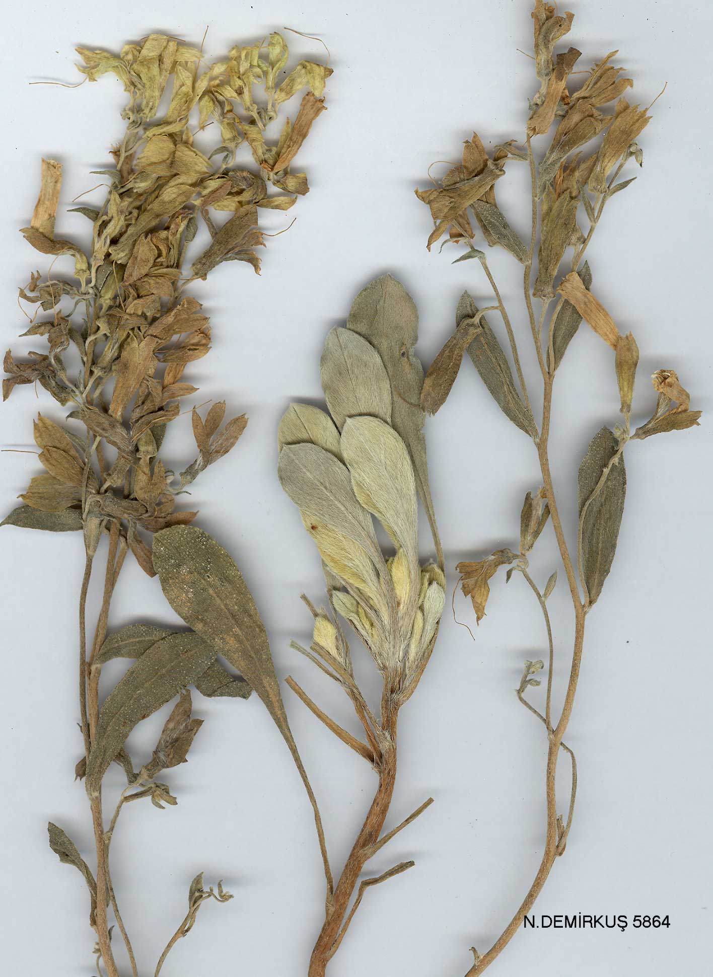 | O. isauricum Boiss. & Heldr. in Boiss., Diagn. ser. 1(11): 101 (1849). Figure 14, p. 335. Perennial. Stems 15-40(-45) cm, erect, branched or simple, adpressed setose, setae usually without basal tubercles. Leaves acute to obtuse, lanceolate to oblong or basal and lower cauline sometimes spathulate, all petiolate, 30-80x5-20 mm, greyish-white with adpressed setae on tiny, densely stellate-hairy tubercles or rather laxly setose on larger, white tubercles. Inflorescence of ± numerous terminal and lateral cymes. Bracts very small, narrowly linear. Pedicels to 4 mm in flower, to 10 mm in fruit. Calyx 13-15 mm in flower, 24-25 mm in fruit, lobes linear, usually coherent at base. Corolla bright to pale yellow at first, becoming cream to whitish, 18-24 mm, narrowly campanulate, minutely pubescent. Anthers included or with sterile tips exserted, shorter than filaments. Nutlets 3.5-4 mm, with short rounded beak and indistinct dorsal keel, brownish. Fl. 5-9. Rocky slopes, scree, Pinus and Quercus woodland, steppe etc., 300-3000 m. Type: [Turkey C4 Konya] in rupestribus apricis Isauriae supra Bounarbaschi (Bunarbaşi) inter Karaman et Ermenek, vi 1845, Heldreich (holo. G). Inner Anatolia; widespread. A3 Ankara: Beypazari, 1500 m, Akman 1051. A4 Bolu: .34 km S.E. of Gerede, 1600 m, Sorger 62-82-5! A5 Çorum: lskilip, 700 m, Coode & Jones 1783! A6 Amasya: Zefe Köy, 1100 m, Tobey 1200! A7 Gümüşane: Ikisu, 1500 m, T. Baytop (lSTE 14305)! A8 Erzurum: N.N.W. of Erzurum, lspir, Ikizdere to Rize road, Jenkins 2344! A8/9 Erzurum: Oltu civari, T.Baytop (lSTE 4778)! B2 Kütahya: Kütahya to Uşak, v 1933, Kotte. B3 Eskişehir: 6 km from Eskişehir to Kütahya, 800-900 m, Dudley {D. 36062)! B4 Ankara: 14 km S. of Kirikkale, Sorger 64-19-7! B5 Nevşehir: between Nevşehir and Ürgüp, 1200-1300 m, D. 19103! B6 Sivas: 8 km N. of Sivas, Skrivânek. B9 Ağri: Ağri to Horasan, 2000-2500 m, Rech. 32783! C3 Antalya: Akdağ, 1700 m, Sorger 65-27-17! C3 lsparta: Dedegöl Da., Yakaköyü above Yakari Sayacak, 2400 m, Peşmen & Güner 1750. C4 Konya: d. Karaman, Ermenek, D. 16146! C9 Mardin: Cudi Da. above Hessana, 1200-1400 m, D. 42838! Endemic. lr.-Tur. element. One of the commonest species of Onosma in C. Anatolia. Similar in habit to O. sericeum of subsect. Haplotricha; specimens with looser hairs and bigger tubercles resemble O. trachytrichum. |