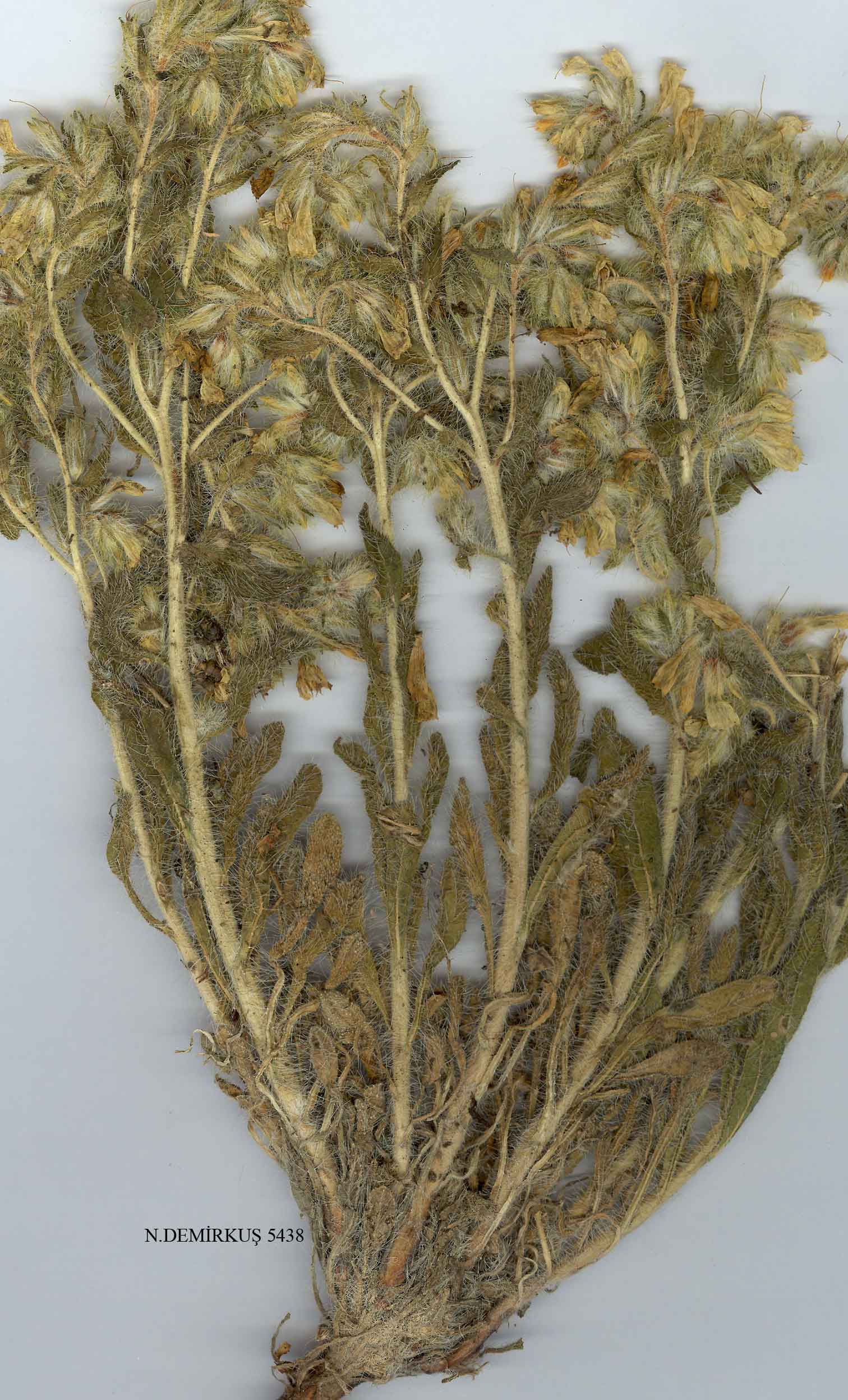 | O. polioxanthum Rech. fil. in Ann. Naturh. Mus. Wien 55:7 (1947). Syn: O. elwendicum Wettst. var. concolor sensu Náb. in Pub!. Fac. Sci. Univ. Masaryk Brno 70:20 (1926) non Hausskn. ex Bornm. (1906). Figure 13, p. 333. Perennial. Stems 1-2, 20-25 cm, erect or ascending, unbranched, adpressed- setose, puberulous, densely leafy below, less so above. Leaves 20-40x5-9 mm, lanceolate to oblong-lanceolate, acute, yellowish-green above, greyish beneath, patent-setose, puberulous; basal petiolate, cauline sessile. Bracts few, small, linear-lanceolate. Inflorescence of 2-5 lax cymes clustered at stem apex. Pedicels 3-4 mm. Calyx 12 mm in flower, 14 mm in fruit, lobes lanceolate, sometimes connate at base, base accrescent and becoming gibbous, nerves projecting as 5 setose keels. Corolla bright yellow, 14-17 mm, ± cylindrical, puberulous, lobes small, revolute, ciliate. Anthers exserted for 2-3 mm. Nutlets 2-5-3 mm, broadly ovate, with distinct laterally compressed beak, greyish, smooth to slightly rugulose. Fl 5-7. Pinus,forest, Qoercus scrub, steppe, rocky limestone slopes, fallow fields, 350-2150 m. Type: [Turkey B9 Bitlis] Kurdistan: Bitlis, 1400 m, [8 vi] 1939, Frödin 149 (holo. W! iso. UPS). Mainly S.E. Anatolia. A/B3 Eskişehir: Mihaliççik to Sariyar baraji, 900 m, D. 37219! B7 Elaziğ: 12 km E. of Elaziğ, 1 160 m, M.Zohary 3764(!). B8 Erzurum: 30 km W. of Erzurum, 1780 m, M.Zohary 67334(!). B9 Bitlis: 2 km from Bitlis, 1630 m, Hub.-Mor. 13528! Van: 24 km from Timar (Canik) to Van, 1750 m, D. 44191! Q Maraş: Maraş to Göksun road, 1400 m, Stn. & Hend. 5551 ! C9 Mardin: foot of Kasrik gorge, 9 km from Cizre, 350 m, D. 42667! Hakkari: Çukurca, 1200 m, D. 44824! C10 Hakkari: 19 km from Bacirge to Yüksekova, 2150 m, D. 45182! Endemic, lr.-Tur. element. Closely related to O. elwendicum Wettst.; treated as conspecific in Flora Iranica - Boraginaceae 196 (1967). After further study I have come to the conclusion that the former treatment was incorrect. O. elwendicum differs in having calyx 14-17 mm in flower, to 20 mm in fruit; corolla 18-20 mm or sometimes more. |