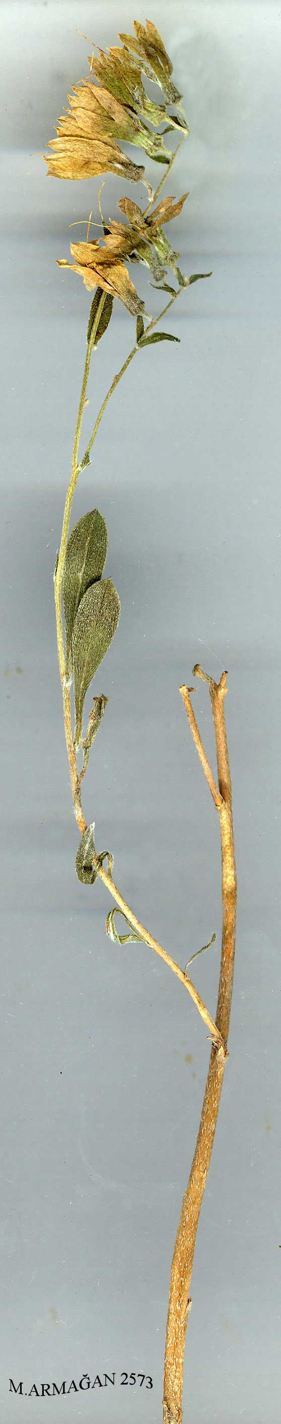 | O. subsericeum Freyn in Bull. Herb. Boiss. ser. 2, 1:274 (1901). Close to O. sericeum, differing in its narrower leaves and lanceolate calyx lobes, patent white setae on bracts and at base of calyx, yellow corolla and very short anthers. Fl. 6-8. Dry stony slopes, 580-2850 m. Type: [Turkey B9 Van] Wan, locis siccis saxosis tracti Warack-Dagh (Erek Da.), 2850 m, 15 vi 1899, Kronenburg 109 (holo. Hb. Freyn, iso. WU!). N. Iraq, W. Iran. Ir.-Tur. element. Related to O. sericeum. Apart from the type, only one other Turkish gathering can tentatively be referred to this species: A9 Çoruh: Ardanuç, 580 m, 6 viii 1966, Steîner! |