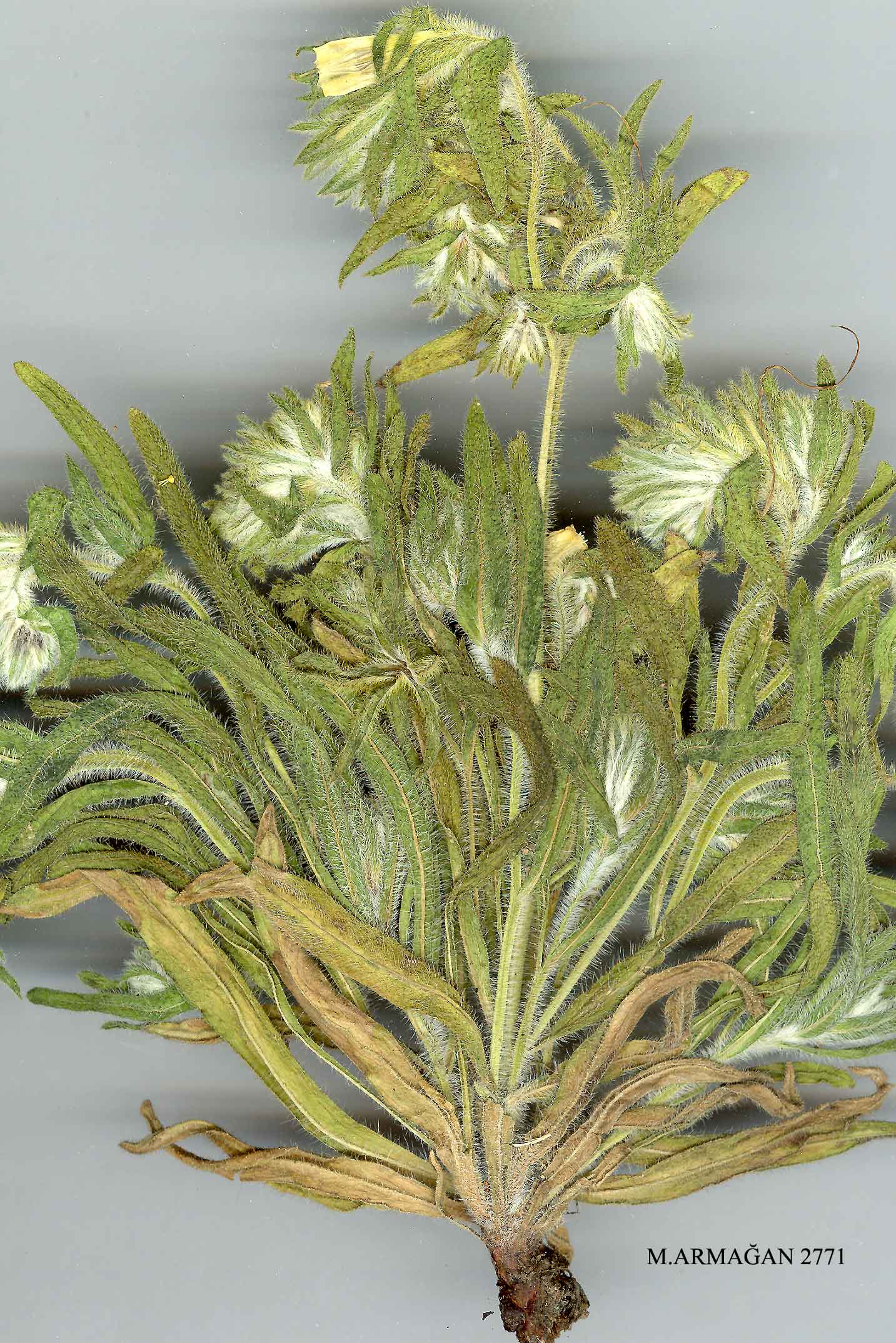 | O. trachytrichum Boiss., Diagn. ser. 1(11): 103 (1849). Figure 13, p. 333. Close to O. sericeum, differing markedly in indumentum, which is less sericeous in texture, consisting of stout setae on larger, more distinct tubercles; calyx lobes narrower, much less spreading after anthesis; corolla dull to bright yellow, sometimes drying bluish. Fl. 5-7. Field margins, igneous and limestone slopes, steppe, sandy hills, 650-2000 m.' Type: [N. Iran] in jugo Gerdene Kutschek (Gardaneh-ye Kuchek) prope Teheran, 1846, Kotschy 399 (holo. G, iso. W!). Mainly Inner Anatolia. A6 Sivas: 26 km W. of Suşehri, 1600-1700 m, Sorger 69-34-3! A8 Erzurum: lspir, 1200 m, Barclay 774! A9 Kars: 26 km from Ben-liahmet to Kağizman, 1870 m, D. 46648! B6 Maraş: Karakilise to Göksun, B.Post 142! B7 Elaziğ: Harpoot (Harput) to Khan Kezzin, B.Post 347! B8 Erzincan: 150 km W. of Erzurum, 1500 m, Barclay 703! B9 Van: 2 km N. of Micingersuyu, S. of Van, 1900 m, D. 23233! B10 Kars: Pamuk Da., 17 km from lğdir to Doğubayazit, 1400 m, D. 43860! C5 Adana: Pozanti, 1300 m, Siehe 1896:381 ! C8 Diyarbakir: 5 km S. of Diyarbakir, 650 m, D. 28746! C9 Siirt: Silvan to Kurtalan, D. 22175! CIO Hakkari:,9 km from Hakkari to Van, D. 44934! N. Iraq, W. & C. Iran. lr.-Tur. element. Related to O. sericeum; possibly of hybrid origin. |