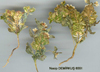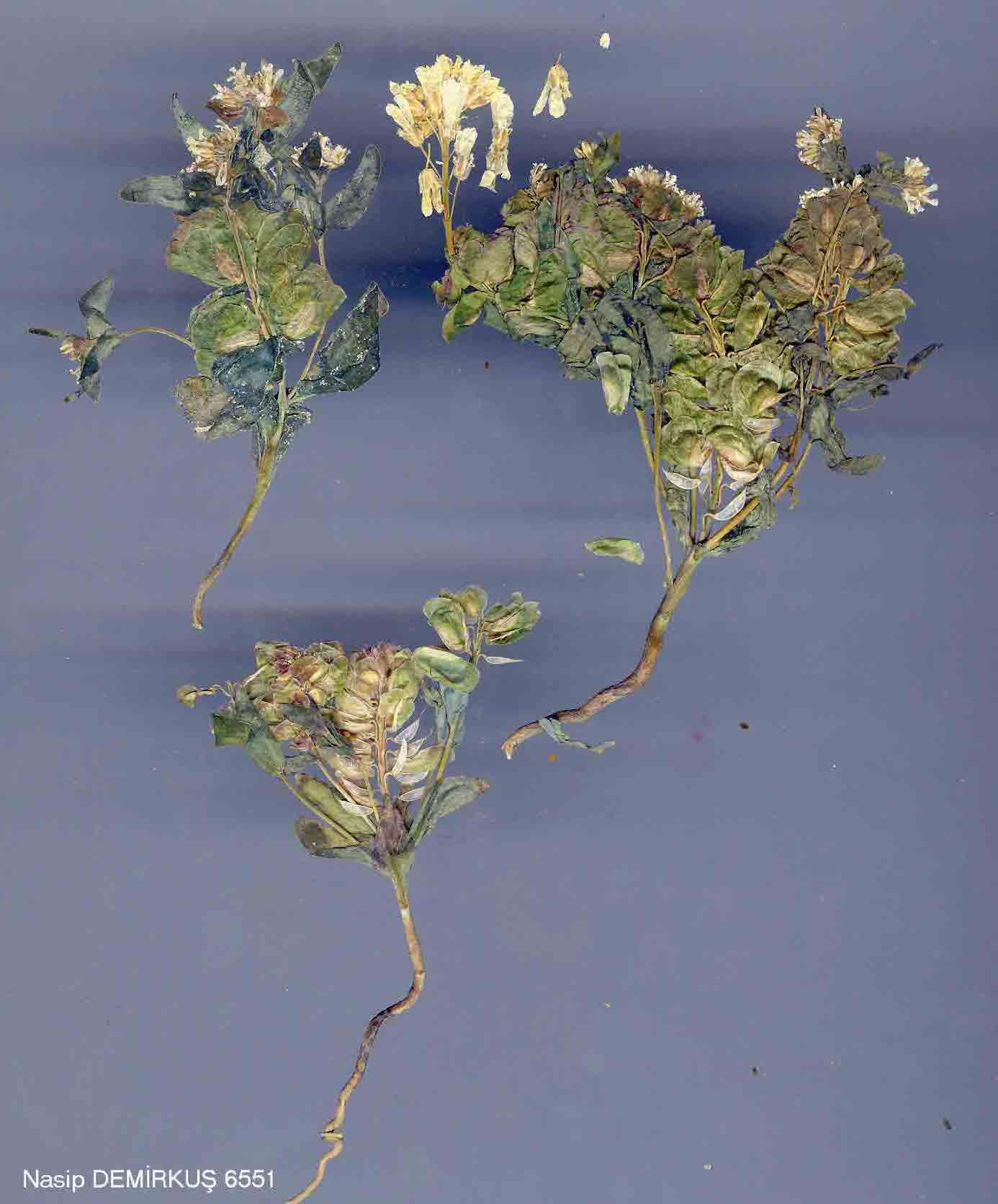 | Ae. arabicum (L.) Andrz. ex DC, Syst. 2: 560 (1821). Syn: Iberis arabica L., Cent. P1. 1: 17 (1755); Thlaspi arabicum (L.) Bieb., Fl. Taur.-Cauc. 3: 430 (1819); Th. buxbaumii Fisch. ex Hornem. in Suppl. Hort. Hafn. 71 (1819). Ic.: Fl. URSS 8: t. 41, f. 7 (1939); Reichb., Hort. Bot., t. 43 (1824). Annual, c. 10-15 cm, usually much branched. Basal leaves oblong or broadly ovate, petiolate. Cauline leaves similar, acute, cordate, amplexicaul. Petals 2-3 x 0.5-1 mm, white or pink. Filaments of longer stamens loosely connate most of their length, curved, toothed; stamens apiculate. Inflorescence compact in flower and fruit, rarely heterocarpic. Fruiting pedicels ± erect, 2-5 mm. Fruit broadly ovate, 6-12 x 6-12 mm; septum 4-6 x 1-1.5 mm; wings 2-3 mm; sinus 2-4 mm; style very short, less than 1 mm, fragile. Seeds 3-4 papillose, mucilaginous. Small fruits smooth, their seeds not mucilaginous. Radicle incumbent or obliquely incumbent. Fl. 4-6. Fields and stony slopes, 600-2700 m. Described from Arabia. Widespread. A1(A) Çanakkale: Renkoei (Erenköy) Sint. 1883:218! A2 Bilecik: Kara Su, 400 m, Bornm. 1929: 13797. A5 Kastamonu: Tosya, Sint. 1892:4109. A7 Gümüşane; Bayburt to Gümüşane, 2700 m, Stainton 8223! A8 Erzurum: Oltu (Grossheim 4: map 156). A9 Kars: 1800 m, D. 29566! B4 Ankara:Beynam, D. 13068 ! B5 Kayseri: Ercias Da., Nabêlek. 1304. B6 Maraş: Göksun-Maraş, 600 m, D. 27426! B7 Elaziğ: Elaziğ to Kale, 1300 m, D. 28922! C2 Antalya: Elmali, Boıırgeau! C2 Denizli: Honaz Da., 1300 m, Hub.-Mor. 5730! C3 Burdur: Burdur, Heldr.! C4 Konya: Konya to Karapınar, 870 m, Hub.-Mor. 13783! C5 Içel: Gülek Boğaz, 800 m, Markgraf! C6 Gaziantep: Gaziantep to Maraş, 1300 m, Balls 879! C8 Sürt: Katmos, Nâbêlek. 1304. Greece, W. Syria, Syrian Desert, Iran, Transcaucasia. |
