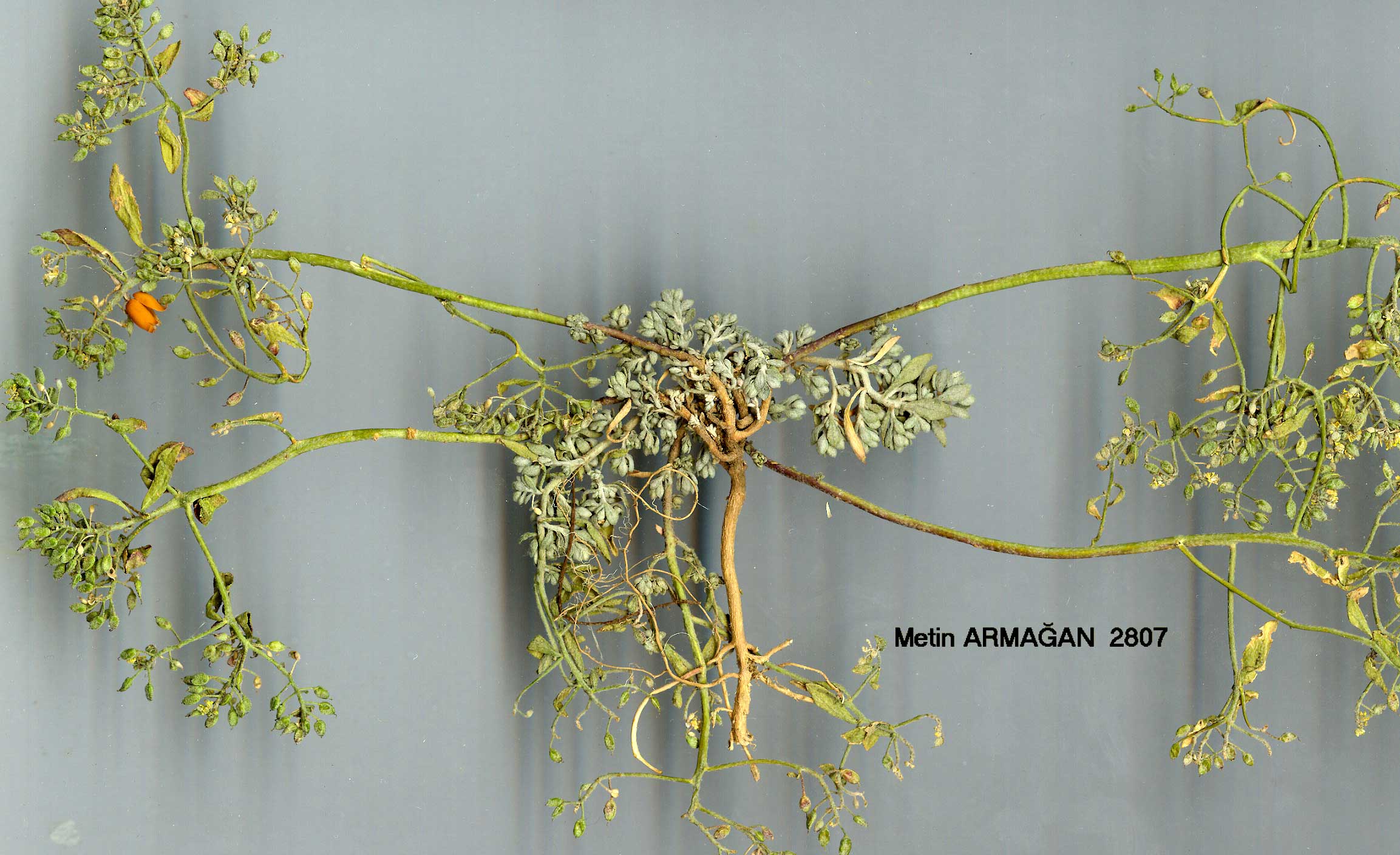 | A. alyssoides (L.) L., Systema, ed. 10, 2: 1130 (1759). Syn: Clypeola alyssoides L., Sp. PL 652 (1753)! C. campestris L., Sp. PL 652 & 1231 (1753): Alyssum caly-cinum L., Sp. PL ed. 2, 908 (1759)! Ic: Grossh., Fl. Kavk. 4: 220, t. 5, f. 6 (1950). Annual with few or many, erect or ascending, rarely prostrate stems up to 35 cm. Indumentum of adpressed few-rayed stellate hairs. Leaves obovate to linear-oblanceolate. Inflorescence rarely branched, up to 15 cm. Petals obovate, 2-3(-4) mm, usually glabrous, often scarcely exceeding the sepals and persistent with them. Fruits orbicular, emarginate or truncate (2-)3-4(-5) mm; valves equally inflated, with compressed margins and an indumentum of small, ad-pressed stellate hairs. Styles 0.3-0.6(-l) mm, usually glabrous. Seeds narrowly winged. Fl. 3-8. Disturbed habitats, s.1.-2000 m. Described from Austria and France (type in Herb. Cliff.!). Scattered. A2 Bursa: Olympus (Ulu Da.), Sestini. A6-8 Tokat to Erzurum, Aucher. A7 Trabzon: Boz Tepe, Schischkin. B1O Ağri: Dutach to Burnubulak, Schischkin. C6 Gaziantep: Killis, Post 335. Europe, N. Africa. Most Anatolian records for this species are certainly wrong; confirmation of its occurrence in Turkey is needed |