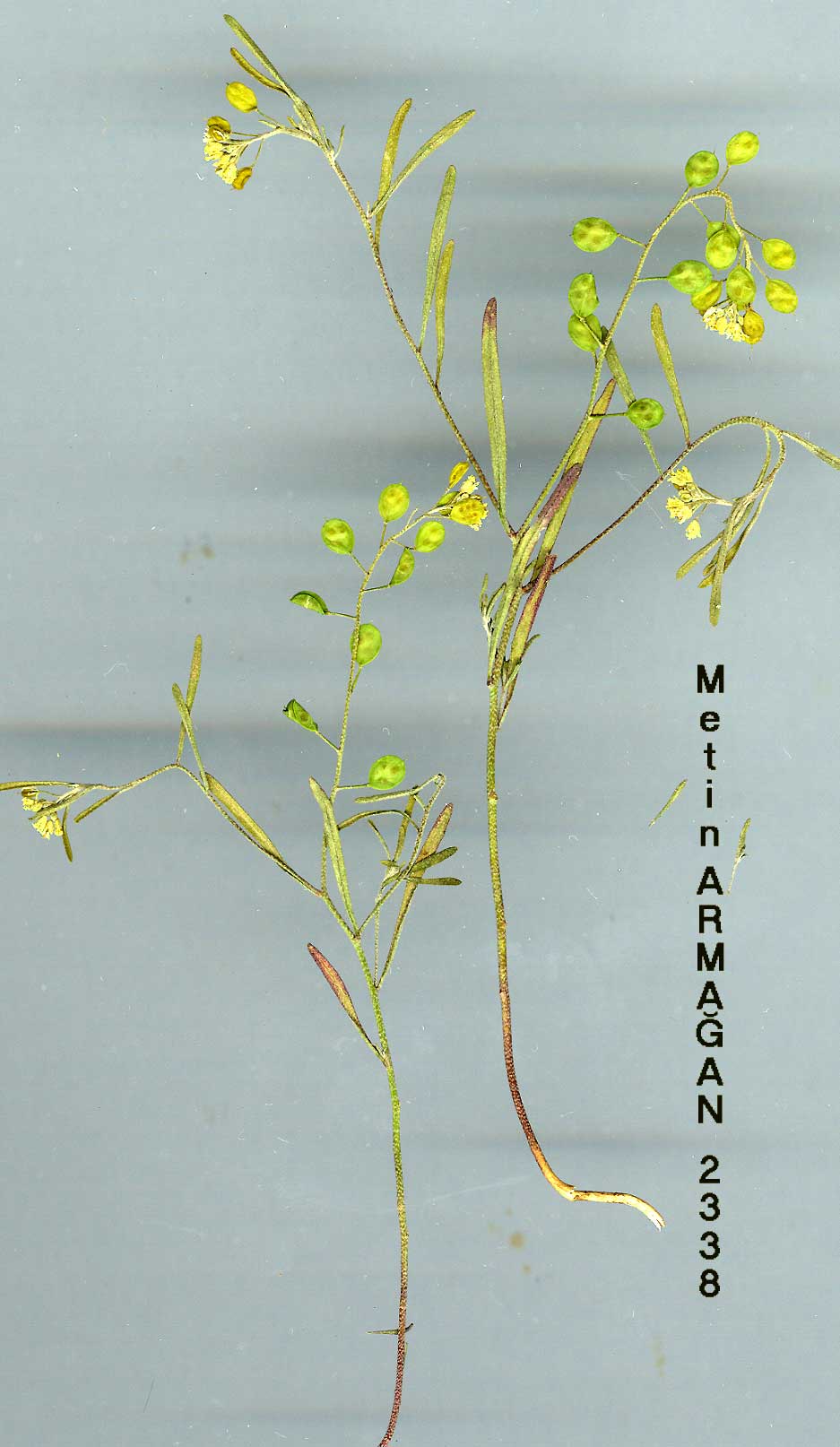 | A. aureum (Fenzl) Boiss., Fl. Or. 1: 286 (1867). Syn: Meniocus aureus Fenzl, Pug. 13 (1842)! Ic: Jaub. & Spach, 111. Or. 1: t. 53A (1843) as Meniocus grandi-florus. Stems (3-)5-20 cm. Leaves (8.5-) 12-30 mm, always flat. Petals yellow, spathu-late, retuse or bilobed, 4-6.5 mm. Fruits glabrous. Styles 1-1.8 mm. Seed wing 0.2-0.4 mm wide. Fl. 3-6. Dry cultivated land and steppe, 400-2500 m. Type: [Syria] circa Aleppo, Kotschy 27 (holo. W! iso. BM! E! G! GH! K! OXF!). Lycaonia, Upper Euphrates, Mesopotamia. B6 Malatya: Darende, McDaniels! B7 Erzincan: Sürek, Sint. 1889: 130b! Elaziğ: 22 miles E of Elaziğ, 1300 m, D. 28938! Malatya: Malatya, 1000-2500 m, Ajtaikovitch! C4 Konya: Küçük Köy, 980 m, Helbaek! C6 Gaziantep: Yonas, 900 m, Haradj. 1770b! C7 Urfa: Djebel Taktak (Tektek Da.), Hausskn.! W. Syria, Syrian Desert. Ir.-Tur. element. |