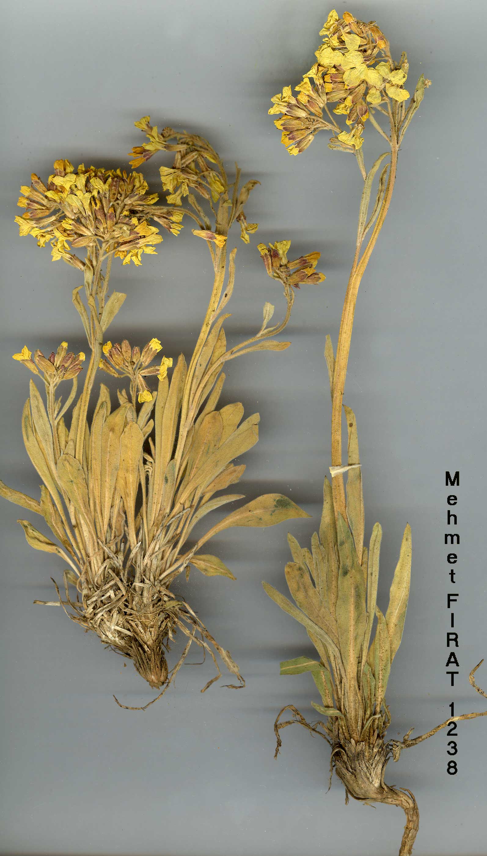 | A. elichrysifolium (DC.) Boiss., Fl. Or. 1: 240 (1867). Syn: Sterigma elichrysi-folium DC, Syst. 2: 581 (1821). Perennial herb with a short woody stock and numerous sterile rosettes. Stems erect, sometimes scapose, 4-40 cm. Leaves entire, usually canescent, oblanceolate to spathulate, tapering into a long petiole. Flowers very fragrant. Petals bright yellow, (6-)10-13 mm. Siliquae usually lanceolate, often constricted between the seeds, pubescent, 10-30 mm, borne on erect-spreading, or rarely deflexed pedicels. Stigma lobes diverging. A very polymorphic species, divisible in Turkey into 6 subspecies: 1. Petals 6-9 mm; siliquae villous with hair as long as the siliqua is broad subsp. villosum 1. Petals usually 10-13 mm; siliquae less densely pubescent 2. Whole plant densely white-pannose subsp. canescens 2. At most the young leaves white-pannose 3. Stems unbranched, usually scapose subsp. elichrysifolium 3. Stems branched above, usually leafy 4. Plants completely egiandular subsp. persicum 4. Plants with glands on the stems and pedicels 5. Plants canescent as well as glandular subsp. cilicicum 5. Plants principally glandular, with a few branched hairs, but not canescent subsp. glandulosum subsp. glandulosum Cullen & Coode in Notes R.B.G. Edinb. 26: 193 (1965). Fl. 7-8. Rocky places, 2500-3300 m. Type: Turkey B7 Erzincan: foot of Keşiş Dağ, above Cimin, 2500 m, Davis & Hedge D. 31693 (holo. E!). Upper Euphrates, Kurdistan. B7 Erzincan: Keşiş Da., above Cimin, 2600 m, D. 31757! C9 Hakkari: Cilotepe, 3300 m, D. 24062! Endemic; Ir.-Tur. element. |