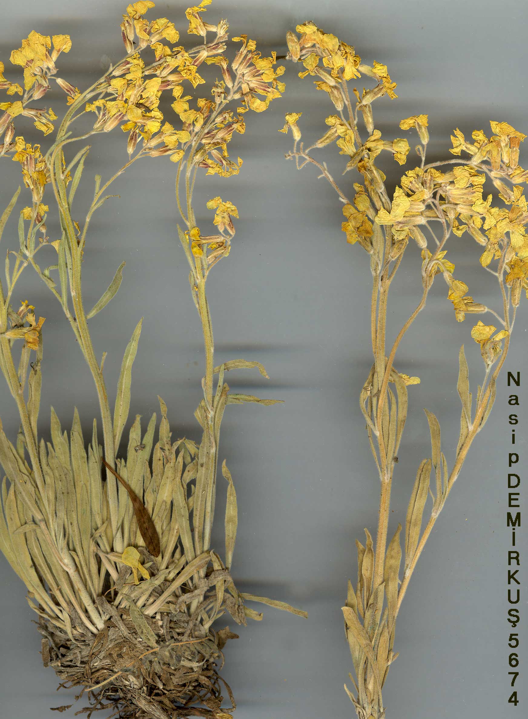 | A. elichrysifolium (DC.) Boiss., Fl. Or. 1: 240 (1867). Syn: Sterigma elichrysi-folium DC, Syst. 2: 581 (1821). Perennial herb with a short woody stock and numerous sterile rosettes. Stems erect, sometimes scapose, 4-40 cm. Leaves entire, usually canescent, oblanceolate to spathulate, tapering into a long petiole. Flowers very fragrant. Petals bright yellow, (6-)10-13 mm. Siliquae usually lanceolate, often constricted between the seeds, pubescent, 10-30 mm, borne on erect-spreading, or rarely deflexed pedicels. Stigma lobes diverging. A very polymorphic species, divisible in Turkey into 6 subspecies: 1. Petals 6-9 mm; siliquae villous with hair as long as the siliqua is broad subsp. villosum 1. Petals usually 10-13 mm; siliquae less densely pubescent 2. Whole plant densely white-pannose subsp. canescens 2. At most the young leaves white-pannose 3. Stems unbranched, usually scapose subsp. elichrysifolium 3. Stems branched above, usually leafy 4. Plants completely egiandular subsp. persicum 4. Plants with glands on the stems and pedicels 5. Plants canescent as well as glandular subsp. cilicicum 5. Plants principally glandular, with a few branched hairs, but not canescent subsp. glandulosum subsp. persicum (DC.) Cullen & Coode in Notes R.B.G. Edinb. 26: 193 (1965). Syn: A. elichrysifolium var. persicum (DC.) Bornm., in Feddes Rep. Beih. 89(1): 39 (1936); Matthiola persica DC, Syst. 2: 168 (1821). Fl. 6-8. Rocky places, 2750-3300 m. Type: in Persia, Lamb (?). Kurdistan. B9 Bitlis: Nimrud Da., c. 3000 m, Post 1906:715! Bitlis/Van:Mountain 10 km S of Pelli, 2800 m, D. 22537! Van: Ispiriz Da., nr. Başkale, 3300 m, D. 23769! N. Iran. Ir.-Tur. element. |