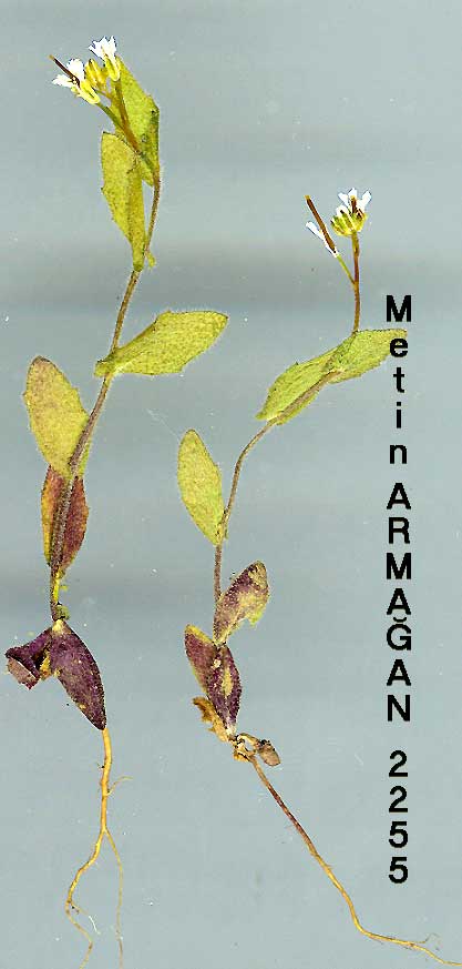 | A. pumila (Steph.) Busch, Fl. Cauc. Crit. 3(4): 457, 465 (1909). Syn: Sisym-brium pumilum Steph. ex Willd., Sp. PL 3(1): 507 (1800); Drabopsis oronticum Stapf in Denk. Akad. Wiss. Wien, Math.-Nat. Kl. 51: 298 (1886). Annual 3-5 cm high, usually single stemmed. Basal leaves ± rosette-forming, few, with substellate hairs, obovate entire. Cauline leaves few, oblong, clasping stem. Inflorescence 3-10-flowered. Fruiting pedicels 3-6 mm, horizontally spread-ing or deflexed. Fruit ± densely covered with substellate hairs, c. 10 x 1 mm, defiexed or erect. Seeds many, uniseriate, mucilaginous. Fl. 5. Caves and salt steppe, c.1800 m. Described from N. Persia. Cilicia and Armenia. B9 Kars: Iğdir, salt steppe, Sauer 285/57! C5 Seyhan: Karli Boghas, caves, 1800 m, Siehe 1895: 697! C. & S. Russia, Caucasia, W. Syria, N. Iraq, Iran, Afghanistan, W. Pakistan, C. Asia. |
