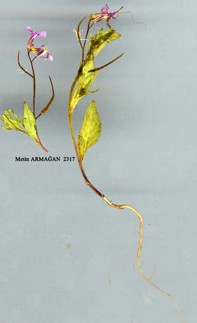 | C. tenella (Pall.) DC, Syst. 2: 435 (1821). Syn: Raphanus tenellum Pall., Itin. 3, App., t. 50, f. 3 (1776). Annual herb. Stems ascending to erect, 7-25 cm, with an indumentum of short glandular hairs, rarely almost glabrous. Lower leaves oblong-obovate, dentate to pinnatifid. Upper leaves repand-dentate. Petals entire, purple, 8-10 mm. Mature siliquae 25-30 x c. 1.5 mm. Fl. 6-7. Fields etc., 800-3000 m. Type: [U.S.S.R.] in deserto Caspico, locis praesertim praeruptis et nitrosis, Pallas. Inner Anatolia. A3 Ankara: Beypazari, Aucher 4168! A4 Çankiri: Çankiri, 800 m, Bornın. 1929: 13768. A5 Kastamonu: Tosya, Sint. 1892: 3861. B4 Ankara: Dikmen Da., 1000 m, Bornın. 1929: 13767. B5 Kayseri: Kayseri Ova, Bağda 233! B9 Muş: Malazgirt, 1500 m, Schischkin. Van: d. Gevaş, Artos Da., 3000 m, D. 22732 !C5 Konya: between Ereğli and Ulukışla, 1200 m, It. Leyd. 1959: 1005c! Bulgaria, Romania, C. & S. Russia, Siberia, N., N.W. & C. Iran. |