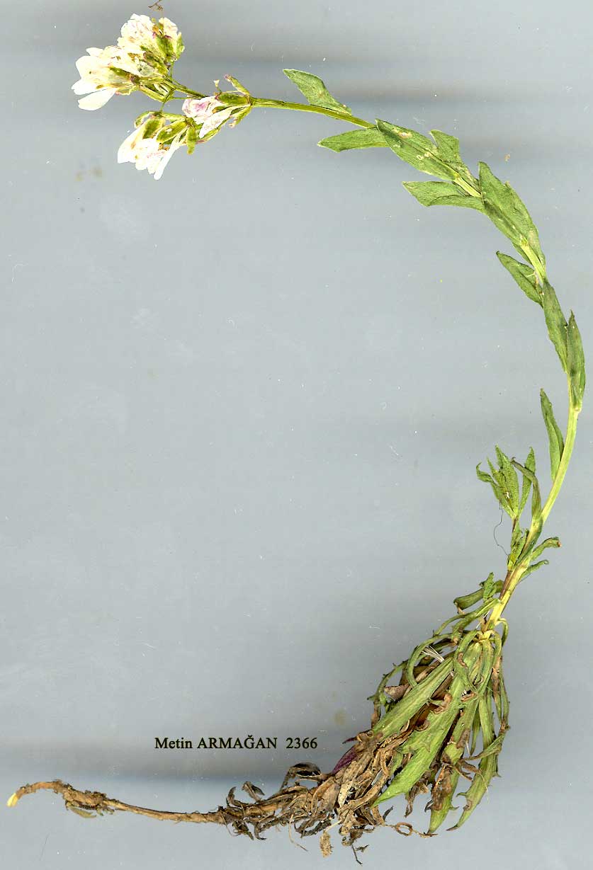 | C. vesicaria (L.) Holmboe in Berg. Mus. Aarb., n. 13, 6 (1907). Syn: Alyssum vesicaria L., Sp. Pl. 910 (1753); Coluteocarpus reticularus Boiss. in Ann. Sci. Nat. 17: 162 (1842). Ic: Schulz, Pflanzenfam.. ed. 2, 17b: fig. 252 (1936). Figure 10, p. 251. Clump-forming perennial herb, stems 4-18 cm. Basal leaves linear, oblong-lanceoiate or ± spathulate. alternate at base, with 3-5 small teeth on each side. Stem leaves sessile, oblong-lanceolate, entire. Inflorescence elongating in fruit. Petals 6-11 x 2.5-4 mm spathulate, rounded or subacute at apex, limb gradually narrowed into claw. Fruiting pedicels thin, reflexed, 4-9 mm. Fruit 14-33 x 16-21 mm; septum complete or marginal only, 15-33 x 8-18 mm; style persistent 1-4 ram; seeds 2-10, not mucilaginous. 1. Leaves of basal rosettes rhomboid to ovate to spathulate; septum complete; seeds (l-)2 subsp. boissieri 1. Leaves of basal rosettes linear or oblong-lanceolate; septum marginal; seeds 4-10(-12) subsp. vesicaria subsp, vesicaria, Ic.: Schulz, Pflanzenfam., op. cit., f. 252. Fl. 4-6. Stony slopes and screes, 1200-27G0 m. Described from material of Tournefort and probably of Armenian origin. Armenia, Upper Euphrates. Kurdistan. A7 Gümüşane: Gümüşane to Bayburt, 1500 m, Stainton 8344! A8 Erzurum: d. Ispir, 41 km S of Ispir, 2200 m, Hub.-Mor. 16238. A9 Çoruh: d. Ardanuç, Kordevan Da., 2700 m, D. 30357! B7 Erzincan: Keşiş Da., above Cimin. 2500-2600 m, D. 31672! Tunceli: Pülümür to Mutu, 1760 m, Hub.-Mor. 10977; Munzur Da., above Ovacik, 2400 m, D. 31208A! Elaziğ: Kharput (Harput), Sint. 1889:333! B8 Erzurum: Erzurum, Calvert. B9 Bitlis: Shemaran (c. 10 miles S of Van), Post 1906: 666! Transcaucasia. Ir.-Tur. element. Common in the Gümüşane region. Fairly constant in characters except where its range overlaps that of the other subspecies. subsp. boissieri (O. E. Schulz) Hedge in Notes R.B.G. Edinb., 26: 181 (1965). C. boissieri O. E. Schulz in Pflanzenfam., ed. 2, 176: 428 (1936). Fl. 4-6. Stony slopes and screes, 2200-3300 m. Described from Kurdistan. Kurdistan. B9 Bitlis: Kambos Da. above Hurmuz, 2450 m, D. HAITI Nemrut Da., 2200 m, Birand &. Karamanoğlu 220. C9 Hakkari: Cilo Da., 10 km W of Cilo Tepe, 3650 m, D. 24204! Lebanon, N. Iraq, W. Iran. Ir.-Tur. element. A fairly constant taxon through-out its range. The following Turkish specimen is somewhat intermediate between subsp. boissieri and subsp. vesicaria: B9 Van: d. Başkale, Ispiriz Da., 3300 m, D. 23699! |