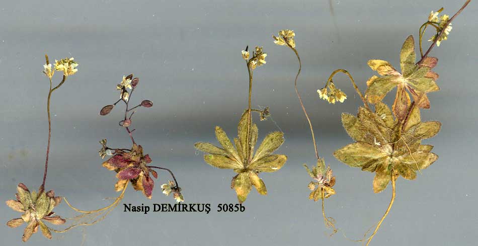| D. verna C. Koch in Linnaea 15: 253 (1841). Syn: Arabis nuda Belanger ex Boiss. in Ann. Sci. Nat. 17: 54 (1842); Sisymbrium nudum (Bel. ex Boiss.) Boiss., Fl. Or. 1: 214(1867); Drabopsis nuda (Bel. ex Boiss.) Stapf in Denk. Akad. Wiss. Wien, Math.-Nat. Kl. 51(2): 30 (1886); Arabidopsis verna (Koch) Busch in Fl. Cauc. Crit. 3(4): 460 (1909). Figure 13, p. 257. Scapose annual herb. Stems erect, up to 10 cm. Leaves oblong-spathulate, entire or weakly dentate, with an indumentum of stellate-furcate hairs. Petals yellowish, c. 3-4 mm. Siliquae strict, flattened, borne on somewhat thickened pedicels. Style very short. Fl. 5. Type: in arenosis Armeniae, C. Koch. Mainly East Anatolia. A7 Gümüşane: Chakaxa, 1894 Sint.! B7 Erzincan: Egin (Kemaliye), Hodschadur Dagh, Sint. 1890: 2286! B8 Erzurum: Erzurum, vi 1853, Huei! B9 Muş: Malazgirt, 1500 m, Schischkin. BIO Ağri: Bayazid (Doğu-bayazid), Aucher 4115! C5 Niğde: Maaden, 2000 m, Siehe 1898: 6! C8 Mardin: Terek (Derik), Hausskn.! Soviet Armenia, N. Iran, Afghanistan, W. Himalayas. Ir.-Tur. element. |