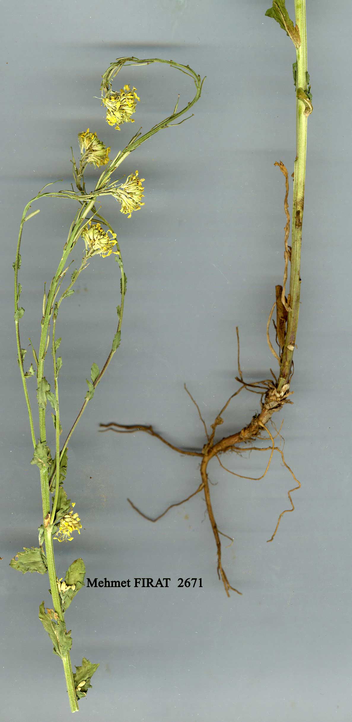 | E. cuspidatum (Bieb.) DC, Syst. 2: 493 (1821). Syn: Cheiranthus cuspidatus . Bieb., Fl. Taur.-Cauc. 2: 120 (1808). I?: Fl. U.R.S.R. 5: t. 52 (1953). Annual or biennial. Stems erect, up to 70 cm. Lower leaves oblong to oblong-spathulate, dentate to subentire. Cauline leaves adpressed to the stem, oblanceo-late, dentate, all with an indumentum of 3-5-fid hairs. Sepals 5-7 mm. Petals yellow, 9-13 mm. Siliquae laterally compressed, adpressed to the flowering axis, grey with green angles, the valves keeled or winged. Hairs 3-5-fid. Style 3-8 mm. Fl. 6-8. Steppe, fallow fields, etc., up to 2300 m. Type: Crimea, Bieberstein (LE; photo. E!). Widespread in N. & Inner Anatolia. A2 Bursa: Olympus (Ulu Da.), Aucher! A3 Bolu: Mudurnu, 1400 m, Kühne 3462. A4 Çankiri: d. Ilgaz, Topali, 1320 m, Hub.-Mor. 13713! A5 Çorum: Osmançık to Çorum, 1120-1250 m, Hub.-Mor. 13712! A6 Sivas: Zara to Suşehri, 1550-1650 m, Hub.-Mor. 12785! A7 Gümü-şane: Daltaban (Taltaban), Sint. 1894: 5925! A8 Erzurum: Erzurum to Tortum, 1980, 1980 m, Hub.-Mor. 14794! A9 Çoruh: Dzhinal (Cinai?), Woronow 580. B2 Kütahya: Gediz, 850 m, D. 36900! B3 Bilecik: Söğüt to Eskişehir, 1020 m, Hub.-Mor. 12782! B7 Erzincan: Sipikor Da., Sintenis 1889: 1199! B8 Erzurum: Erzurum, Huet! B9 Bitlis: Tatvan, 1750 m, D. 23604! Caucasia, S. Russia, Balkans, N. Iran. Sometimes regarded as constituting a separate genus, Syreniopsis Fuchs, or placed in Syrenia. |