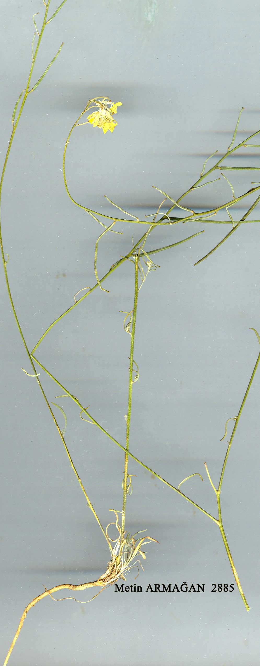 | E. repandum L., Demonstr. PI. (1,753). Figure 13, p. 257. Annual herb. Stems erect, 5-25 cm. Leaves linear to very narrowly elliptic, repand-dentate, with an indumentum consisting of 2-fid and a few 3-fid hairs. Sepals 4-5 mm. Petals yellow, 6-7 mm. Fruiting pedicels 2-3 mm. Siliquae 40-60 mm, terete, torulose, with an indumentum of mainly 2-fid hairs, but usually with a few 3-fid hairs near the style. Style very short. El. 4-5. Slopes, fields, waste ground, s. 1.-1500 m. Described from plants grown in the Uppsala Botanic Garden. Widespread. A1(E) Çanakkale: Kilia, Ingoldby 41. A2(E) Istanbul: Şişli to Flamour (Ihlamour), Azn.! B3 Afyon: Karakuyu, 1000 m, Hub.-Mor. 9892! B4 Ankara: Ankara, Kotte 1024! B6 Maraş: Göksun, nr. Yeniş Da., 600 m, D. 27508! B9 Muş: Melazgerd (Malazgirt), 1500 Schischkin. C3 Antalya: S side of Avlan G., 1050 m, It. Leyd. 1959: 704! C4 Konya: Küçük Köy, 980 m, Helbaek 2394! Içel: Gülnar, 900-940 m, Hub.-Mor. 10036! C5 Seyhan: Karapounar (Karapinar), Heldreich!C6 Gaziantep: Gaziantep, Kara Taş, 1000 m, Balls 2151! C7 Adıyaman: Gölbaşi, 800 m, D. 27747!a Most of Europe, S.W. Asia. |