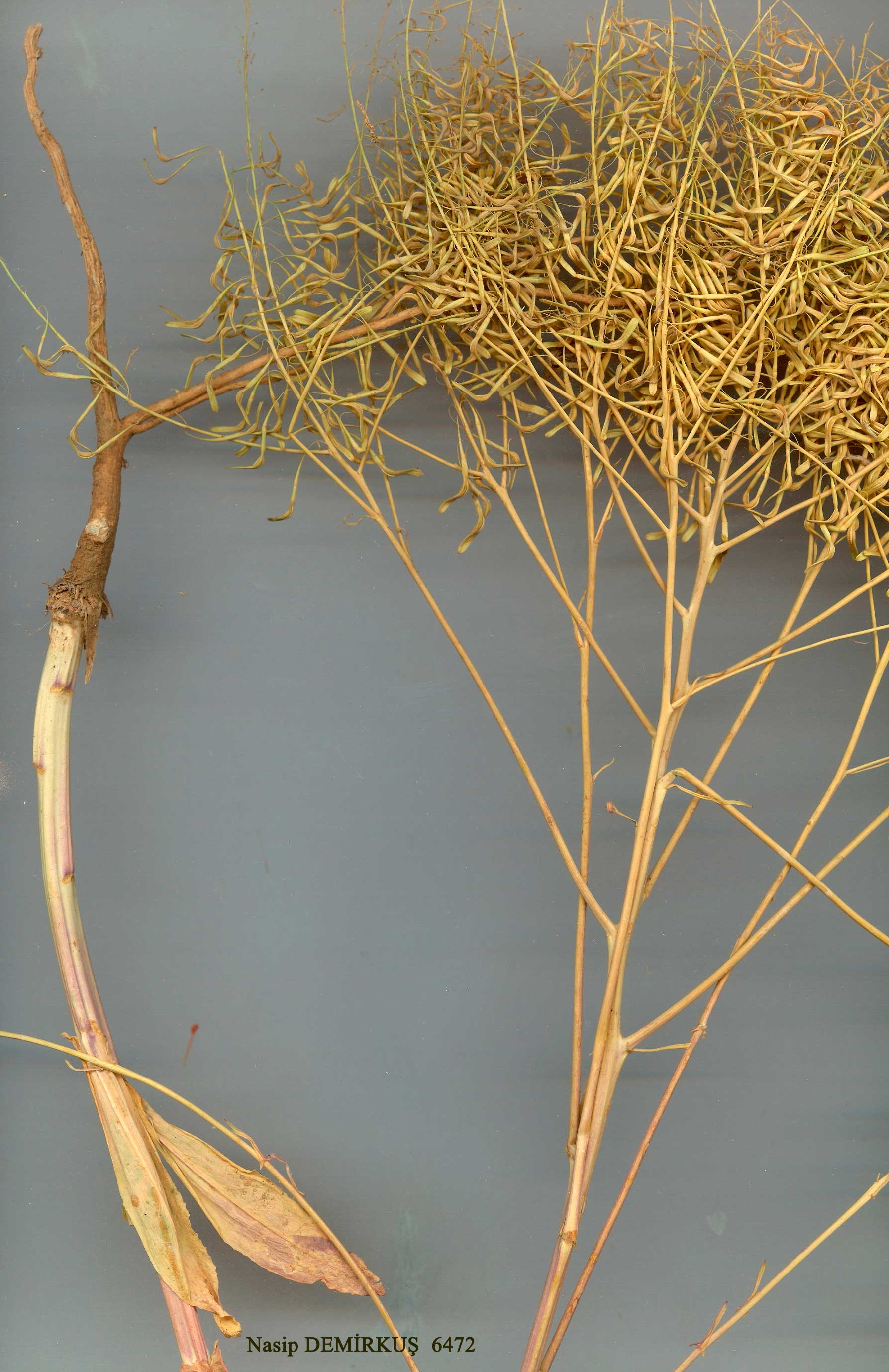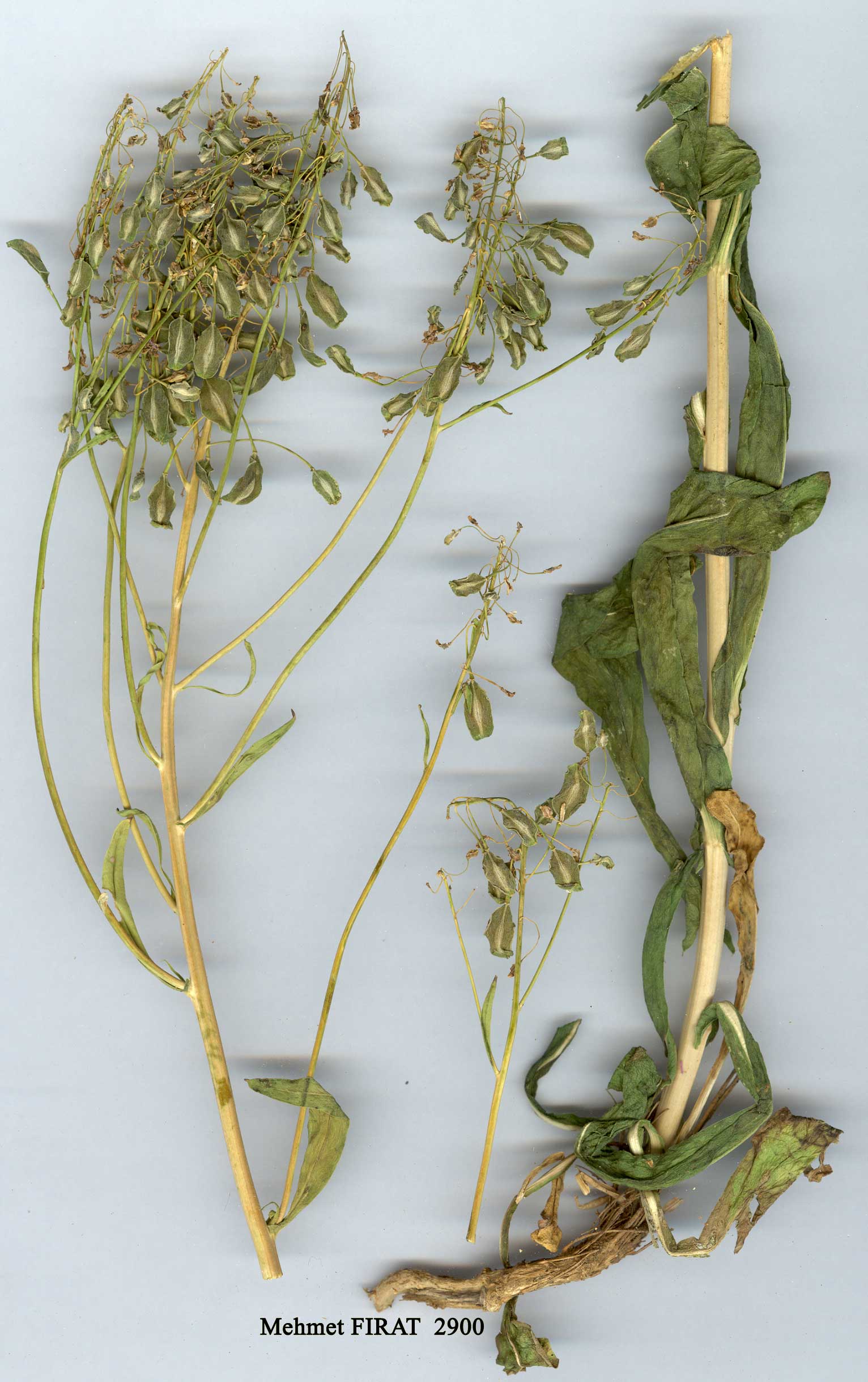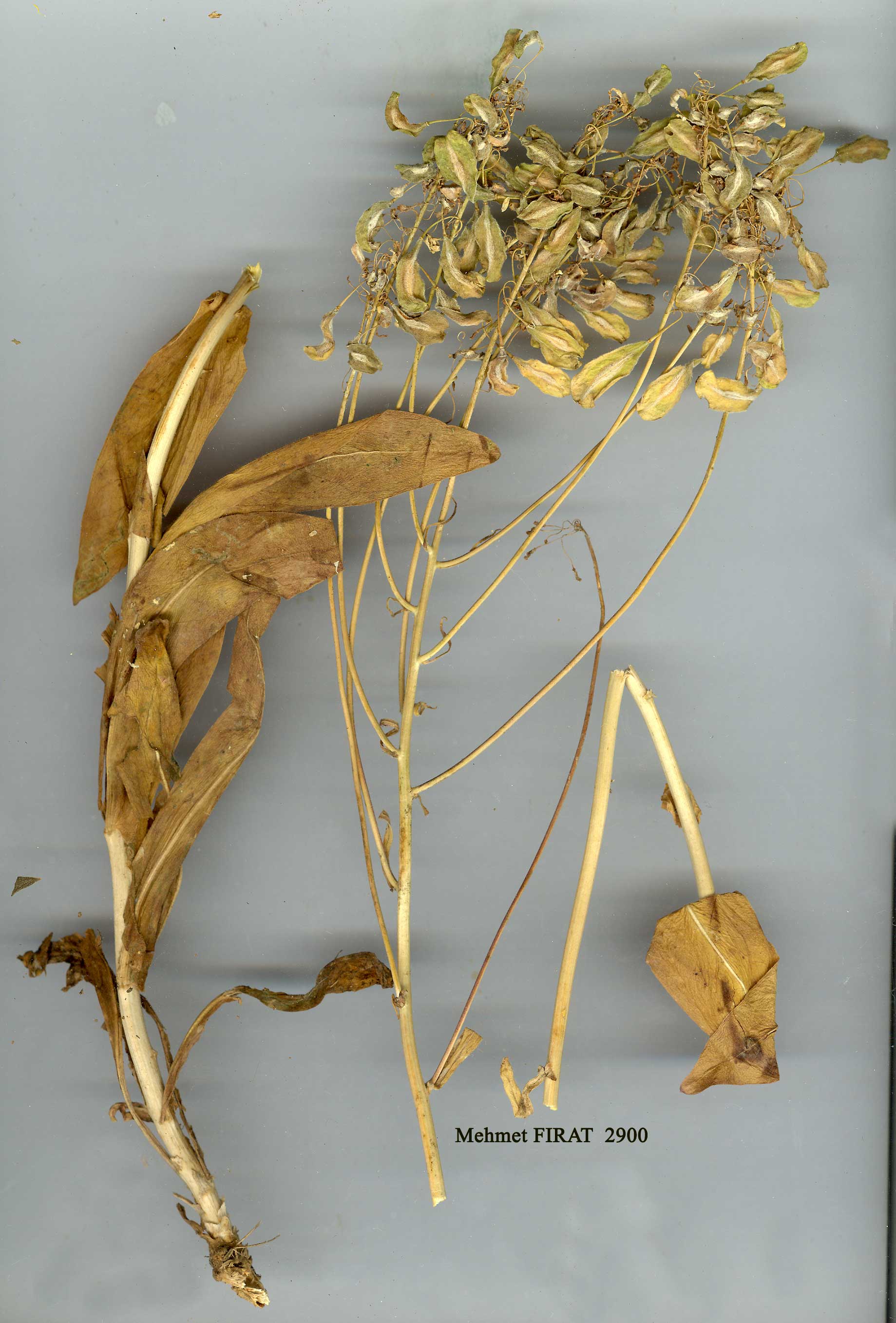 Perennial. Stems 20-40 cm, densely hirsute-villose. Leaves thinnish, villose; basal leaves oblong, entire or obscurely repand-dentate; median stem leaves narrowly oblong, subentire. auricles ovate-oblong. Flowers 4-5 mm, sepals pilose. Fruits densely tomentose-villous (hairs hiding the loculus), 10-25x4-7 mm, usually tapering below, with a thick narrow wing on either side of loculus (some-times obsolescent), constricted above the loculus and widening out into an obo-vate or broadly spathulate, emarginate, terminal wing. Ft. 4-5. Rocky slopes (generally limestone), 960-2000 m. Type: [Turkey Co Adiyaman] Besnie (Besni), Aucher 213 (holo. G! iso. W!). Anti-Taurus and adjacent ranges. S. Armenia, Bakker Maaden, Noë (type of l. aucheri var. vellerifera)! 35 Kayseri: Mt. Argèe (Ercias Da.) Bal. 452! B6 Maraş: Binboğa Da., Işik Da., D. 20090 (fr. 25 x4 mm)! Ahir Da., 960 m, Balls 912 (type of l. eriocarpa)! Seyhan: Hadjin [Saimbeyli] to Karakilisse, Post 1906: 253! Malatya: d. Besni, 1 km S of Perveri, 1260 m, Hub.-Mor, 13779. B7 Malatya: Erhenek, 1500 m, Balls 2314! C7 Adiyaman: Nemrutdağ nr. Kahta, 2000 m, Hand.-Mazz, 437! Endemic; Ir.-Tur. element. Very variable in the length of its fruits and in the development of the wing. Short-fruited variants approach I. undulata, which differs, however, in its broad, membranous wing. |