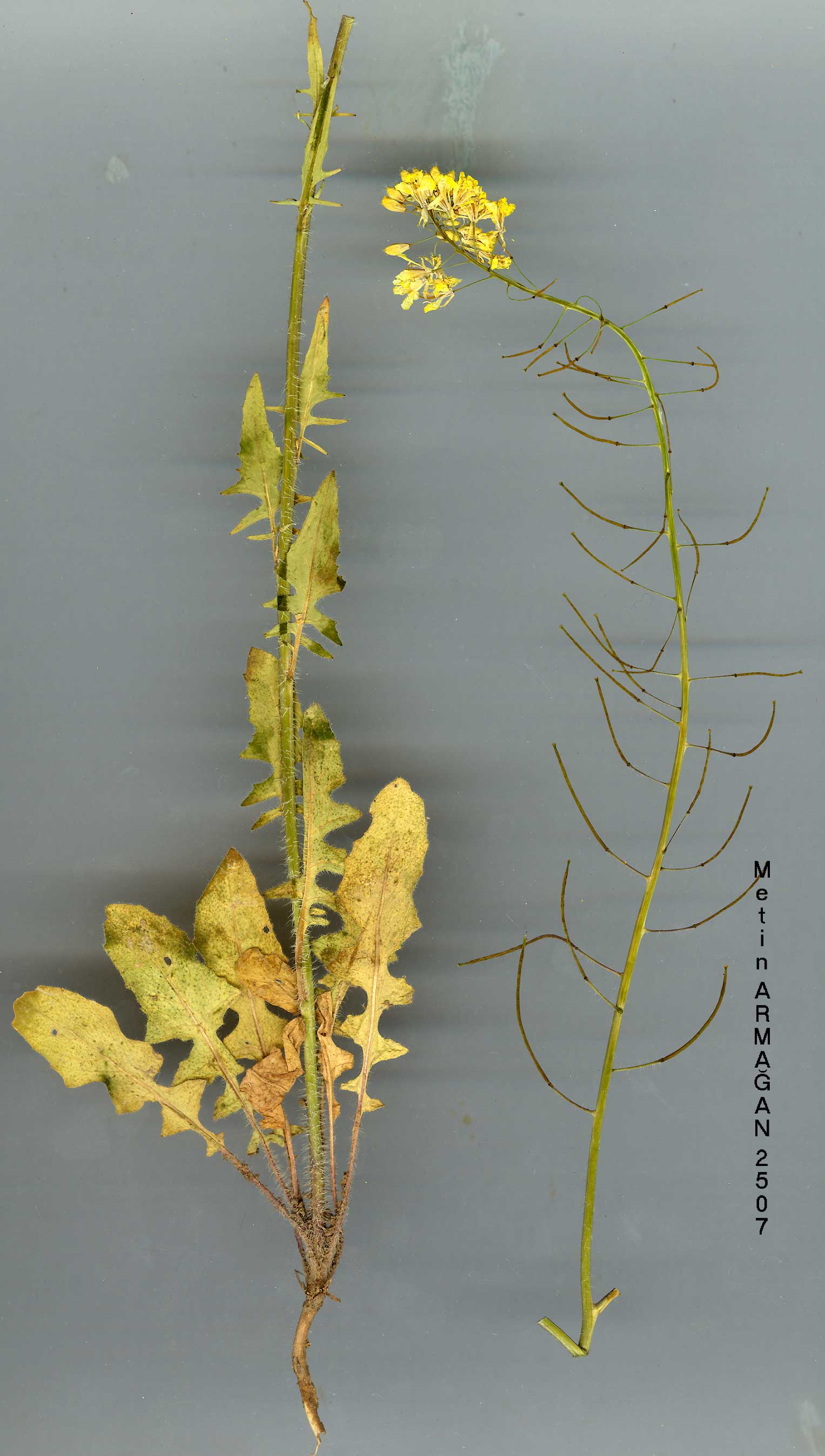 | S. loeselii L., Cent. PL 1: 18, n. 49 (1755). Syn: S. glabratum Schulz, op. cit. 99 (1924)! I?: Fiori, I? Fl. Ital. 1: t. 1350 (1899). Annual, biennial or perennial, 20-100 cm, with an indumentum of long down-wardly directed white hairs, or glabrous. Basal leaves not rosette-forming, lyrate-pinnatipartite with a large hastate or triangular terminal lobe. Cauline leaves with hastate-lanceolate terminal lobe and 2-3 pairs of lateral lobes. Petals 5-7 x 2.5-3.5 mm, bright yellow; blade broad-obovate with a long narrow claw. Fruit-ing pedicels 6-12 mm, erect-spreading. Siliquae 10-35(-46) x c. 1 mm, straight or curved; valves thin-walled, thinly 3-nerved; style c. 0.5 mm; stigma deeply bi-lobed. Seeds slightly papillose. Radicle incumbent or oblique. Fl. 3-6. Rocky slopes, roadside, near cultivation, s. 1.-1800 m. Described from Europe (Hb. Linn. 836/40, photo.!). Widespread. A1(E) Edirne: Edirne, Dingier. A2(A) Bilecik: Bilecik, Dingier. A4 Zonguldak: Amasra peninsula, sea level, Khan et al.777! A5 Amasya: Yeşilirmak valley, Cetik! A7 Gümüşane: Artabir (Ertabil), Sint. 1894: 7326! A8 Çoruh: nr. Artvin (Grossheim 4: map 175). A9 Kars: Kars to Susuz, 1800 m, D. 30647! B2 Kütahya: Gediz to Kütahya, 1000 m, D. 36940! B3 Konya: Akşehir, 1000 m, Bornm. 4070. B4 Ankara: Ankara, Warburg & Endlicher 751. B6 Malatya/Maraş: Göksu, Nâbëlek 1277. B7 Malatya: west side of Bey Da., Çaliken, 1380 m, Hub.-Mor. 10092. B8 Erzurum: Pasinler to Horasan, 1700 m, D. 29447! B9 Ağri: Ağri Da. (Grossheim 4: map 175). C5 Seyhan: Adana, Siehe. C8 Mardin: Mardin, 1200 m, D. 28333! C9 Hakkari: Hakkari, Nâbëlek 1446. C. Europe, Balkans, Caucasia, Syrian Desert, N. Iraq, Iran, Afghanistan, C. Asia. Variable in leaf shape, indumentum, fruit length and the size of the stigma. |