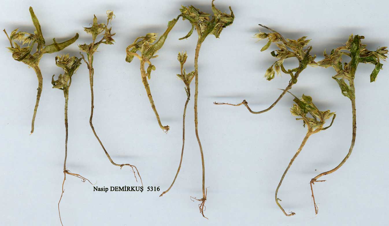 | S. hispanicum L., Sp. PI. ed. 2:618 (1762). Simple or much-branched, erect or ascending annual or perennial; sterile shoots sometimes present; flowering stems 5-15 cm. Leaves linear, semi-terete to oblong, ± plane, 4-20 mm, glandular-hairy, green or glaucous. Inflorescence a lax to ± dense, 2-4-branched cyme, each branch with 1-8 flowers; peduncles glabrous or more usually glandular-pubescent above. Flowers 5-9-merous, subsessile; sepals c. 2 mm, acute, glandular-pubescent; petals white with pink mid-vein, 4-5 mm; stamens 10, anthers purple; follicles glandular-pubescent or glabrous, white or pale pink, stellate-spreading. 1. Flowers 6-7(-9)-merous; stems much branched; styles 1 mm or more 2. Leaves semi-terete, oblong to linear var. hispanicum 2. Leaves plane, narrowly elliptic var. planifolium 1. Flowers 5-merous; stems simple below inflorescence; styles c. 0.5 mm var. semiglabrum var. semiglabrum Froder., op. cit. 3:82, f. 650-658 (1932). Fl. 6. Limestone rocks, 1700-2200 m. Type: [Turkey A8 Gümüşane/Erzurum] inter Baiburt et Erzurum in aridis elatis Tachkenfom (Taşköprü), Huet du Pavilion 1853 (iso. K! BM!). E. Anatolia. A8 Erzurum: Aras River gorge, 1700 m, Tobey 2109! B9 Van: Van to Ercek, 2100 m, D. 44413! C9 Siirt: Körkand Da., 1700 m, Frödin 1936:102! (as S. palaestinıım Boiss.)! C10 Hakkari: Şemdinli, 24 v 1966, Eiselt! Georgia, Lebanon. Ir.-Tur. element. A very variable species, especially with respect to the number of flower parts and the degree of glandulosity. S. longi-bracteatum is an extreme variant which is virtually glabrous and in which each flower is subtended by a long 'bract'. However, there is much variation in 'bract' length, even on the type sheet, and similar forms are to be found among European material. For these reasons, I have treated S. longibracteatum as a synonym of S. hispanicum s.s. Of the infrageneric taxa already described within S. hispanicum, var. semiglabrum appears to be the most distinct. This variety approaches S. hewittii but the latter may be distinguished by its larger, obtuse sepals and yellow anthers. |