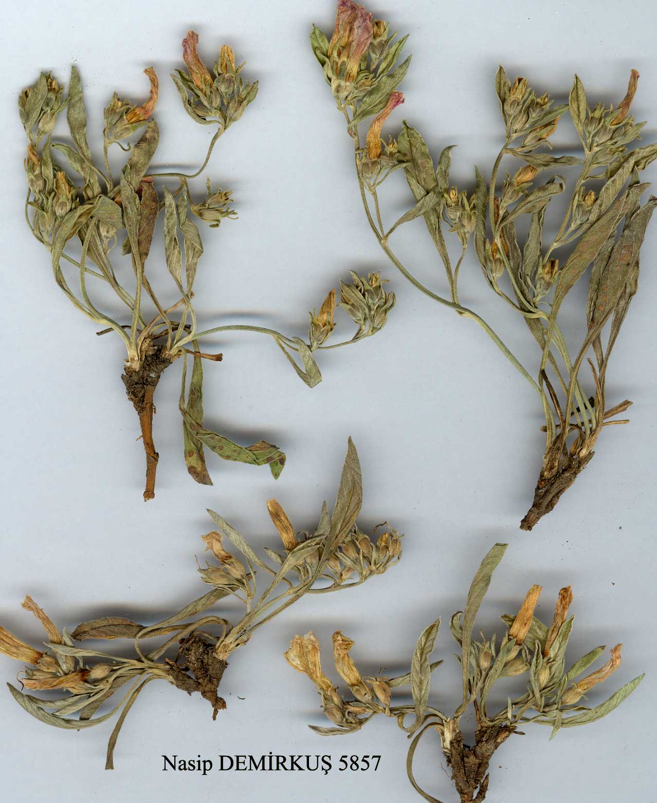 | C. lineatus L., Systema ed. 10, 2:923 (1759). Syn: C. lineatus L. var. angustifolhis Kotschy, Ins. Cyp. 285 (1865). Ic: Sa'ad, op. cit. t. 7 f. 30-38 (1967); Polunin & Smythies, Fls. S.W. Eur. 296 f. I (1973). Figure 6, p. 201. Woody-based sericeous, procumbent to ± erect, 3-30 cm perennial, often with creeping roots. Leaves linear-elliptic, elliptic, linear-oblanceolate to broadly oblanceolate, bluntly acute to acute, rarely obtuse. Flowers axillary and terminal, solitary or in 2-7-flowered cymes. Outer sepals sericeous, ovate, obovate or oblong, acute to acuminate. Corolla pink, occasionally white, 15-25 mm. Fl. 4-7. Artemisia steppe, under Quercus, rocky slopes, bare banks, streamsides, dry pasture, fallow land, 800-2135 m. Described from Spain, Sicily and Mediterranean coasts (Lectotype Hb. Linn. 218/43). Mainly Inner Anatolia, less common in N. & S. Al(E/A) Çanakkale: Dardanelles, Forsskal. A2(E) Istanbul: Karaburun, nr lighthouse, Bauer et al. 3213 (!). A2(A) Bursa: nr Tschakerikoi (Cakirli), Pichler 89! A3 Bolu: N.W. of Beypazari, nr Sekli, Kühne 404! A4 Çankiri: Çankiri, 800 m, D. 21519! A5 Kastamonu: Tosya, nr Çubuk Çeşme, Sint. 1892:5258! A6 Tokat: Çamlibel Da. from Artova to Yildizeli, 1450 m. Hub.-Mor. 14369. A8 Gümüşane: nr Bayburt, 1 vii 1892, Boıırgeau! A9 Kars: 8 km from Kars to Susuz, 1800 m, D. 30591 ! B2 Uşak : 8 km from Uşak to Güre, 800 m, Coode & Jones 2538! B3 Eskişehir: Ankara to Sivrihisar, 32-48 km from Polatli, 1000 m, Dudley (D. 36020)! B4 Ankara: Çankaya (nr Ankara), 915 m. Balls 2353! B5 Kayseri: Bakir Da. above Kisge, 1400 m, D. 19247! B6 Malatya: Elbistan to Darende, B.Post 509! B7 Elaziğ: 19 km from Elaziğ to Pertek, D. 29164! B8 Erzurum: Tek Da. (Palandöken Da.), vii 1853, 1830-2135 m, Hııet! B10 Ağri: nr Doğubayazit, 1550 m, D.M.Brown 554! C2 Afyon: 25 km from Burdur nr Keçiborlu, 800-900 m, Dudley (D. 35623)! C3 Burdur: Bucak, 915 m, Little 202! C4 Konya: Konya to Çumra, Küçük Köy, 980 m, Helbaek 2413! C5 Niğde: Ala Da., Emli Boğazı', 1980 m, Wood & Gibson 148! C6 Gaziantep: Gaziantep, 925 m, Balls 856! C10 Van: 22 km from Başkale to Hakkari, 2000 m, D. 44669! N. Africa, S. Europe, Cyprus, Caucasia, W. Syria, Syrian Desert, N.W. & W. Iran, eastwards to Turkestan. Although this widespread species grows elsewhere in the Mediterranean, in Turkey its distribution is largely Irano-Turanian. Var. angustifolius, retained by Sa'ad (op. cit. p. 130), appears to be a smaller, narrower-leaved form which is possibly a habitat modification. |