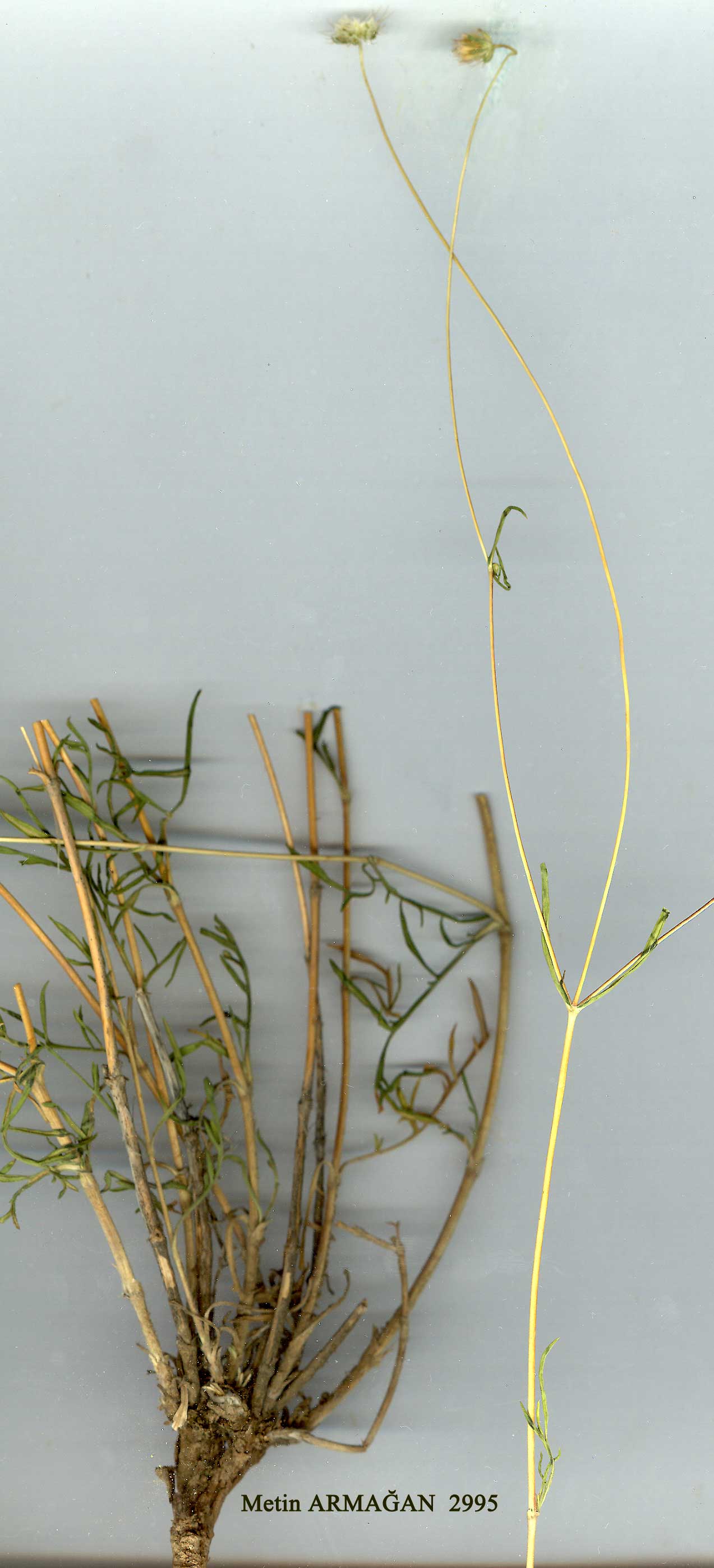 | S. argentea L., Sp. PI. 100(1753). Syn: S. ucranica L., Sp. PI. ed. 2:144 (1762); S. eburnea Sm. in Sibth. & Sm., Prodr. Fl. Graec. 1:82 (1806); S. tenuifolia Willd. in Roemer & Schultes, Syst. Veg. 3:521 (1818); S. argentea L. var. tmolea Boiss. & Bal. in Boiss., Diagn. ser. 2(2): 124 (1856); S. ucranica L. var. eburnea (Sm.) Boiss., Fl. Or. 3:139 (1875). Ic: Reichb., Ic. Fl. Germ. 12: t. 689 (1850) as Asterocephalus ucranicus (L.) Sprengel. Figure 18, p. 605. Slender erect biennial or perennial with glabrous or pubescent and setose stems 15-60 cm tall. Lower leaves 1-2-pinnatisect, segments linear; upper leaves usually simple, linear. Involucral bracts 6-8, linear, longer or shorter than flowers. Capitula 1-2•3 cm diam., radiant; flowers white or cream, sometimes flushed mauve. Fruiting head spherical. Involucel 2-2•5 mm, pilose; pits oblong, 1 mm long; ribs between pits not sulcate; corona 1-1•5 mm with 20-26 excurrent nerves. Calyx very shortly stipitate; setae 4•5-6 mm. Fl. 5-9{-10). Waste places, fields, steppe, stony slopes, s. 1.-2500 m. Described from the Orient (Hb. Linn. 120/26 & 27, photos!). Widespread. A1(E) Edirne: 3 km from Havsa to Edirne, 100 m, McNeill 204! A1(A) Çanakkale; Çanakkale to Truva, s.l., Hub.-Mor. 16972. A2(E) Istanbul: Halkali, 13 vii 1895, Azn.! A2(A) Istanbul: nr. Terkos G., A. Baytop 12163! A3/4 Bolu: Ala Da., 700 m, Khan et al. 524! A4 Ankara: 13 km S. of Ankara, M. Zohary & Plitm. 28235! A5 Amasya: Amasia, 500 m, Görz 871! A6 Sivas: Yildiz Da., 1400 m, Tobey 2343! A7 Gümüşane: Gümüşane, 1070 m, Balls 2012! A8 Gümüşane: Bayburt, Bourgeau. A9 Erzurum: 17 km from Horasan to Karakurt, in Aras gorge, 1500 m, D. 46475! Bl Izmir: nr. Smyrna (Izmir), Bal. 237. B2 Manisa: Tmolus at Bozdagh, Boiss.! B3 Afyon: Afyonkarahissar, 29 vi 1907, St.-Lagerl B4 Konya: d. Cihanbeyli, Tarsakam G., 1000 m, Khan et al. 758! B5 Kayseri: Ali-Dagh, 7 km S.E. of Mont-Argeè (Erciyas Da.), Bal952! B7 Elazığ: Kharput (Harput) Sint. 1889:783! B8 Erzurum: 14 km from Erzurum to Pasinler, D. 47448! B9 Bitlis: Tatvan, 1900 m, Tong 57! B10 Ağri: 16 km W. of Doğubaya-zit, 1210 m, Furse 3543! Cl Aydin: at foot of mtns. Mesogis (Aydin Da.), nr. Tire, Bornm. 1906:9602! C2 Antayla: Gömbe, 1150 m, Sorger 65-25-86! C3 Antalya: Oküz Gozü Karakol, between Elmali and Antalya, 1300 m, D. 14007! C4 Konya: d. Ermenek, 1300-1400 m, D. 16159! C5 Niğde: Gümüşköy, 1750 m, Gözler 12055! C6 Gaziantep: nr. Nizip, 530 m, M. Zohary 112! C7 Urfa: Mardin, Kasmi, Sint. 1888:1095! C8 Mardin: Mardin, Sint. 1888:889! S. Europe (E. from France), S. Russia, Caucasus, Crimea, W. Syria, N. Iraq, N. Iran. One of the most common species of Scabiosa in Turkey and one of the most variable. It varies particularly in habit, degree of hairiness, dissection of leaves and length of involucral bracts. |