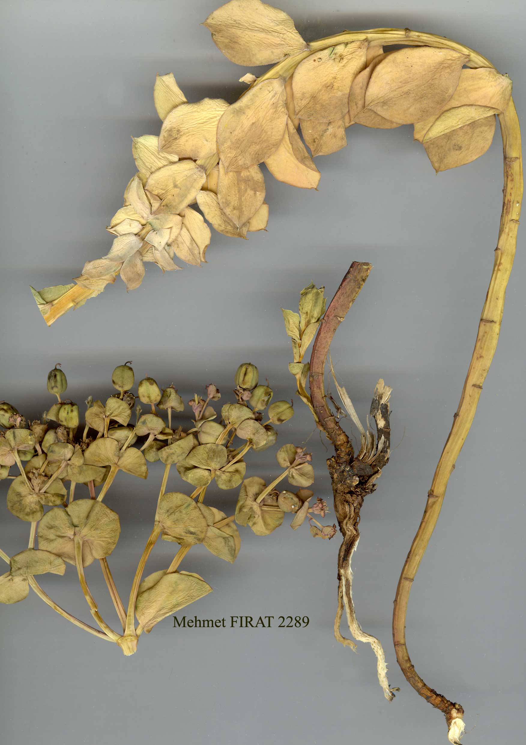 | E. denticulata Lam., Encycl. 2:435 (1788). Syn: E. rotundata Hochst. in Lorent, Wanderungen 344 (1845); E. cilicica Boiss., Diagn. ser. 2(4):88 (1859). Ic: Boiss., Ic. Euphorb. t. 119 (1866); Rech. fil. & Schiman-Czeika in Rech. fil., Fl. Iranica 6: t. 20 (1964). Figure 17. Map 71. Robust, glabrous, glaucous, decumbent or almost prostrate perennial. Stems several, simple, arising from stout woody stock. Lower cauline leaves obovate, 1.5-5 x 1-3 cm, often purple-tinged, obtuse or subacute, apex mucronate, margin ± entire, base cuneate or rounded; upper cauline leaves suborbicular or ovate, to 4 cm broad, not mucronate. Ray-leaves suborbicular to reniform, base shallowly cordate. Raylet-leaves reniform or transversely ovate, 1-2 x l-2.5(-3) cm, base rounded to cordate. Rays 5(-8), to 3 times dichotomous; axillary rays 0-2. Glands pectinate, crimson. Fruits ovoid-conical, trigonous, 7-8 mm diam. Seeds ovoid-quadrangular, 4-5 mm, tuberculate-rugulose, grey or brown; caruncle terminal, conical, 1.5 mm. Fl. 4-8. Quercus woods, scrub, rocky limestone and igneous slopes, steppe, ruins, 800-3050 m. Type: Aubriet's illustration in P, reproduced in Ann. Mus. Hist. Nat. (Paris) 12:115, t. 15 (Aug. 1808), and in Desf., Choix. PL 89, t. 68 (Nov. 1808). Typotype: Cappadocia, Tournefort. Inner Anatolia & Anti-Taurus. A6 Tokat: Erbaa, 900 m, Tobey 654! A7 Gümüşane: Gümüşane, Bourgeau 241! A8 Gümüşane: Maden, Sint. 1894: 7306! B5 Niğde: Hasan Da. above Taşpinar, 1800 m, D. 18986! B6 Kayseri: Binboğa Da. S.W. of Sariz, 2300 m, Rix et al. 675! B7 Tunceli: Munzur Da. above Ovacık, 2500 m, D. 31199! B8 Bitlis: Kambos Da., 1850 m, D. 23399! B9 Van: Pelli Da., 2000-2500 m, Rix et al. 726! C5 Adana: Gorumse (Gürümze), 1650 m, Kotschy 1859:97! C6 Maraş: Ahir Da., 1300-1500 m, D. 27392! C9 Siirt: above Şirnak, 1400-1500 m, D. 42607! C10 Hakkari: nr Ziri, S. of Cilo Da., 1830 m, Trelawny 1843! Syrian Desert?, N. Iraq, N.W. & W. Iran, Soviet Armenia. Ir.-Tur. element. E. pectinata Albov in Bull. Herb. Boiss. 2:640 (1894), from A8 Çoruh: Artvin (Radde N2 in Herb. Deless., G), may only be a somewhat aberrant form of E. denticulata. |
