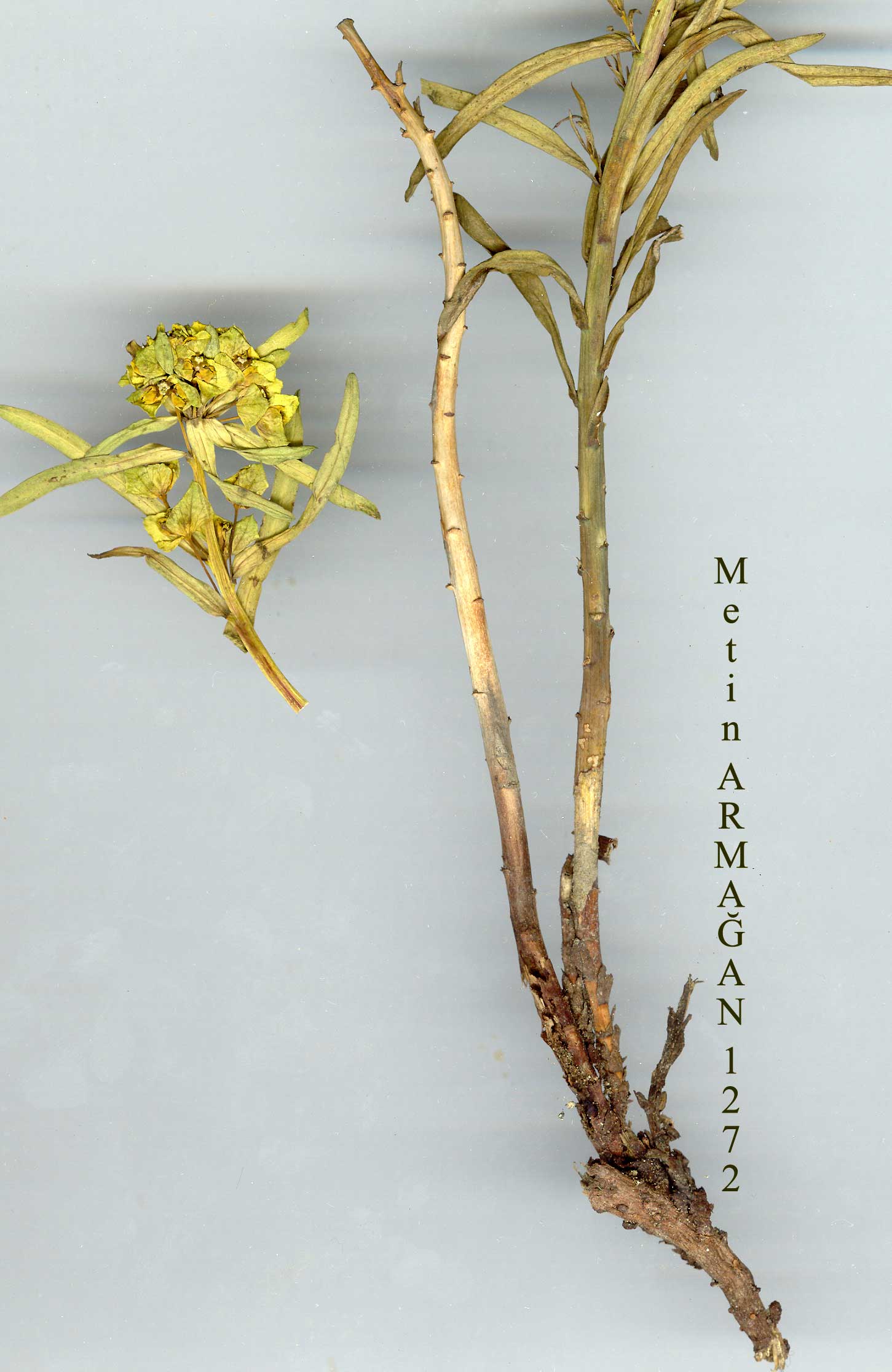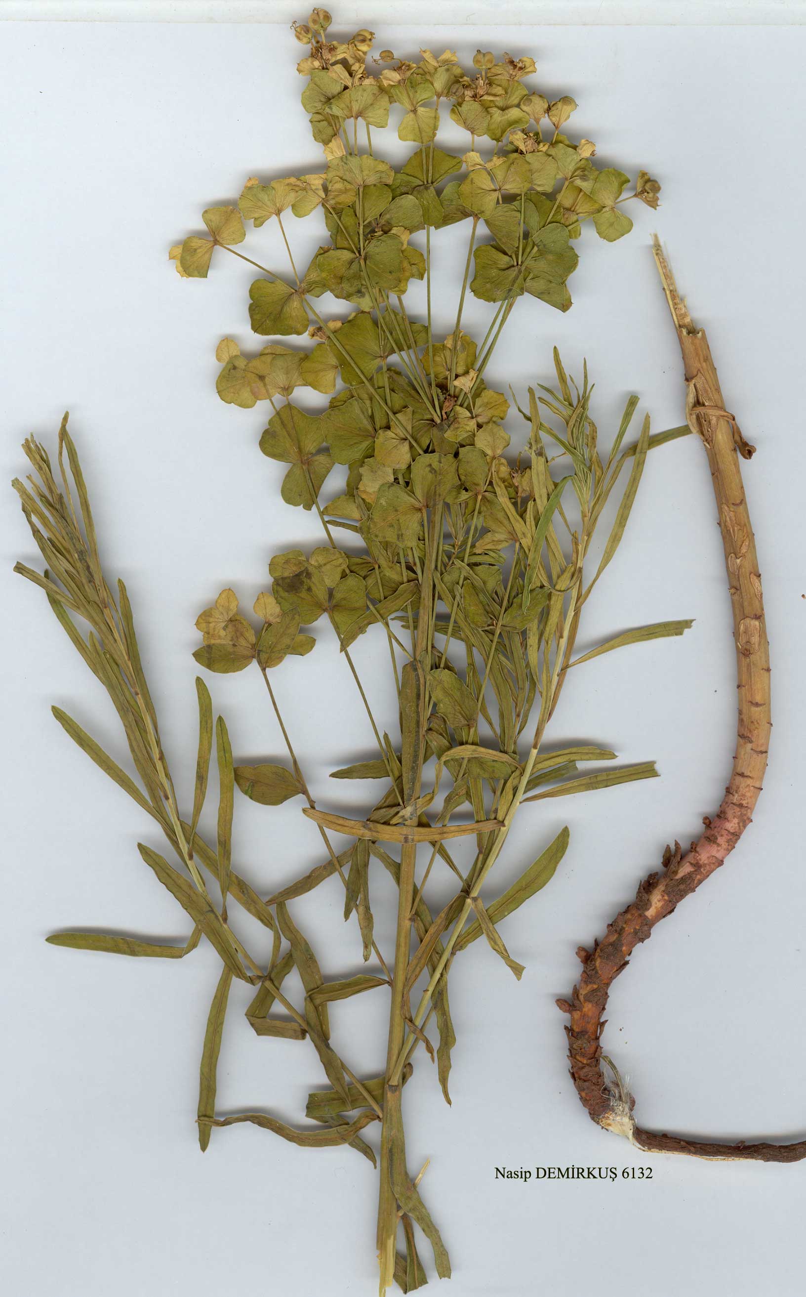 | E. virgata Waldst. & Kit., Pl. Rar. Hung. 2:176, t. 162 (1804) non Desf. (1804). Syn: E. uralensis Fischer ex Link, Enum. Hort. Berol. Alt. 2:14 (1822); E. tommasiniana Bertol., Fl. Ital. 5:78 (1842)! E. virgata Waldst. & Kit. var. orientalis Boiss. in DC, Prodr. 15(2): 160 (1862)! E. boissieriana (Woronow) Prokh. in Fl. URSS 14:445 (1949)! Ic: Fiori, Ic. Fl. Ital. f.2615 (1901); Hegi, I11. Fl. Mittel-Eur. 5(1): t. 1782, 1783 (1925). Glabrous perennial. Stems several, to 1 m, arising from a woody stock; axillary shoots to 13, arising near middle of stem. Caulirte leaves linear to linear-lanceolate, 1.5-10(-12) x 0.1-l(-1.5) cm, acute or obtuse, entire; leaves of axillary shoots narrower. Ray-leaves linear-lanceolate to ovate. Raylet-leaves ovate-rhombic, ovate-deltoid or reniform,.5-15(-l8) x 5-20 mm, apex acute to obtuse, mucronate, base cuneate, rounded, truncate or shallow-ly cordate. Rays 6-15(-30), once or twice dichotomous; axillary rays 2-20 (-35). Glands medium- to long-horned. Fruit deeply trilobate, 4-5 mm diam., granulate. Seeds ovoid, 2 mm, smooth, grey, caruncle small. Fl. 4-9. Quercus forest and scrub, steppe, grassland, rocky slopes, streamsides, marshes, ditches, fields, roadsides, 1000-3000 m. Type: [Hungary, N. Jugoslavia] si altiora loca montosa demas, per omnem fere Hungariam, Croatiam et Sclavoniam locis siccis, Waldstein (holo. PR, photo E!). N., S., E. & adjacent C. Anatolia. A4 Kastamonu: above Küre, 1220 m, D. 21635! A5 Kastamonu: Tosya, Sint. 1892:4890! A6 Sivas: Sariyar, N.E. of Çirçir, 1500-1700 m, Sorger 69-57-15! A7 Gümüşane: Gümüşane, Bourgeau 143! A8 Erzurum: 75 km N. of Erzurum, 2400 m, Walton 19! A9 Kars: 10 km from Sarikamiş to Karakurt, 2050 m, D. 46508! B6 Sivas: Zara to Sivas, 1500 m, Stn. & Hend. 5320! B7 Tunceli: Pülümür to Selepur, 1850 m, D. 31582! B8 Erzurum: 10 km N. of Hinis, 1630 m, D. 46237! B9 Bitlis: Nemrut Da., 3000 m, Tong 144! B10 Kars: N.E. slope of Ağri Da., below Serdar Bulak, 1900 m, D. 43798! C4 Içel: 40 km from Mut to Kirobasi, Cümelek, 1100 m, Hub.-Mor. 9961. C10 Hakkari: Yüksekova, 1950 m, Duncan & Tait 184! From France eastwards through C. Europe and the N. Balkans to Siberia and Pakistan. Narrowly linear-leaved plants have been referred to E. uralensis Fischer ex Link, and robust lanceolate-leaved plants to E. boissieriana (Woronow) Prokh., but these 'species' merely represent extreme states in the ± continuous variation of E. virgata. In Europe, E. virgata merges with E. esula L., and has been regarded there as a subspecies of the latter. Huet du Pavilion's record of E. esula from Erzurum, cited by Tchihatcheff (Asie Min. Bot. 1:163, 1860), is undoubtedly referable to E. virgata. |