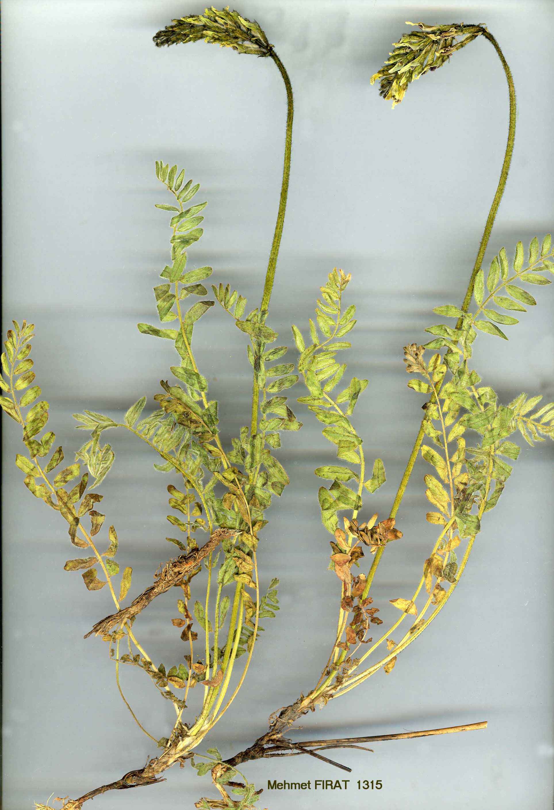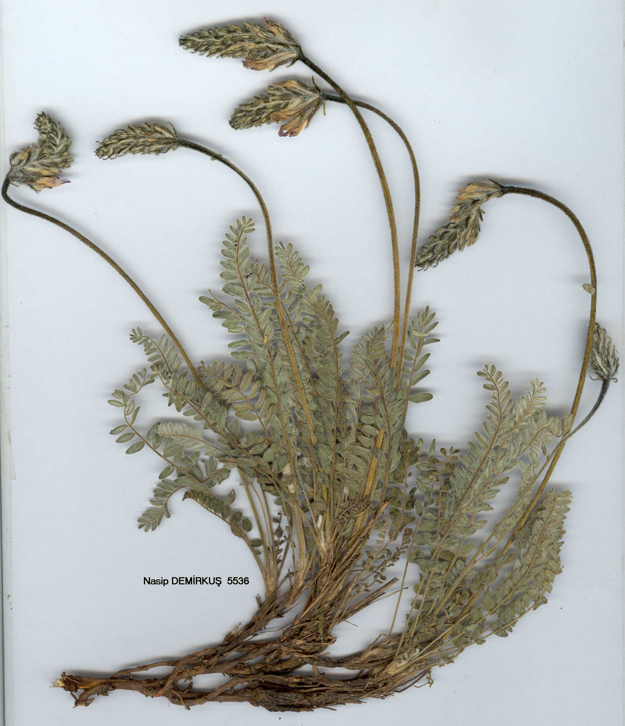 | A. bashkalensis Chamberlain in Notes R.B.G. Edinb. 29: 291 (1969). Scapose perennial with a woody base. Leaves 6-7 cm; leaflets 5-7 mm, broadly elliptic, simple-lanate, 8-16-paired: stipules c. 8 mm. lanceolate with a subulate tip. Peduncles 8-11 cm. Flowers sessile, in dense cylindrical c. 30-flowered spikes,elongating on maturity. Bracts c. 5 mm, lanceolate. Calyx c. 10 mm, tubular, shortly black- and white-villous; teeth 1-2 mm, unequal. Corolla pinkish-mauve; standard c. 18 mm. Legume unknown. FI. 6. Grassy mountain steppe, 2800 m. Type: Turkey B9 Van: Ispiriz Da., Güzeldere Tepe, 20 km NNW of Başkale, 2800 m, Cheese & Watson 1446 (holo. K!). Endemic. Only known from the type. Probably distantly related to A. tauri-coliis but mature fruits are required in order to confirm its true affinities. |