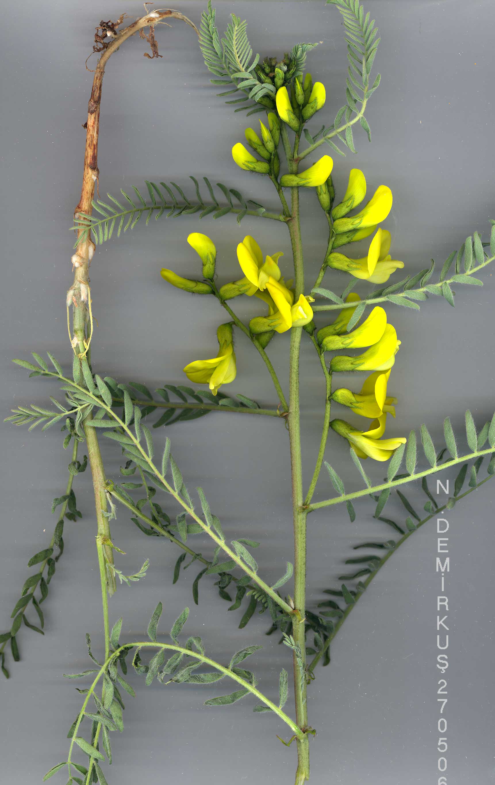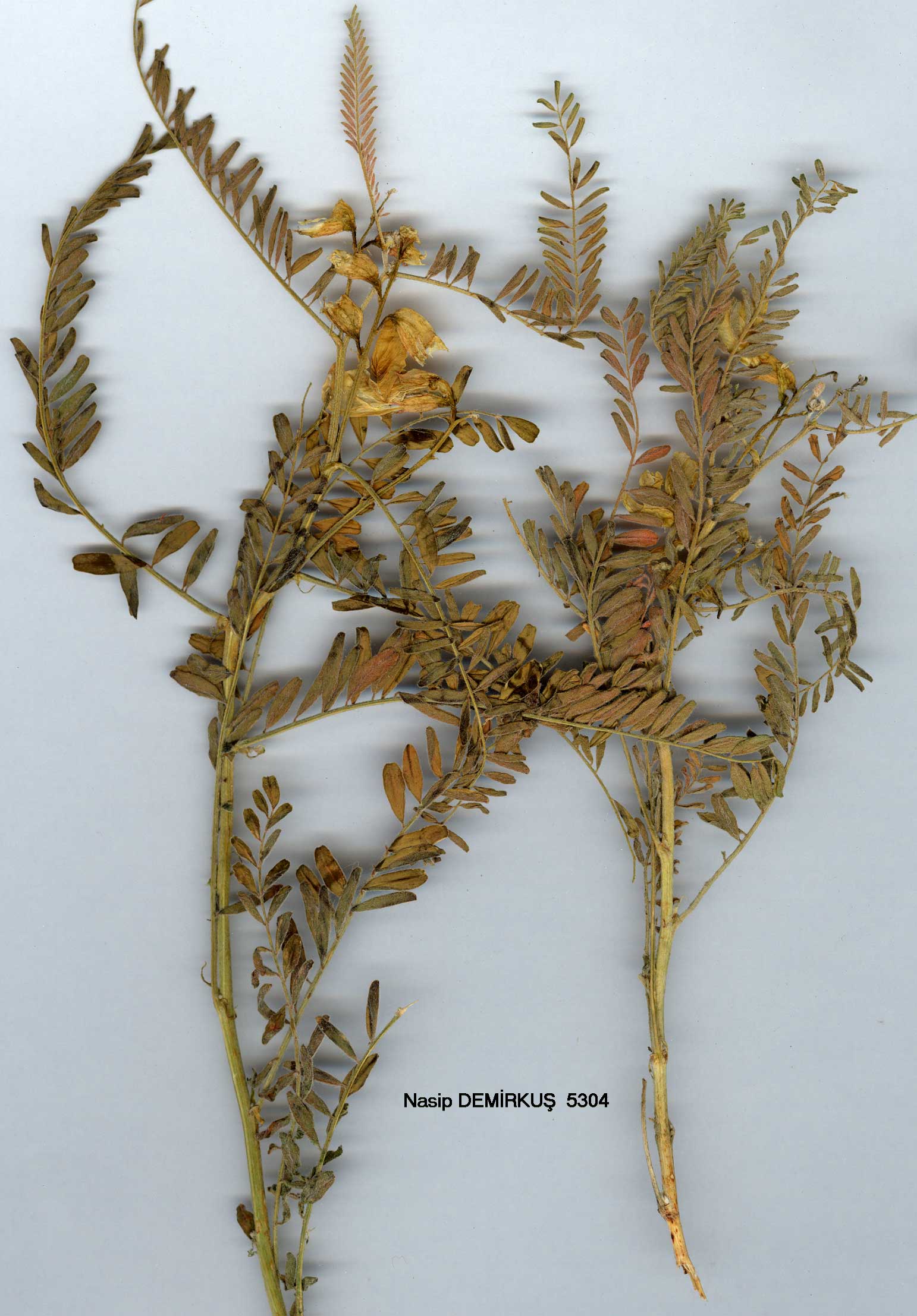 | A. caraganae Fisch. & Mey. in Hohen., Talysch Enum. 108 (1838). Map 23, p. 95. Erect caulescent perennial; stems sparsely strigose with simple white, or mixed black and white, hairs. Leaves 7-12 cm; leaflets obovate to oblong-linear, obtuse or retuse, glabrous above, ± spreading, simple-white-pilose below, 9-22-paired; stipules 4-7 mm, triangular-lanceolate, united. Flowers in 3-6-flowered racemes. Bracts 2-3 mm, linear. Bracteoles absent. Calyx 8-10 mm, tubular-campanulate, sparsely simple black- and white-adpressed-pilose; teeth 2-3 mm. Corolla bright yellow; standard 18-24 mm, glabrous. Legumes 10-20 x5 mm, ovoid to linear-oblong, simple white adpressed-pilose, tuberculate; beak 0.5-2.0 mm. Fl. 5-6. Fields, steppe, 1050-2300 m. Type: [Azerbaijan: Talysch] In collibus siccis prope pagum Färsikenti in tr. Suwant, Hohenacker (LE!). E. Anatolia. B6 Maraş: Çardak to Elbistan, 1200 m, D, 27632! B7 Elaziğ: 15 km from Elaziğ to Malatya, 1050 m, Hub.-Mor. 8991! B8 Erzurum: 28 km from Varto to Hinis, 1700 m, D. 46268! B9 Bitlis: by Van G., 24 km W of Erciş, 2000 m, Cheese & Watson 1405! Van: 5 km S of Bendimahi, between Ercis & Van, 1750 m, D. 44212! B10 Ağri: 27 km from Tutak to Patnos, 1650 m, D. 43985! C9 Hakkari: Zap Gorge, 12 km from Hakkari to Van, 1250 m, D. 44864! C10 Hakkari: Yüksekova, 1950 m, 23 v 1966, Eiselt! Soviet Armenia & Azerbaijan, N. & C. Iran.Ir.-Tur. element. |
