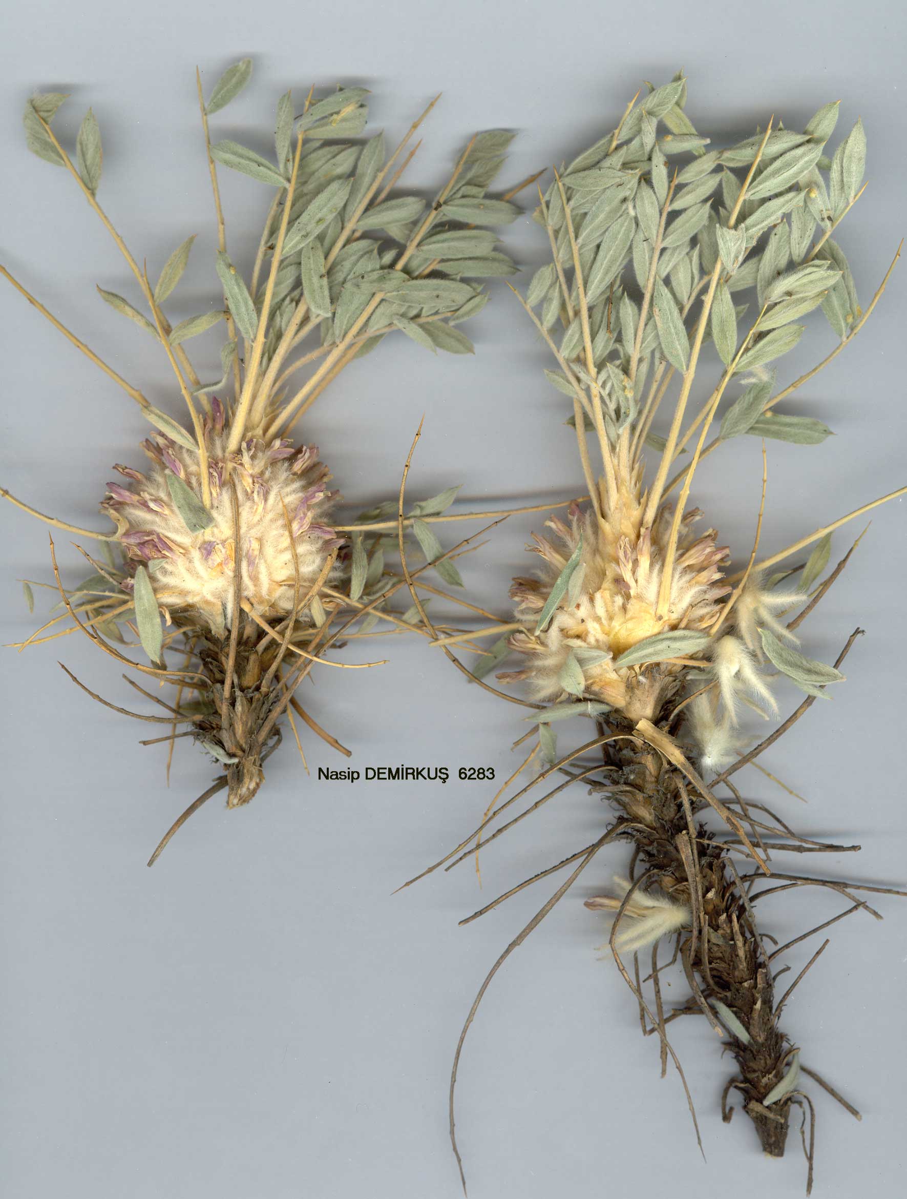 | A. compactus Lam., Encycl. 1:322 (1783). Ic: DC, Astrag. t. 32 (1802). Dwarf cushion-forming shrub, 10-15 cm. Leaf rachis spiny, 4-6 cm, straight or incurved. Leaflets 10-15 mm, oblong to narrowly elliptic, spine-tipped, simple-grey-tomentellous, sometimes with a few long hairs, 4-6 paired. Stipules 10-13 mm, triangular-lanceolate, villous. Flowers 4-5 per leaf axil. Inflorescence globose, c. 3 cm diam., 15-50-flowered. Bracts (8-)10-13 mm, oblong to ovate, navicular or plain, pilose at the apex. Bracteoles absent. Calyx 13-16 mm, densely white-villous; lobes divided to base. Flowers pale pink with cream centre; standard (16-)18-20 mm. Fl. 7-8. Steppe, hilly slopes, 1200-1850 m. Type: 'Armenia Turcica', Tournefort. Inner Anatolia. A7 Gümüşane: Gümüşane to Bayburt, 3 km from Kale, 1300 m, Hub.-Mor. 15071! B5 Yozgat: nr. Yozgat, 8 vii 1961, Chamberlain! B6 Sivas: nr. Sivas, 1250 m, M. Zohary 292! B7 Erzincan: 7 km N of Pülümur, 1850 m, M. & D. Zohary 153/1! Endemic; Ir.-Tur. element. Allied to A. strictifolius. Boissier describes A. compactus as having smaller calyces (12 mm) and standards (16 mm) than the specimens cited above. As far as we can tell, however, our material belongs to A. compactus. The type description of A. karsicola Širj. & Bornm. in Feddes Rep. 53:221 (1944) (A. karsianus Širj. & Bornm. in Feddes Rep. 52:10 (1943) non Bunge, 1869), which was described from A9 Kars, prope st. viae feroviae Promezhutotshnaja, Roop, agrees with our concept of A. compactus Lam. |