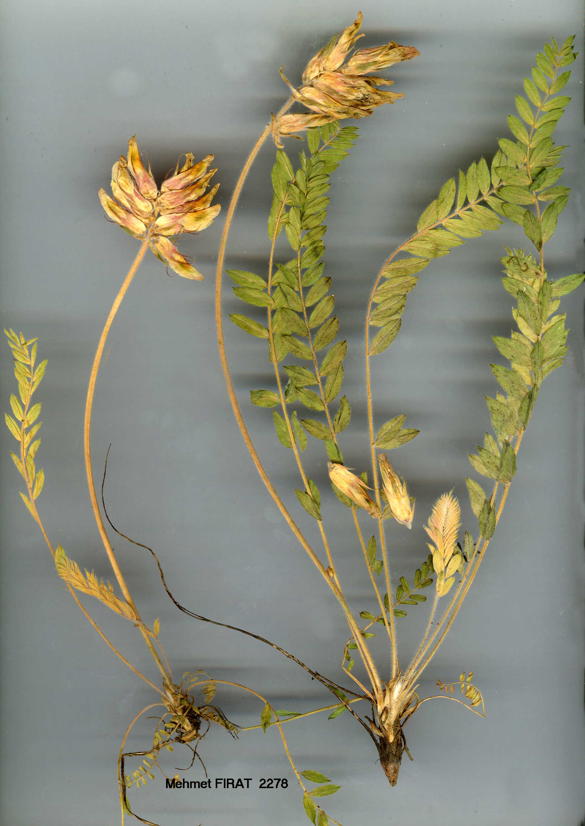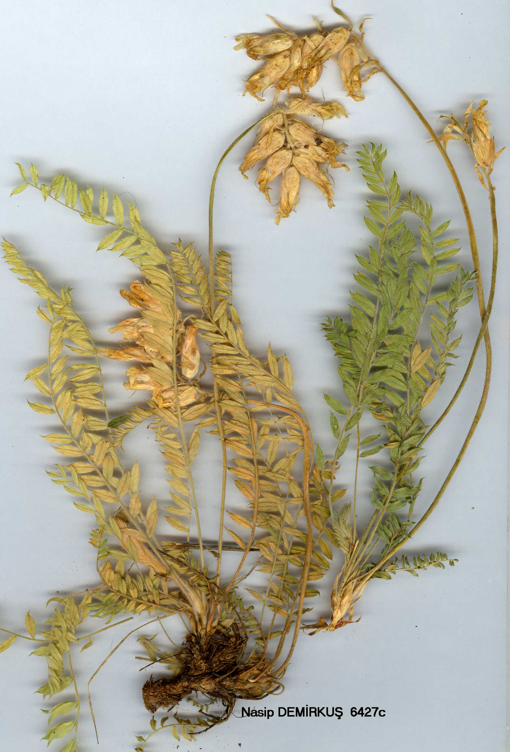 Leaves 10-20 cm, imparipinnate; leaflets 8-14 mm, elliptic, acute, mucronate, ±spreading long simple-pilose, 15-18-paired; stipules 12-15 mm, lanceolate, white-ciliate, jointed at the base. Peduncles spreading-hairy, equalling or exceeding leaves. Flowers fragrant, in dense ovoid 8-18-fiowered racemes. Bracts 10-15 mm, lanceolate, white-hairy. Bracteoles 4-8 mm, linear. Calyx 14-16 mm, tubular-campanulate, becoming slightly inflated, sparsely white simple-pilose; teeth 7-8 mm, triangular-linear. Corolla cream; standard 22-26 mm, glabrous. Legumes unknown. Fl. 5-6. Mountain pasture, scrub, 1900-3200 m. Type: [Turkey] B9 Van: N. side of Erek Dağ, above Değirmenköy, 3200 m, rocky igneous slopes and meadows, 6 vi 1966, Davis 44465 (holo. E!). S.E. Anatolia. B9 Bitlis: Kisvak Da., 9 km NE of Tatvan, 1900 m, Cheese & Watson 1299! Endemic; Ir.-Tur. element. A very distinct and beautiful species. We have not placed it in a section because it does not fit easily into an existing one, but we do not wish to describe a new section without studying all the Astragalus of the Near East and Central Asia. The sections which it approaches most closely are Hymenostegis (from which it differs in its imparipinnate leaves and bracteolate flowers), Megalocystis (from which it differs in its imparipinnate leaves), Hali-cacabus (differing in its calyx never becoming globose-inflated), and Rhabdotus (differing in its bracteolate flowers). Fruiting material is needed. |