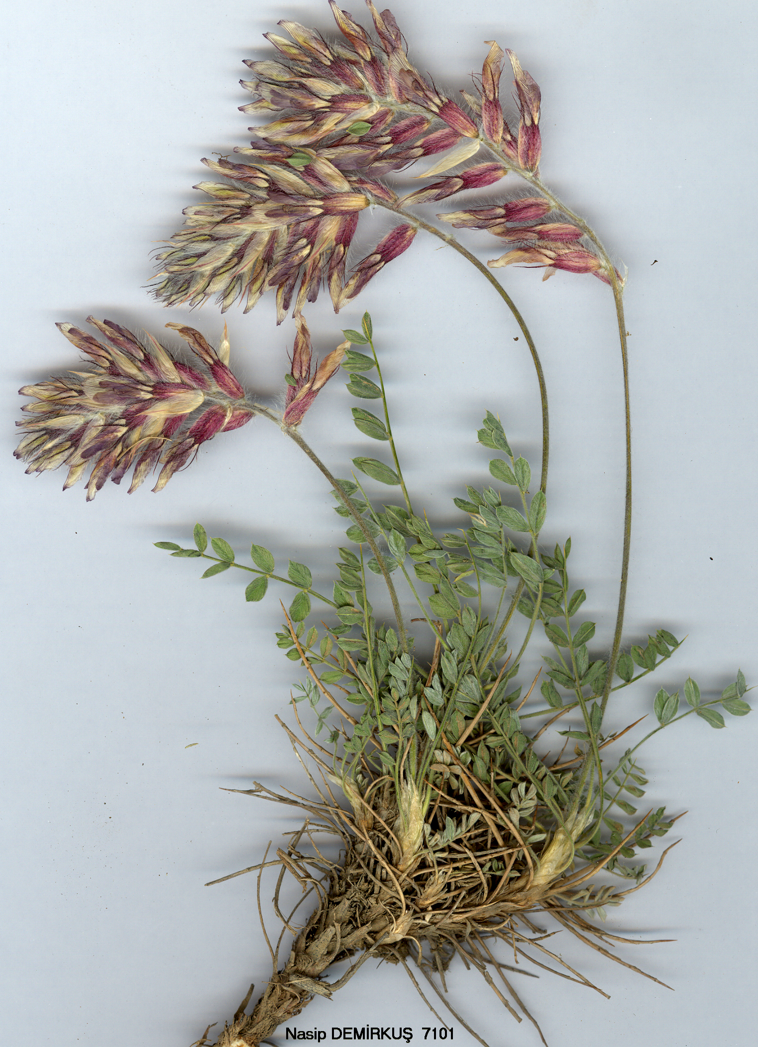 | A. eriocephalus Willd., Sp. PL 3:1333 (1802). Map 28, p. 127. Dwarf shrub. Leaves l.5-3(-5) cm; rachis spiny; leaflets 5-8 mm, elliptic, mucronate, both surfaces simple-villous, 4-7-paired; stipules 6-8 mm, triangular-lanceolate, white-hairy or glabrescent, joined for two-thirds of their length. Inflorescence globose or oblong, with 4-15 sessile flowers. Bracts 5-9 mm, lanceolate to linear, white-hairy at apex, sometimes purple-tipped. Bracteoles absent. Calyx 9-14 mm, tubular, white spreading-simple-pilose, often glabrescent towards base; teeth 4-8 mm, setaceous. Corolla pink; standard 10-14(-15) mm. Legume unknown. Fl. 6-8. Mountains, hilly steppe, 2000-3000 m. 1. Inflorescence globose; leaflets sparsely villous, especially when mature subsp. eriocephalus 1. Inflorescence oblong; leaflets densely villous subsp. elongatus subsp. elongates Chamb. & Matthews in Notes R.B.G. Edinb. 29: 295 (1969). Type: Turkey C10 Hakkari: d. Yüksekova, Sat Da., NW of Sat Gölu, 2900-3000 m, Davis 45683 (holo. E!). S.E. Anatolia. B9 Bitlis: 30 km from Nemrut Da., 2220 m, Birand & Kara-manoğlu 229! Muş: between Bulanik and Muş, 2000 m, Hub.-Mor. 10681! A specimen from B9 Ağri: between Ağri and Doğubayazit, 1750 m, D. Walton 33! has bracts which are narrowly ovate. A gathering from C10 Hakkari: 21 km from Bacirge to Yüksekova, 2230 m, D. 45231! is somewhat intermediate between the two subspecies. The leaflet indumentum is fairly dense, but the inflorescence is subglobose; the flowers also have two minute, linear bracteoles. The species is endemic to Turkey. Ir.-Tur. element. Allied to A. karabaghensis. |
