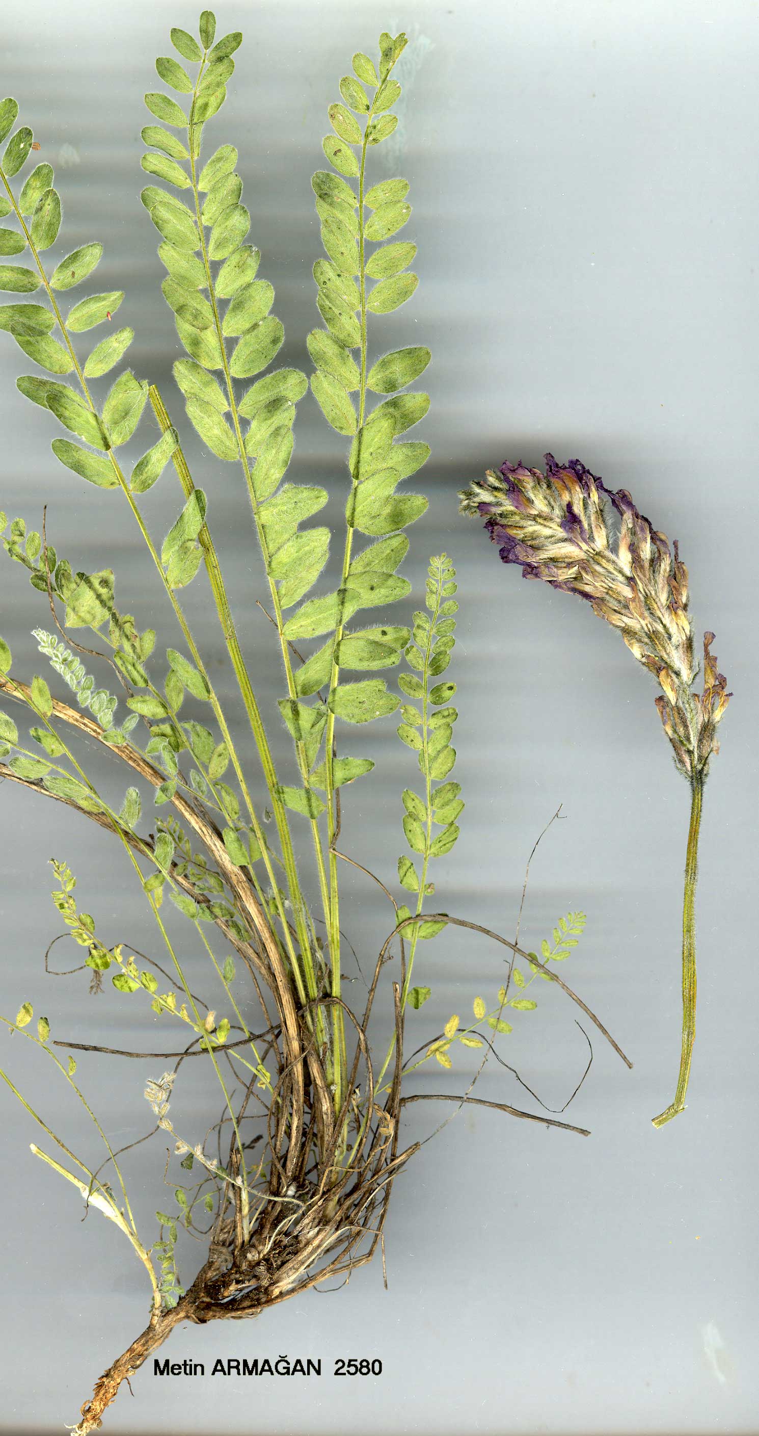 | A. mollis Bieb., Fl. Taur.-Cauc. 3:495 (1819). Syn: A. eriocarpııs Bieb., Fl. Taur.-Cauc. 2:196 (1808) non DC. (1802); A. chrysotrichus Boiss., Diagn. ser. 1(2):75 (1843); A. iranicus Bunge, Astrag. Geront. 2:92 (1869); A. longibrac-teatus Somm. & Lev. in Acta Horti Petrop. 13:192 (1894); A. suluklensis Freyn & Sint. in Bull. Herb. Boiss. 2(4):451 (1904). Figure 1, p. 91. Erect, sparsely hairy, perennial herb, 15-30 cm. Leaves 15-20 cm; leaflets 10-20 mm, elliptic, acute or obtuse, sparsely white spreading simple-hairy, 13-18-paired; stipules 8-10 mm, triangular-lanceolate, united at the base. Peduncles 6-17 cm. Flowers subsessile, in a dense, cylindrical, 20-35-flowered raceme or spike. Bracts 5-10 mm, lanceolate. Calyx 11-13 mm, tubular, sparsely black and white simple-villous; teeth 3-5 mm, linear. Corolla greenish-yellow or yellowish violet; standard 18-22 mm, not contracted above. Legume 10-12 x 5-6 mm, ovoid, white simple-pilose; beak c. 3 mm. Fl. 7. Steppe, igneous slopes, 1800-2050 m. Type: [Georgia] in Iberiae collibus, circa Tiflin, D. Steven (holo. LE!). Mainly E. Anatolia. A7 Gümüşane: Demerschidkoie (Demirciköy), Sigana-dağ (Zigana Da.), Sint. 1889:1365! A9 Kars: 8 km from Kars to Susuz, 1800 m, D. 20624! B9 Ağri: 3 km E of Taşliçay, 1700 m, D. 43529! Bitlis: by Van G., 24 km W of Erciş, 2000 m, Cheese & Watson 1394! 7-10 km E of Erçek, 2050 m, D. 44367! B10 Kars: Pamuk Da., Iğdir to Doğubayazit, 1650 m, D. 43930! N. Iraq, N. & W. Iran, Soviet Armenia, Azerbaijan. Ir.-Tur. element. Distinguished from A. tauricolus and A. macrourus by its non-attenuate standard. |