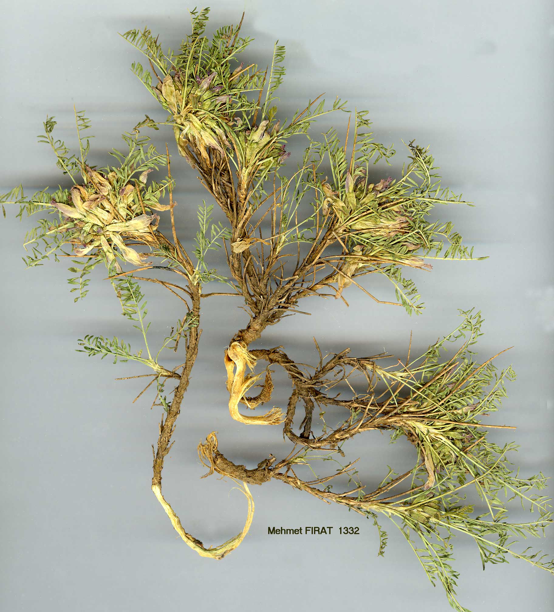 | A. rechingeri Širj. in Ann. Nat. Hofmus. Wien 49:269 (1939). Dwarf shrub growing up to 30 cm. Leaves 2-5 cm; rachis spiny; leaflets 4-8 mm, narrowly elliptic, obtuse, sometimes mucronulate, glabrous, 9-11-paired; stipules c. 6 mm, triangular-lanceolate, glabrous, united to halfway. Inflorescence with 5-6 shortly pedicellate flowers. Bracts 2-3 mm, lanceolate, membranous. Brac-teoles absent. Calyx 8-10 mm, tubular, with very sparse black adpressed simple hairs; teeth 2-3 mm, narrowly triangular. Corolla white or pinkish; standard 20-23 mm. Ovary hairy. Legume unknown. Fl. 6-7. Rocky slopes, 2340-3000 m. Type: [Turkey B9 Van] Kurdistan: Östl. Ausläufer der Kette des Agherov dag, im Süden von der Ebene von Pesandasht, 2900 m, 24 Juni 1936, Frödin 77 (UPS!). S.E. Anatolia. B9 Van: d. Şatak, Kavuşşahap Da., 2750 m, D. 23075! Bitlis Van: 10 km SE of Pelli, 2340 m, D. 22582! C10 Hakkari: Sat Da., NW of Sat G., 2900-3000 m, D. 45703! Endemic; Ir.-Tur. element. Near to A. icmadophilus. |