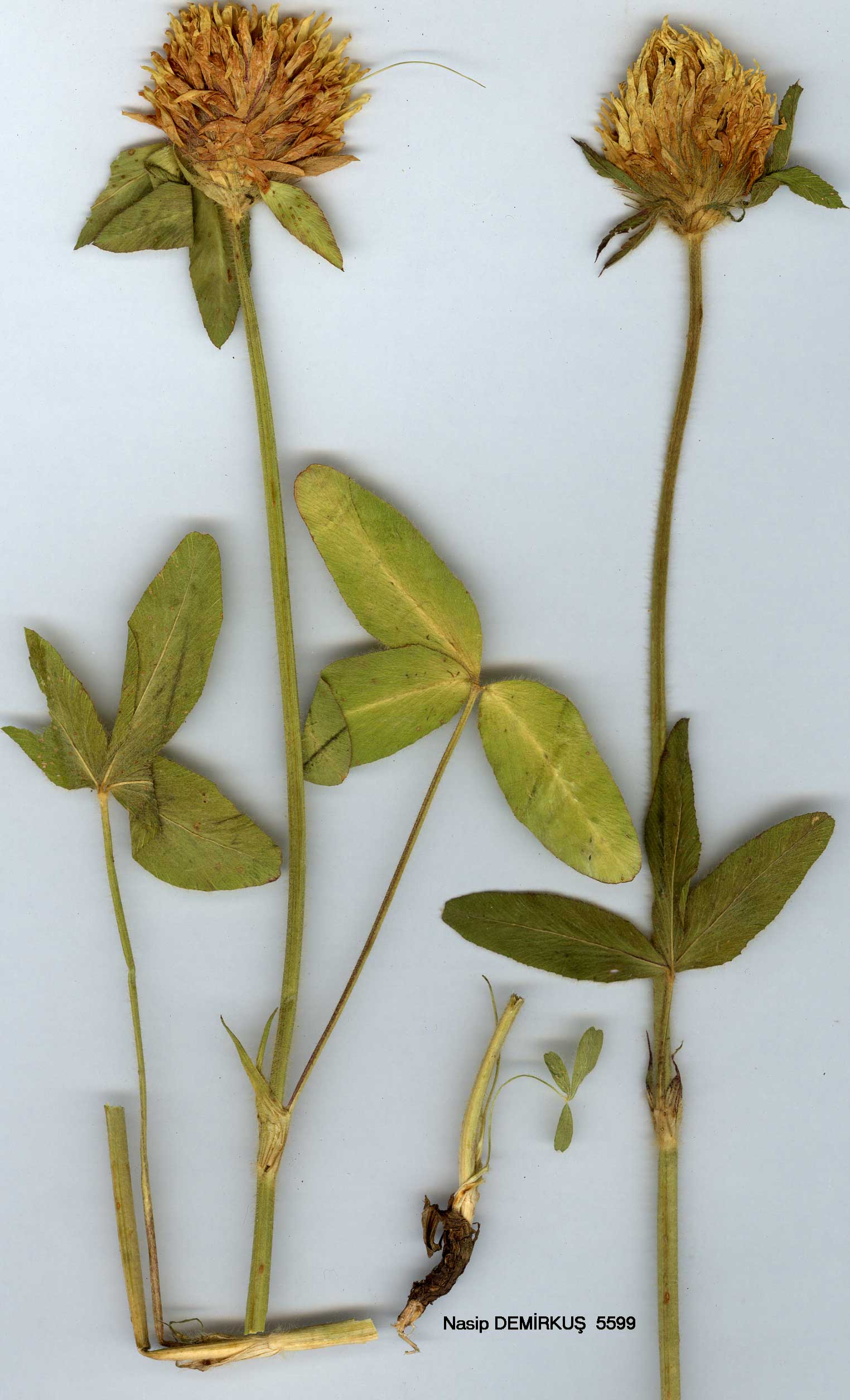 | T. trichocephalum Bieb., Fl. Taur.-Cauc. 2:212 (1808). Syn: T. tricho-cephalum Bieb. var. macrophyllum Hossain & var. lonchophyllum Hossain in Notes R.B.G. Edinb. 23:407 (1961). Ic: Gib. & Belli in Mem. Accad. Sci. Torino ser. 2(39):426, t. 9, f. 3 (1889). Figure 6, p. 417. Map 87, p. 423. Erect or ascending perennial, 30-70 cm. Stipules ovate-oblong, free portion gradually tapering into a subula. Leaflets of the lower leaves 3-4 cm, ovate to elliptic, retuse, those of the upper leaves elliptic to lanceolate. Inflorescence ovoid, 1.5-2 cm wide, sessile. Calyx cylindrical-camDanulate, 10-nerved, villous, closed by a 2-lipped callosity, the teeth unequal, lanceolate-subulate, blunt. Corolla cream, 20-25 mm, c. 2 x as long as the calyx. Fl. 5-7. Meadows, woods and swampy soil, 1670-2600 m. Type: [Georgia] in Caucasi iberici alpestribus, 1800 m, Mussin-Puschkin (LE, photo!). N. & E. Anatolia. A7 Trabzon: between Trabzon and Meryemana, 1700 m, Alpay (ANKO 2604)! A9 Erzurum: 22 km from Horasan to Karaurgan, 2000 m, D. 29507! Kars: 10 km from Sarikamiş to Karakurt, 2050 m, D. 46546! B8 Muş: between Molla-Ali and Koniso-Ipo, 7 vi 1916, Schischkin; Erzurum: W of Iliça, 6 viii 1967, Rossi B9 Erzurum: E of pass between Ağri and Horasan, 2250 m, Lomond 2578! Ağri: 2 km S W of Hamur, 1670 m, D. 44021! Van: 30 km from Başkale to Hoşap, S of pass, 2600 m, D. 45922! B10 Ağri: Doğubayazit to Iğdir, 2050 m, M. Zohary & Plitmann 2265-74! Caucasia, W. Iran. From the description it appears that T. parantzemae Azn., described from B9 Van: Baghlar, Tchitouny 51, is no more than a large-flowered form of T. trichocephalum. |