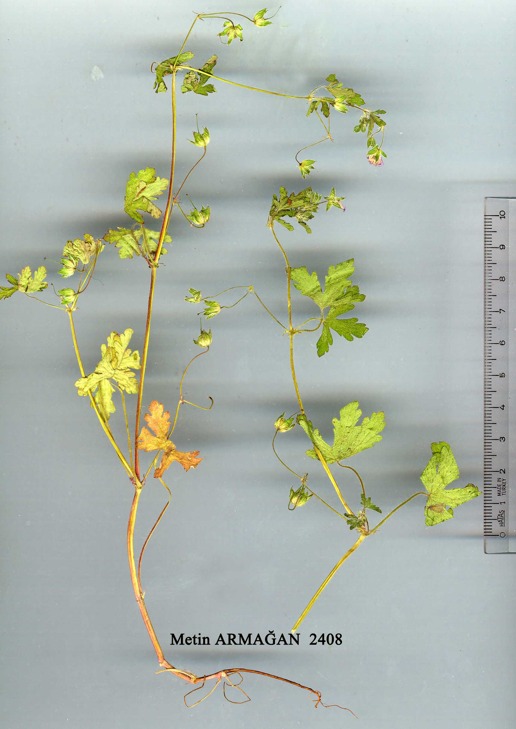 Widely branched annual, 20-60 cm, bearing long eglandular and short glandular hairs. Upper leaves opposite, palmatifid to c. 4/5; segments rhombic-oblong, obtusely and shortly pinnatifid or lobed. Pedicels shortly glandular-pubescent, ± deflexed in fruit. Sepals 3-6.5 mm, nerves stiffly hairy; awn 0.5-0.75 mm. Petals c. 5-8 mm, emarginate, bright pink or white, Mericarps pubescent, trans- versely ridged above, beakless when ripe. Seeds smooth. Fl. 5-6. Rock ledges, grassy slopes, 1400-1900 m. Type: Hungaria, Winter!. A7 Giresun: E of Tamdere, 1620-1700 m, Hub.-Mor. 15003. A8 Rize: Cimil, 1900 m, Bal. A9 Kars: Gölebert to Hacuvan (Ardahan to Kars), 1850 m, D. 30457! B5 Yozgat: Sorgun to Çekerek, 11 miles from Sorgun, Coode & Jones 1624! C2 Antalya: Elmali, Bourgeau. C2/3 Antalya: Elajik, Forbes 169! C5Içel: N side of Cilician Gates, W of Ankara-Adana road, 1400 m, It. Leyd. 1959: 1244! S. & C. Europe, Crimea, Caucasia, W. Siberia, N. Iraq, Syrian Desert (Djebel Sindjar), N.W. & W. Iran, Afghanistan. |