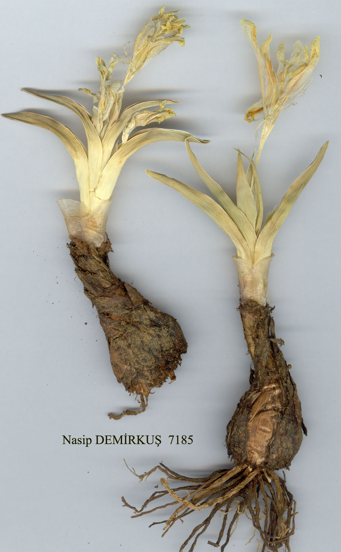 I. caucasica Hoffm. in Cornm. Soc. Phys. Mosc. 1:40(1808). Plant (8-)10-i8 cm. Bulb 1.5-2.5 cm diam. Leaves (4-)5-7, well developed at anthesis, 5-Î5 cm, (0.5-)0.8-2 cm broad at base, lanceolate, falcate, green above, markedly greyish-green below; margin white, smooth to ciliate. Stem concealed by leaves, or with intemodes just visible at anthesis, usually elongating later with clearly visible intemodes. Bract and bracteole ± equal, ventriccse, green, membranous, acuminate or long-tapering. Flowers 1-4, greenish-yellow, rarely a paie dirty bluish-green with a bluish blotch on falls; perianth tube 34-(-4.7) cm; falls (3-)3.54 cm, daw winged, (l.l-)1.5-2.5 x 1-1.8 cm, lamina elliptic, (0.9-)l.1-2 x 1-1.6 cm, rounded: crest darker yellow or orange, crenuiate; standards patent or re flexed, linear, oblanceolate to ± 3-lobed, i.3-2.5 x 0.2-0.8 cm;style branches 2.3-3.5 cm. Capsule c. 3 x 1 cm, ellipsoid; seeds c. 3 rnm. 1. Leaf margins and/or veins on underside distinctly ciliate or scabrid, especially towards apex or leaf subsp. caucasica 1. Leaf margin and/or veins on underside smooth subsp. turcica subsp. turcica B. Mathew in The Garden 106:478 (1981). Map 59. Fl. 4-6. Bare stony slopes, scree and upland steppe, 1200-3500 m. Type: Turkey B9 Agri: Tahir pass, c. 2500 m, 5 vi 1973, Grey-Wilson & Phillips 50 (holo.K!). Inner Anatolia. A7 Gümüşane: Gümüşine, 1400 m, Stainton 8311! A8 Erzurum: 40 km from ispir to Erzurum, 2150 m, Güner 1541! A9 Kars: Karaurgan to Sarikamiş, Yağmurlu Da., 2200 m, D. 29468! B4 Ankara: 78 km from Ankara to Kayseri, 1500 m, Balls 229! B5 Nevşehir: Göreme, 1300 m, Furse 7004! B6 Yozgat: Ak dağın ad eni to Büyük Nalbant Da., 2000 m, Coode & Jones 2078! B7 Sivas: Divriği, T. Baytop (İSTE 12835)! B8 Muş: S. of Muş, Haçreş Da., Kurtik Da., 2750 m, Watson et al. 2838! B9 Ağri: Hamur, 1750 m, Baron 2158! B10 Kars: N.E. slope of Ağri Da., nr Serdar Bulak, 2150 m, D. 43722! C10 Hakkari: Mor Da., Watson et al. 3006! N.E. Iraq. Ir.-Tur. element. /. atropatana Grossh., described from 'Nachi-tschevan, Oltu and Kaghyzman' appears to be conspecific with/, caucasica. It is said to have a sinus separating the lamina and claw of the falls, but this condition is also possible in the variable /. caucasica. Type material has not been seen and it is impossible to assign it to one or other of the subspecies of /. caucasica. The flower colour is usually greenish yellow but the falls of Balls 229 and Mathew & Tomlinson 4245 are dirty bluish-green with a darker blotch on the lamina. It is possible that they are hybrids with /. persica or /. galatica. Distribution of species: N.E. Iraq, Caucasia. |