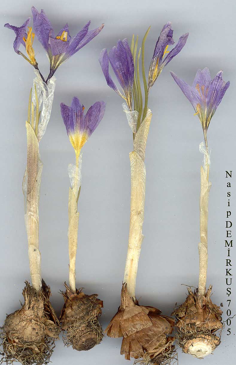 | C. biflorus Miller, Gard. Diet. ed. 8, no. 4 (1768). Corm tunic membranous or coriaceous with entire or toothed rings at base. Leaves (3-)4-9, synanthous, 0.5-3.5 mm broad. Prophyll absent. Bracteole present, subequal to or much narrower than bract. Throat of perianth pale to deep yellow, glabrous or finely papillose; segments 1.7-3.5 xO.5-1.3 cm, subacute, obtuse or rounded, white, lilac or blue, exterior sometimes prominently striped, veined, speckled or stained with purple, dark blue or grey. Filaments 3-7 mm, white or yellow, glabrous or finely papillose; anthers (0.8-)l-1.4 cm, yellow or blackish, sometimes yellow with blackish basal lobes, sometimes yellow with a greyish or blackish connective. Style dividing into 3 yellow to reddish-orange slender or expanded branches. 2n =8,10,12,14,16,18, 20, 22. Fl. 2-6f-7). Open rocky slopes, scrub, alpine turf, sparse coniferous woods, 200-3000 m. 1. Leaves with no prominent ribs in the grooves on lower surface; flowers white, usually with conspicuous purple or brownish stripes outside;anthers yellow (Istanbul area, Rodhos) a. subsp. biflorus 1. Leaves with at least one prominent rib in each of the grooves on lower surface; flowers white, lilac or blue, with or without stripes; anthers yellow, greyish or blackish-maroon 2. Flowers lilac-blue to blue usually without very conspicuous stripes outside, sometimes stained darker at base of perianth segments; anthers always yellow; corm tunics usually membranous 3. Leaves 4-9, 1.5-3.5 mm broad; flowers pale to mid lilac; bracts silvery-membranous (S., C, N, & N.E. Anatolia) j. subsp. tauri 3. Leaves 3-4{-5), not more than 1 mm broad; flowers usually deep blue-violet; bracts drying brownish or reddish (N.W. Anatolia) i. subsp. pulchricolor 2. Flowers white or blue, usually strongly striped, but sometimes speckled, outside; anthers yellow or blackish-maroon; 4. Flowers with one central violet stripe on each outer perianth segment; sheathing leaves and bracts drying brownish; anthers yellow (Artvin area) h. subsp. artvinensis 4. Flowers with at least 3 dark stripes on exterior of outer perianth segments, or finely dark-speckled, rarely 1-striped but if so then sheathing leaves and bracts silvery-white; anthers yellow or blackish-maroon 5. Leaves 2-3(-4), 1.5-2 mm broad; anthers blackish-maroon (S.W. Anatolia) . b. subsp. crewei 5. Leaves (3-}4-8, 0.5-l(-1.5) mm broad; anthers yellow or blackish-maroon 6. Style branches usually densely papillose; anthers blackish-maroon with long slender basal lobes (W. Anatolia, Islands) c. sbsp. nubigena 6. Style branches usually glabrous but sometimes ose; anthers yellow or blackish-maroon with sfeort basal lobes 7. Flowers finely speckled outside; anthere yellow{$. Anatolia) e. subsp.. punctatus 7. Flowers markedly striped outside, anthers blackish-maroon or yellow; if flowers somewhat speckled outside then anthers with agrey-ish connective 8. Anthers blackish before dehiscence; leaves {4-).5-8; flowers clove- scented (S.E. Anatolia) f. subsp. pseudonubigena 8, Anthers yellow but sometimes withagreyish conaective;leaves 3-6 (-7); flowers with a sweet (honey) scent 9. Leaves usually 3-4; anthers always yellow with apale connective; filaments usually 2-4 mm, often somewhat flattened (Turkey-in-Europe) g. subsp, adamii 9. Leaves usually 4-7; anthers yellow but often with agreyisii connective; filaments 4-7 mm, filiform (S.W. & S. Anatolia) A. subsp. issauricus subsp. tauri (Maw) Mathew, The Crocus .85 (1982). Syn: C. tauri Maw in Card. Chron. 16:749 (I881). Ic: Maw, Monogr. Crocus t. 61 (3886), as C. tauri; Mathew, Dwarf Bulbs t 23 (1973), as C. biflorus;Rix & Phillips, Bulb Book 23(1981), as C. biflorus. 2n - 20, 22. Type: [Turkey C5 Içel near the Cilician Gates ("ad Portas Cilicianas"} of the Taurus, Aucher 2654 (hole. K!). S. & Inner Anatolia. A7 Gumüşane: Kaldirim Da., Sint. 1894:541! A8 Gümüşane: Kop Da. col, 2700 m. Furse & Synge 35! A9 Kars: Sarikamiş, Iznos çayiri,E.Czhatay (ISTE 19713)1 B5 Kayseri: Bakir Da,,2000m,fethew & Tomlinson 4100 (2n = 20)! B6 Malatya: 35 krn S.£. of Darende, 1800 m, Leep & Pasche 72/20 (2n = 20)! B7 Sivas: Refahiye «o Zara, Leep A Pasche 72/60 (2n = 20)! B8 Erzurum: 53 km N, of Hinis, Marais 1559! 89 Ağri: Tahix Da., Rix 9 (2n = 22)! C5 içel: Cilkiaa Gates (GüIek Boğazi), Aucher 2128! C6 Maraş: Akher (Ahir) Da., 1700 m, Bails 9181! C10 Hakkari: d. Yüksekova, Esendere, 1700-2150 m.Güner 1660! ?Soviet Armenia. Ir.-Tur. element. Distribution of species: Italy, Balkans, Crimea, Transcaucasia,N.Iraq,N., N.W. & W. Iran. |