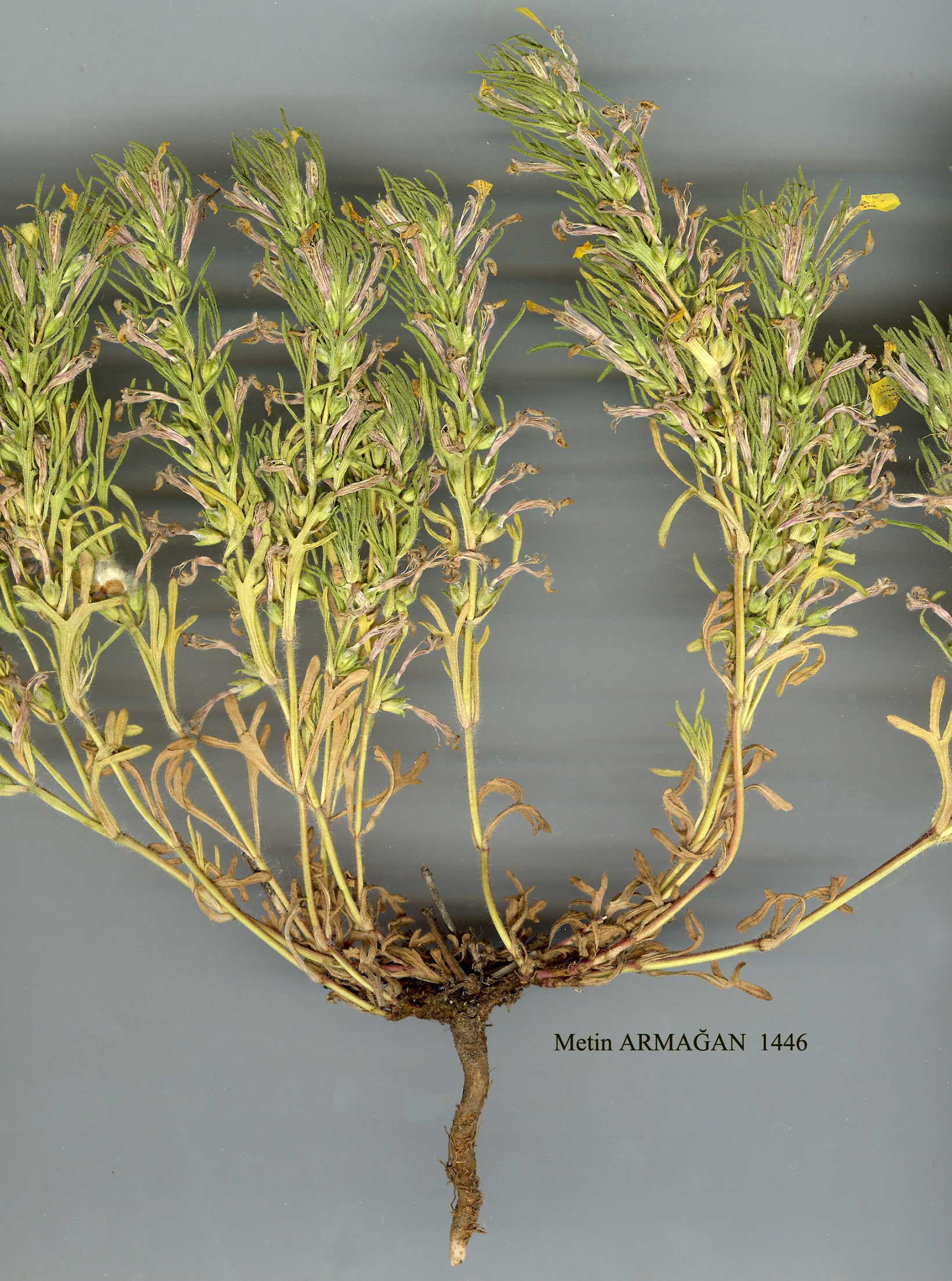 A. chamaepitys (L.) Schreber, PL Vert. Unilab. 24 (1773). Davis in Notes R.B.G. Edinb. 38:24-32 (1980, with illustrations of cauline and floral leaves of all subspecies). Syn: Teucrium chamaepitys L., Sp. PL 562 (1753). Perennial, biennial or annual herbs, very variable. Stems prostrate or ascending, variously hairy or glabrous. Cauline leaves cuneate to cuneate-oblong, shortly 3-lobed to deeply 3(-5)-partite, hirsute, villous, lanate or sub-glabrous; floral leaves usually somewhat more deeply divided. Verticillasters 2-flowered. Calyx 4-6 mm, teeth 0.5-l(-2) x tube. Corolla yellow (sometimes drying pinkish), 8-30 mm, upper lip short and emarginate, middle lobe of lower lip bilobed. Stamens exserted beyond reduced upper lip. Nutlets 2.5-4 mm, transversely rugulose, often foveolate towards apex. Calcicole. 1. Stems glabrous, usually purple; cauline leaves broadly oblong and often sheathing below the linear lobes; inflorescence usually a terminal panicle; corolla (18-)20-25 mm b. subsp. laevigata 1. Stems hairy all round or at least on 2 opposite sides, usually green; cauline leaves not broadened out and ± sheathing below the lobes; inflorescence usually simple ; corolla 8-30 mm 2. Dwarf alpine plants (usually on scree) with subterranean caudiculi and short, densely leafy shoots;lower floral leaves obtusely lobed to 1/3-1/2, shortly villous;corolla 18-22 mm d. subsp. glareosa 2. Plants not as above 3. Middle lobe of lower floral leaves linear, 6-many times longer than broad, as long as or longer than attenuate basal portion; stems spread-ing-hirsute, or shortly hairy only on 2 opposite sides ;corolla 16-23 mm a. subsp. chia 4. Stems hirsute with long stiff patent hairs on all sides var. chia 4. Stems glabrous on 2 opposite sides, retrorse-puberulent on the other two sides var. ciliata 3. Middle lobe of lower floral leaves broadly ovate to linear-oblong, less than 6 x longer than broad, shorter than to as long as narrowed basal portion; stems usually woolly or sometimes pubescent-canescent all round; corolla 8-25(-30) mm 5. Lower floral leaves divided to halfway into linear-oblong lobes; corolla 15-20 mm 6. Prostrate plant of stony slopes or disturbed ground; flowering stems sparsely to densely villous, usually branched; basal leaves (when present) linear-oblanceolate, remotely crenate-dentate c. subsp. palaestina 6. Plant of rock crevices; flowering stems lanate-villous, ± simple ;basal leaves (when present) narrowly obovate, subentire to crenate e. subsp. euphratica 5. Lower floral leaves divided to less than halfway; corolla 8-25(-30) mm 7. Corolla 8-11 mm, usually drying pinkish; lower floral leaves only 8-14 mm, usually divided to 1/4 or less into short rounded to ovate-oblong lobes h. subsp. cypria 7. Corolla 12-25(-30) mm, remaining yellow on drying; lower floral leaves 5-27 mm, divided to 1/3 to nearly halfway 8. Inflorescence columnar, the densely imbricated floral leaves having acute oblong-lanceolate lobes;corolla 12-14 mm j. subsp. rechingeri 8. Inflorescence not as above; leaf lobes obtuse; corolla 14-25(-30) mm 9. Cauline and lower floral leaves 5-12 mm, cuneate-oblong, 3-fid to 1/4-1/2; plant canescent with short slender dense subadpressed hairs;corolla 14-20(-24) mm i. subsp. mardinensis 9. Cauline and lower floral leaves 10-27 mm, cuneate to obtriang-ular, 3(-5)-fid to 1/3; plant lanate or patent-pilose, more robust; corolla 15-25 mm 10. Stems ± densely lanate; floral leaves lanate and greyish, cuneate or oblong-cuneate, divided into ovate to oblong lobes f. subsp. mesogitana 10. Stems patent-pilose, with many subsessile glands visible; floral leaves pilose, greenish, conspicuously glandular, broadly cuneate to obtriangular, divided into broader lobes g. subsp. cuneatifolia a. subsp. chia (Schreber) Arcangeli, Comp. Fl. Ital. 560 (1882). var. chia. Syn: Ajuga chia Schreber, PL Vert. Unilab. 25 (1773)! Ic: Sibth. & Sm., Fl. Graeca 6: t. 524 (1827); Fl. URSS 20: t. 1 f. 2 (1954), as A. chia. Fl. 4-7. Stony slopes, steppe, vineyards, fallow fields, waste and gravelly ground, s.I.-2000 m. Type: [Greece] in insula Chio (Khios), Tournefort (holo. P-Tourn. 1509, photo! iso. BM!). Widespread (less common in N., rare in Mesopotamia). A1(E) Kirklareli: Istranca Da., Velika to Kirklareli, Bauer et al. 2450! A1(A) Çanakkale: Erenköy, Sint. 1883:788! A2(E) Istanbul:: Mecresande by Makriköy, v 1918, Selinka! A2(A) Istanbul: Kartal, 1897, Azn.! A3 Bolu.: Uluhan road, 700 m, Akman 9592! A4 Kastamonu: Küre-Nahas (Küre) nr Tschuka-Chan, Sint. 1892:3748! A5 Çorum: c. 34 km from Çorum to Işkilip, 800 m, Coode & Jones 1711! A6 Samsun: Mağmur Da., 800 m, Tobey 216! A7 Gümüşane; Kelkit, 1600 m, Stainton 8432! A8 Çoruh: Borçka, 300 m, Stainton 8258! Bl Izmir: nr ,Tvaysen . loot ol Argaeus (Erciyas Da.), 1525 m, Kotschy 1859: Suppl. 217! B7 Elazig: 16 km from Elazig to Kale; 1300 m; D, 2§?2}J 39 Van; Uimit to Gev^, 2000m, D. 22652! CI Aydin: 12 km from Soke to Ephesus (Efes), Dudley (D. 34924)! C2 Mugla: W. of Mugla, 660 m, Lambert & Thorp 523! C3 Antalya: d. Kemer, Camoluk-Akyarlar area, 20 m, Penmen & Guner 4594! C4 Konya: Kiiciik Koy, 980 m, Helbaek 2446! C5 Igel: Ercel to Basnalar, Uslu 1159! C6 Hatay: Dortyol, Rabat, s.l., Coode & Jones 467! C9 Siirt: above Sirnak, 1400-1500 m, D. 42544! Is: Khios, 3 km W. of Emborios, 50 m, Ludtke491! Samos, mt. Kerki, 400-800 m, Runem. & Snog. 19678! Kos, Simpestros, nr Kastela, Buttler 18106! Kalimnos, Runem. & Persson 22258! Rodhos, Kamiros, B. & V. Burbidge 157! Kemalpaşa, Alava et al. 4898! B2 Kütahya : Gediz, 850 m, D. 36974! B3 Eskişehir: Türkmen Da., Bayat Köyü, Ekim 2416! B4 Ankara: nr ,Tvaysen . loot ol Argaeus (Erciyas Da.), 1525 m, Kotschy 1859: Suppl. 217! B7 Elazig: 16 km from Elazig to Kale; 1300 m; D, 2§?2}J 39 Van; Uimit to Gev^, 2000m, D. 22652! CI Aydin: 12 km from Soke to Ephesus (Efes), Dudley (D. 34924)! C2 Mugla: W. of Mugla, 660 m, Lambert & Thorp 523! C3 Antalya: d. Kemer, Camoluk-Akyarlar area, 20 m, Penmen &