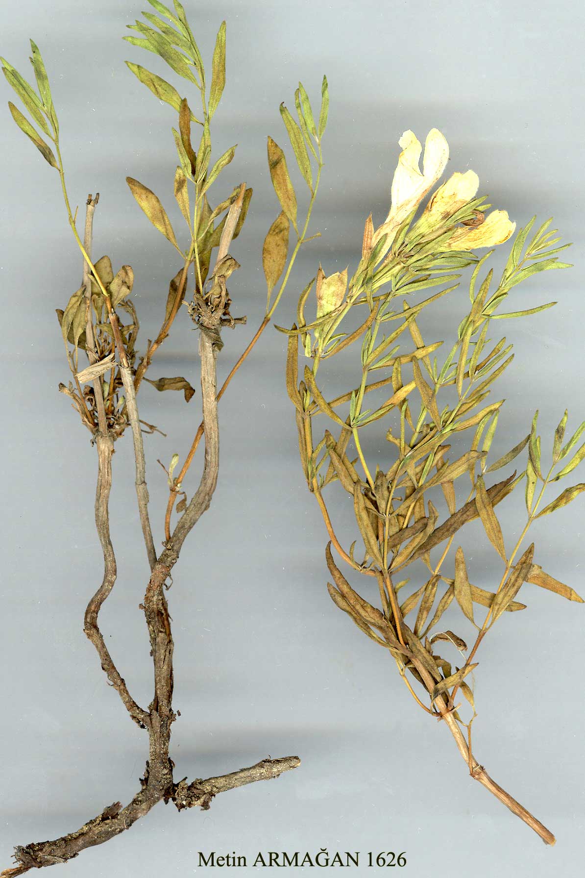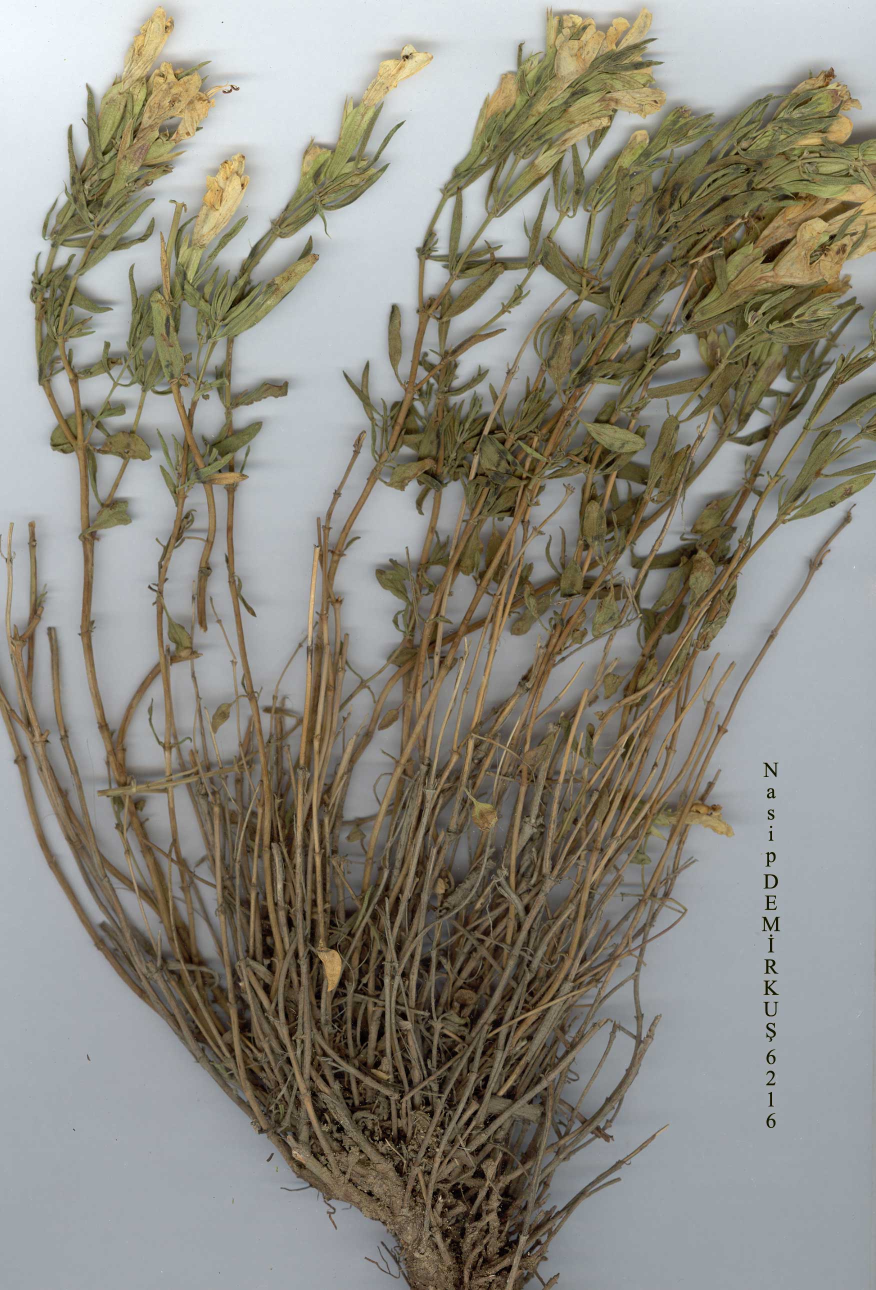 D. multicaule Bentham in Ann. Sci. Nat. ser. 2, 6:47 (1836). Stems numerous, arising from a thick branched woody stock, densely puberulent, simple or branched, 11-32 cm. Heterophyllous; lowest cauline leaves petiolate, lamina ovate, crenate, to 12 x 9 mm, marcescent; median linear-oblong, 15-20(-35) x 3-7 mm, entire, tapering at base to short petiole; intermediate leaves transitional. Flowers in 2-4-flowered verticillasters forming a lax oblong terminal inflorescence. Bracteoles entire, or aristate-dentate, apex mucronate to aristate. Calyx 15-17 mm, upper lip with 3 shallow teeth. Corolla white, cream or straw-coloured, 23-31 mm, pubescent outside. 1. Bracteoles entire var. multicaule 1. Bracteoles aristate-dentate var. setigerum var. setigerum (Boiss. & Huet) Edmondson in Notes R.B.G. Edinb. 38:32 (1980). Syn: D. setigerum Boiss. & Huet in Boiss., Diagn. ser. 2(4): 21 (1859)! Stachys odoratissima Nâb. in Publ. Fac. Sci. Univ. Masaryk Brno 70:65, t. 20 (1925). Fl. 6-8. Steppe, granite, limestone & sandstone slopes & screes, 915-3300 m. Type: [Turkey A/B8 Erzurum) 'in cultis circa Erzeroum Armeniae', vi [1853], Huet du Pavilion (iso. BM! K! W!). However, the type specimens are labelled 'prope Ispir'. E. Anatolia. 'Armenia', Calvert & Zohrab! A8/9 Erzurum: nr Oltu, Sos-novsky. B9 Van: 26 km from Başkale to Hoşap, 2400 m, D. 45880! C9/10 Hakkari: Cilo Da., Sopa Durik, 3300 m, Nâbelek 1564 (type of Stachys odoratissima). Endemic. Ir.-Tur. element. |