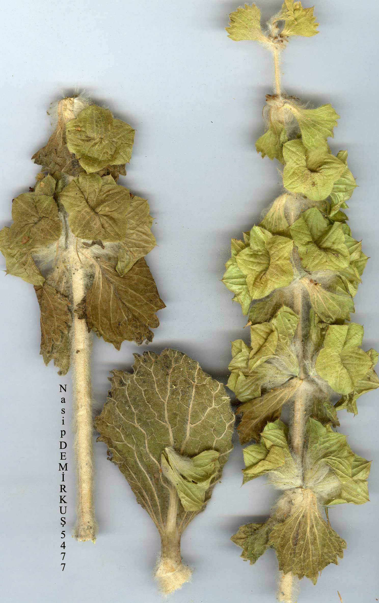 E. moluccelloides Bunge in Ledeb., Fl. Alt. 2:415 (1830). Syn: E. macrophylla Montbret & Aucher ex Bentham in Ann. Sci. Nat. ser. 2, 6:54 (1836)! E, pyramidalis Jaub. & Spach, Ill. P1. Or. 5:69, t. 462 (1855); E. molucel-loides Bunge subsp. macrophylla (Montbret & Aucher ex Bentham) Takht. in Takht. & Fedorov, Fl. Erevana ed. 2:256, t. 461 (1972)! Ic: Boul., Fl. Lib. Syr. t. 338 f. 7 (1930), as E. macrophylla; Fl. Reipub. Pop. Sin. 65(2): t. 81, f. 6-9(1977). Stems erect, usually branched twice in upper 1/2, robust, 27-40 cm. Basal leaves orbicular to broadly elliptic, petiolate, lamina 6-18 x 5-17 cm, coarsely crenate-dentate, veins impressed on upper surface, lower surface thickly lanate; cauline similar, sessile. Calyx broadly campanulate-rotate, sparsely pubescent, limb 2-2.5 cm diam. at anthesis, accrescent to 4 cm diam. in fruit, reticulate-veined, membranous. Corolla pale lemon-yellow with orange-yellow to buff-orange lower lip, 18-30 mm; hood pubescent to villous outside, whitish-bearded within; lower lip with triangular-cordate middle lobe and ovate-elliptic lateral lobes. Fl. 5-6. Steppe, limestone hills, shaly and igneous slopes, nr s.l.-2130 m. Type: [C. Asia] in arenosis et siccis desertis soongoro-kirghisici, C.A. Meyer (holo. LE). Inner Anatolia. A7 Gümüşane: Kelkit, 1000 m, Stainton 8426! A8 Gümü-şane: 'mt. Perquizé' nr Bayburt, 2 vii 1862, Bourgeau! B3 Eskişehir: 29 km E. of Sivrihisar, 800 m, Hub.-Mor. 14231! B4 Konya: Cihanbeyli to Konya, A. & T. Baytop (ISTE 6979)! B5 Kayseri: Incesu to Develi, 1050 m, Hub.-Mor. 10777! B6 Malatya: Gürün to Darende, 1525 m, D. 21868! B7 Tunceli: Munzur Da., Montbret 2238 (type of E. macrophylla)! B8 Erzurum: nr Erzurum, Aucher 5126! B9 Van: 24 km from Gürpinar to Hoşap, 2000 m, D. 44700! C5 Adana: d. Mersin, Çetik 22417! C6 Gaziantep: Soff Da. (Suf Da.), Haussknecht. C8 Mardin: 12 km from Mardin to Diyarbakır, 1000 m, D. 28720! C9 Hakkari: Zab gorge 2-3 km from Hakkari, 1400 m, D. 45462! Syrian Desert, Caucasia, N., N.W. & W. Iran, C. Asia to Mongolia. Ir.-Tur. element. The fruiting calyx is wind-dispersed. |