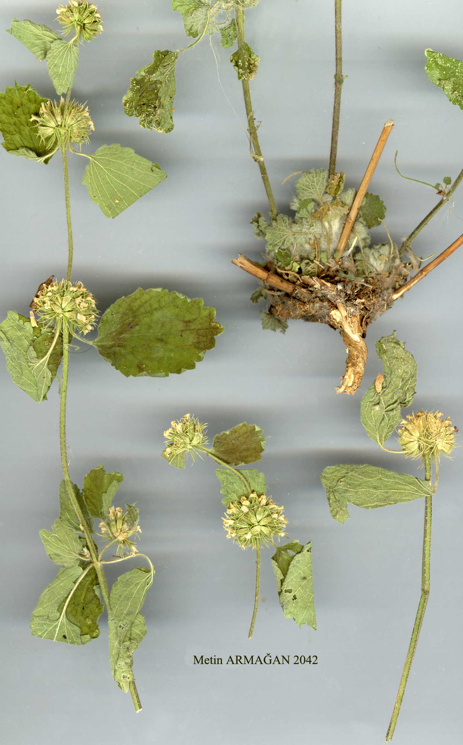 | M. vanense Hub.-Mor. in Bauhinia 6(2):287 (1979). Figure 7. Map 27. Erect perennial. Stems 50 cm or more, brownish with a dimorphic indumentum of longer and shorter simple hairs. Cauline leaves petiolate, ± orbicular or flabellate, irregularly and coarsely crenate, thinly pilose with simple hairs above and rather more densely so with large stellate hairs beneath. Ver-ticillasters borne on short axillary branches and terminating the main stem, crowded, several-flowered; bracteoles about as long as calyx tube. Calyx tube 4.5-5 mm, with stellate hairs; teeth 5 or rarely 6, somewhat unequal, 2-2.5 mm, straight, erect or slightly spreading, covered with stellate hairs for 1/2-2/3 of their length. Corolla yellowish-white, densely lanate with stellate hairs outside, upper lip glabrous inside. Fl. 7. Ravines, c. 1920 m. Type: Turkey B9 Van: Van — Hoşap, Durchbruchs-Schlucht des Micinger Flusses, 20 km östlich von Hasbaşi, 1920 m, 8 vi 1951, Huber-Morath 11711 (holo. Hb. Hub.-Mor.!), Ch. Simon (iso. Hb. BaslerBot. Ges.!). Endemic and known only from the type. Ir.-Tur. element. Closely related to M. vulcanicum, and, with the latter, very distinct from other species of Marrubium. |