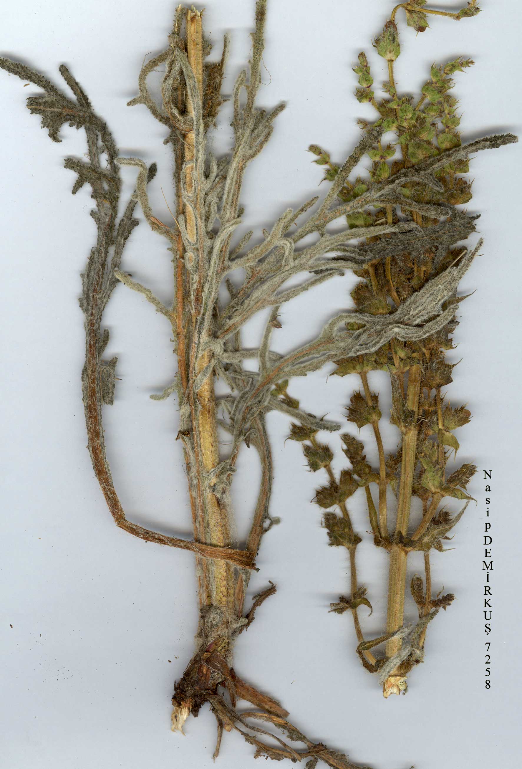 S. ceratophylla L., Sp. Pl. 27 (1753). Biennial herb, lemon-scented. Stems sturdy, 30-60 cm, glandular-villous, densely so above. Leaves mostly basal, pinnatifid, oblong in outline, with spreading linear segments, white-lanate when young, 12-25 x 4-8 cm, rachis winged; petiole subabsent. Inflorescence spreading paniculate, yellowish-green. Verticillasters 2-5-flowered, distant. Bracts ovate, cuspidate, c. 15 x 12 mm. Pedicels erecto-patent, 2-4 mm. Calyx ovate-campanulate, c. 12 mm, to c. 16 mm in fruit with diverging lips, glandular-villous; upper lip tridentate with cuspidate teeth. Corolla cream or sulphur, rarely with lilac upper lip, 15-20 mm; tube c. 4 mm, abruptly ventricose, squamulate; upper lip falcate. Stamens B. Nutlets spherical, c. 3.5 x 3 mm. 2n = 44. Fl. 4-6. Limestone, igneous and gypsum slopes, corn and fallow fields, waste ground, 300-2150 m. Described from 'Persia' (Hb. Linn. 42/47!). Widespread in Inner Anatolia. A4 Ankara: Keçiören, 1000 m, Markgraf 10509! A5 Kastamonu: Tosya, Sint. 1892:4287! A8 Erzurum: N.E. of Tor- turn (Grossheim 7: map 440). A9 Kars: 23 km from Kağizman to Karakurt, 1350 m, Rech. 57430! B3 Eskişehir: Sündiken Da., Ekim 645! B4 Ankara: Haymana to Sivrihisar, 800 m, Demiriz 2952! B5 Kayseri: Incesu to Develi, 1050 m, Hub.-Mor. 10742! B6 Malatya: E. of Darende, 1500 m, Watson 5563! B7 Diyarbakir: Ergani to Maden, 900 m, D. 28878! B8 Erzincan: Tercan to Aşkale, 1600 m, D. 29343! B9 Van: 20 km from Timar to Van, 1800 m, D. 44219! C2 Burdur: Tefenni to Burdur, 1100 m, Hub.-Mor. 5209! C3 Burdur: Burdur to Antalya, Hub,-Mor. 5210! C4 Içel: Mut to Büyük Eğri Da., 800 m, Coode & Jones 913! C5 Niğde: Niğde, 100 m, Siehe 1898:38! C6 Adiyaman: Malatya to Besni, 1000 m, Balls 2262! C7 Urfa: Urfa to Hilvan, 700 m, D. 28241! C8 Siirt: 5 km S. of Siirt, 700 m, D. 43214! C10 Hakkari: Zap river valley, Trelawny 1319! Palestine, Syrian Desert, Soviet Armenia, N. Iraq?, Iran, Afghanistan. Ir.-Tur. element. Oligomorphic and unmistakable. A specimen from B9 Van: Van to Degirmenköy, 1900 m, fallow fields, one plant, D. 44432! is an apparent hybrid between 5. ceratophylla and S. aethiopis. |