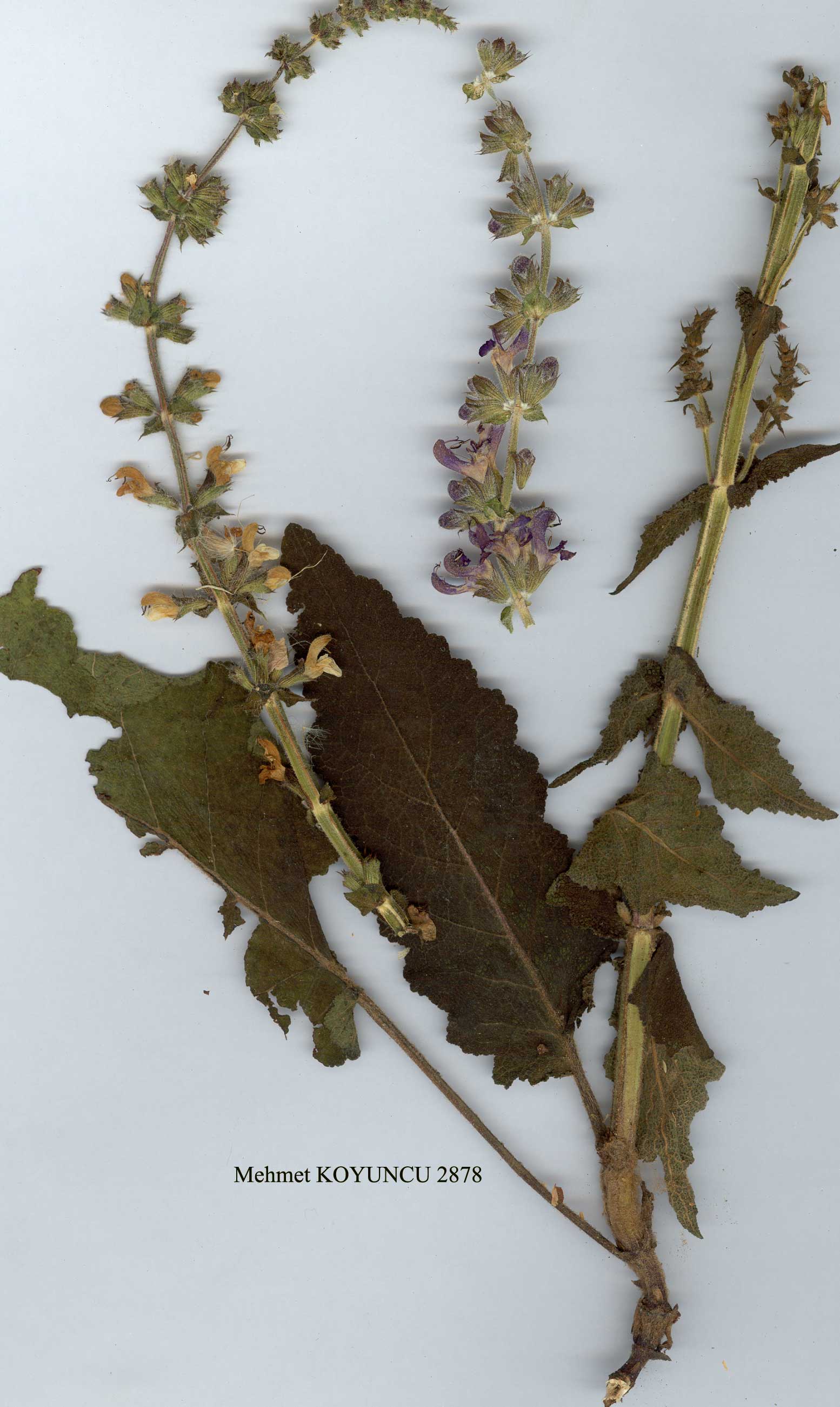 S. virgata Jacq., Hort. Vindob. 1:14, t. 37(1770). Syn: S. sibthorpii Sibth. & Sm., Fl. Graeca 1:17, t. 22 (1806);S. similata Hausskn. in Mitt. Thür. Bot. Ver. N.F. 11:36 (1897); 5. virgata Jacq. var. densiflora Náb. in Publ. Fac. Sci. Univ. Masaryk Brno 70:52, t. 15 f. 4 (1926);S. virgata Jacq. var. canovelutina Rech. fil. in Ann. Naturh. Mus. Wien 51:420 (1941). Ic: Sibth. & Sm., Fl. Graeca 1: t. 22 (1806), as S. sibthorpii. Perennial usually coarse herb. Stems erect, (10-)30-100 cm, much branched above or not, indumentum variable, pilose to tomentose, glandular or eglan-dular. Leaves simple, distributed over stem or rarely restricted to basal rosettes, ovate-oblong to broadly ovate, 5-30 x 2-15 cm, eglandular-pilose with numer-ous sessile glands, cordate, rugulose, erose, crenate, serrate to subentire; petiole 1-15 cm. Inflorescence a widely branched panicle with long ± slender second-ary branches; verticillasters 2-6-flowered, distant, rarely condensed. Bracts ovate-acuminate, 4-8 x 3.5-6 mm. Pedicels 1-2.5 mm. Calyx ± tubular cam-panulate, 6-10 mm, to 10-12 mm in fruit with a strongly recurved bisulcate upper lip, glandular or eglandular pilose. Corolla violet-blue to lilac, rarely white, 12-15 mm; tube 7-9 mm, ventricose, not squamulate; upper lip falcate. Stamens B. Nutlets rounded trigonous, ovoid, 2.5 x 2 mm. 2n = 16. Fl. 5-9. Scrub, woodland, meadows, fallow fields, roadsides, etc., s.1.-2300 m. Described from cultivated material; no type indicated. Throughout most of Turkey, Islands. A 1(E) Kirklareli: Saray to Vize, A. Baytop (ISTE 13175)! A1(A) Kocaeli: Karamürsel to Yalova, 50 m, Hub.-Mor. 17197! A2(E) Istanbul: Kilyos, Demiriz 260! A2(A) Istanbul: Kayişdağ, W. slopes, Demiriz 3849! A3 Bilecik: 2 km S.W. of Aktaş on road to Kayabeli, 480 m, Buttler & Erben 17991! A4 Kastamonu: Daday to Eflani, 1100 m, Coode & Yalt. (D. 38641)! A5 Sinop: Sinop, 5 m, Tobey 1033! A6 Tokat: Tokat to Artova, 750 m, Hub.-Mor. 13045! A7 Sivas: Suşehri to Zara, 1400 m, D. 32699! A8 Çoruh: above Artvin, 900 m, D. 29748! A9 Kars: Benliah-met to Kağizman, Kötek, 1500 m, D. 46668! Bl Izmir: Izmir to Manisa, N. of Bornova, 70 m, Hub.-Mor. 2506! B2 Kütahya: plain of Simav, 750 m, E. Anglia Exped. C2! B3 Eskişehir: 30 km from Eskişehir to Bursa, 860 m, Simon 69-184. B4 Ankara: Beynam, D. 13020! B5 Kırşehir: nr Kirşehir, Findlay 45! B6 Maraş: Elbistan to Gürün, 1200 m, Stn. & Hend. 5663! B7 Gümüşane: Erzincan to Kelkit, 2100 m, D. 31904! B8 Muş: Muş to Bingöl, 20 km W. of Muş, 1420 m, Hub.-Mor. 10760! B9 Bitlis: Corgih to Bitlis, 2280 m, Tong 212! C1 Aydin: 7 km N. of Kuşadasi, 27 v 1935, Reese! C2 Antalya: Elmali to Avlan G., Khan et al. 166! C3 Isparta: Barla, Khan et al. 349! C4 Konya: Konya to Çumra, Kücük Köy, 980 m, Helbaek 2624! C5 Adana: Kozan to Feke, 300 m, Hub.-Mor. 15318! C6 Hatay: Antakya to Cebeli Kasir, 12 km E. of Antakya, 350 m, Hub.-Mor. 11872! C9 Hakkari: Zap gorge, 3 km below Hakkari, 1400 m, D. 45469! Is: Lesvos, Sigri, Edmondson & McClintock 2643! Khios, Kampochora, Platt 361; Kos, nr Asphendia, Gathorne-Hardy 409b! Rodhos, mt. Smith, Senni.Crimea, Cyprus(?), Balkans, Italy, Caucasia, N. Iraq, Iran, Afghanistan, C. Asia. Probably an Ir.-Tur. element, penetrating into Medit. territories. Variable, particularly with regard to degree of branching, leaf shape and margin, and type and density of overall indumentum. Although no definite examples of hybrids with the related S. nemorosa and S. dichroantha have been recorded, it would be surprising if they do not exist in Turkey. |
